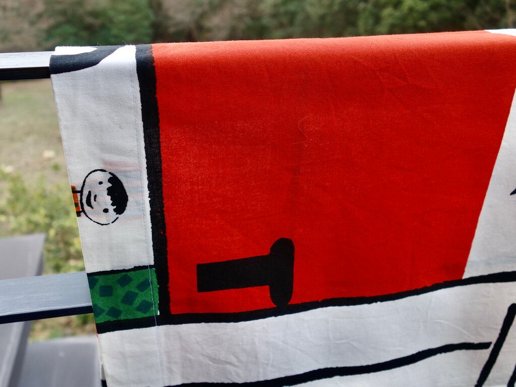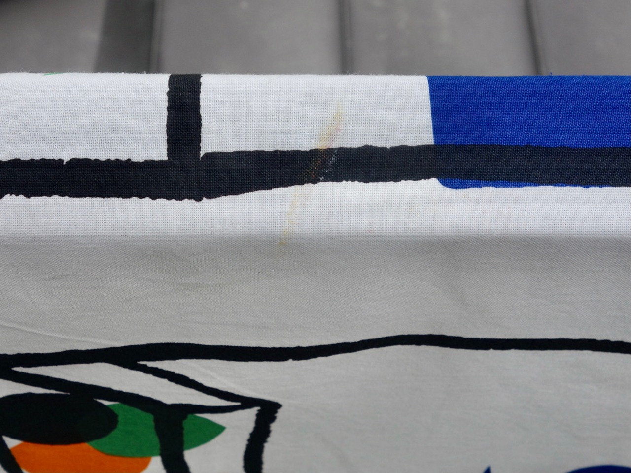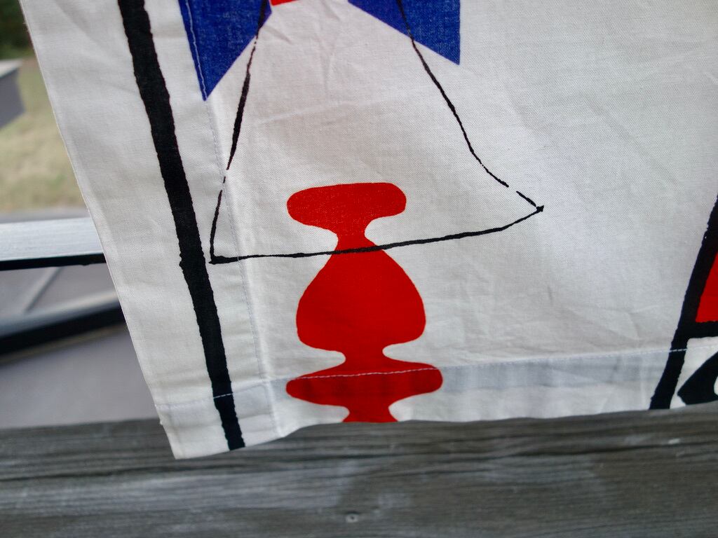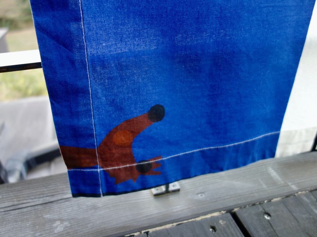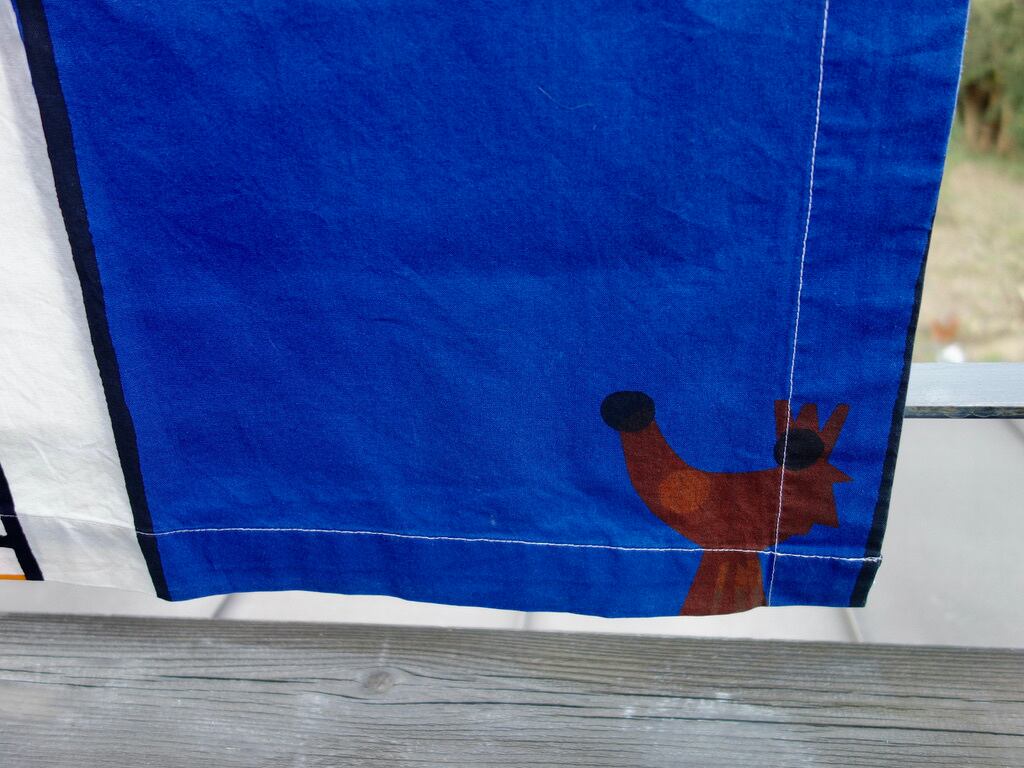 右端:約4.5 cm 程で折り返され縫われています。(MARIMEKKO などのロゴプリントが裏面に確認できます。)