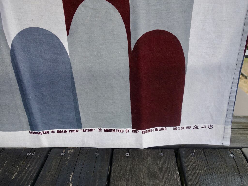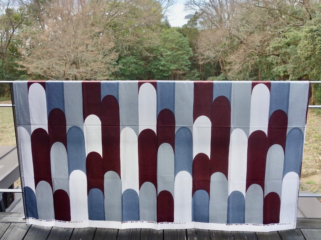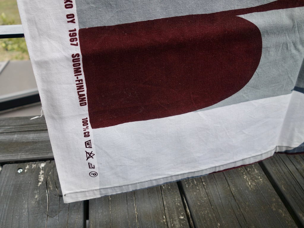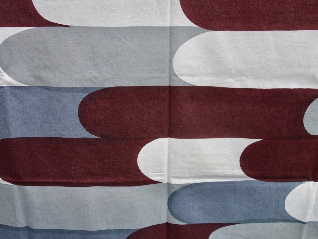 "RITARI" はフィンランド語で直訳すると「騎士」という意味を持ち、1967年 Maija Isola(マイヤ・イソラ)によって手掛けられたデザインです。騎士が持つサーベル(洋剣)が集まった様な、はたまた棒グラフの様な模様には発想の豊かさの様なものを感じます。こちらは白地に濃淡灰色、濃茶部分は見方によって紫が混じった様な茶色の色味で、白は地の色をそのまま活かしています。
