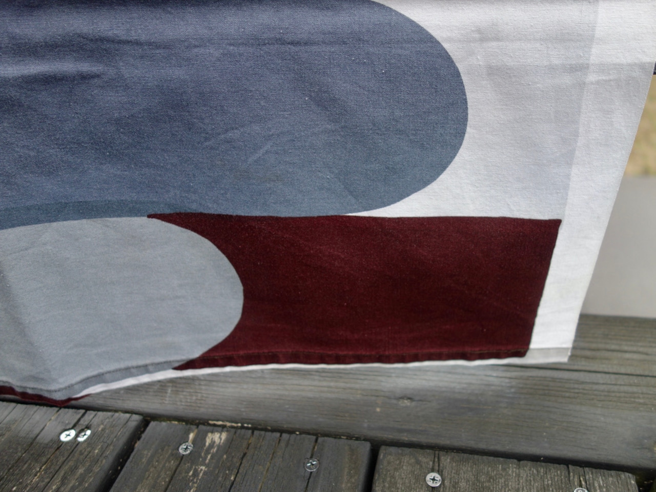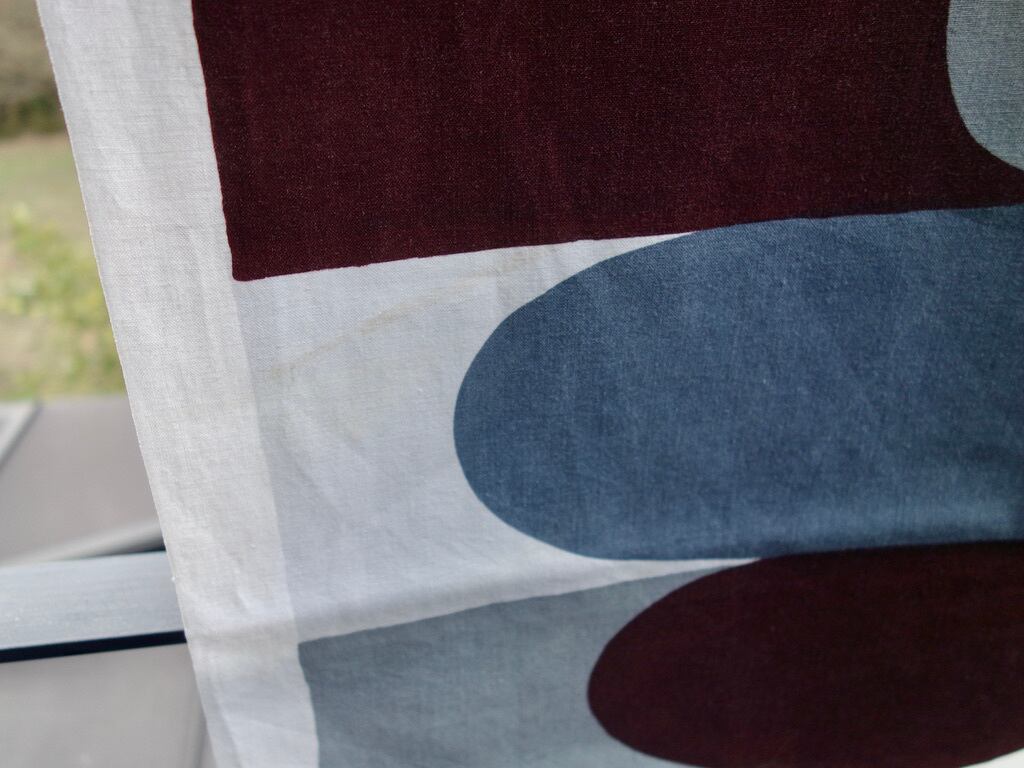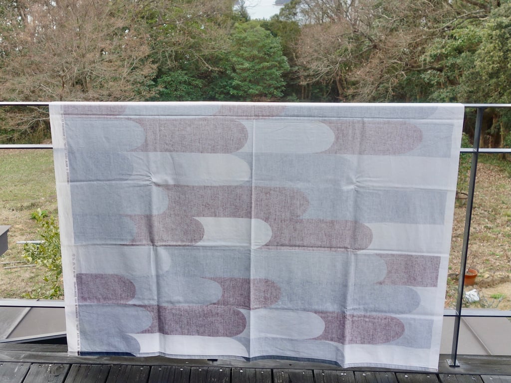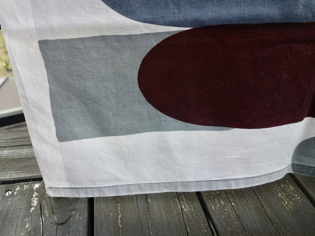 "RITARI" はフィンランド語で直訳すると「騎士」という意味を持ち、1967年 Maija Isola(マイヤ・イソラ)によって手掛けられたデザインです。騎士が持つサーベル(洋剣)が集まった様な、はたまた棒グラフの様な模様には発想の豊かさの様なものを感じます。こちらは白地に濃淡灰色、濃茶部分は見方によって紫が混じった様な茶色の色味で、白は地の色をそのまま活かしています。