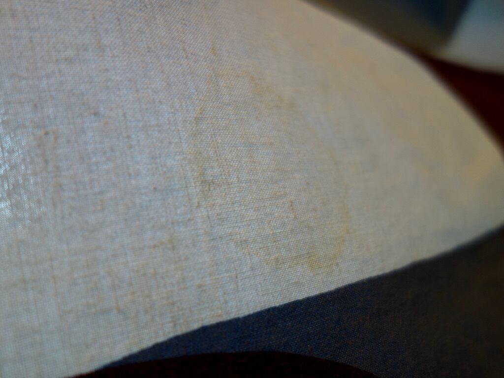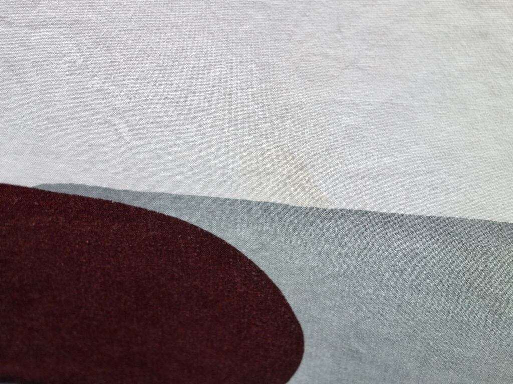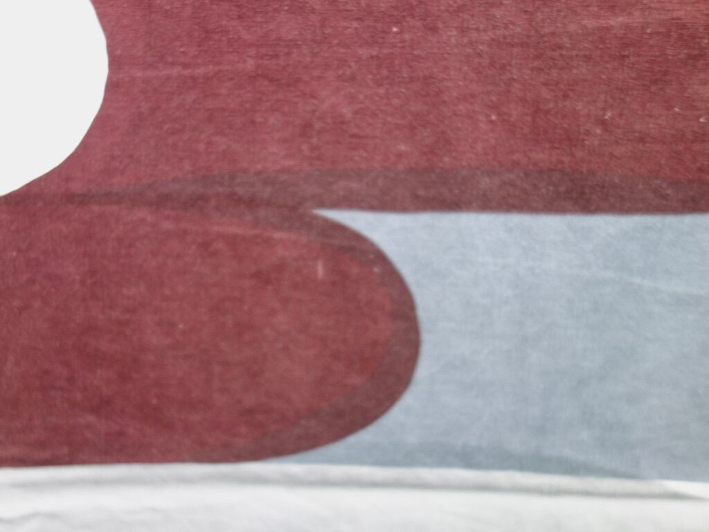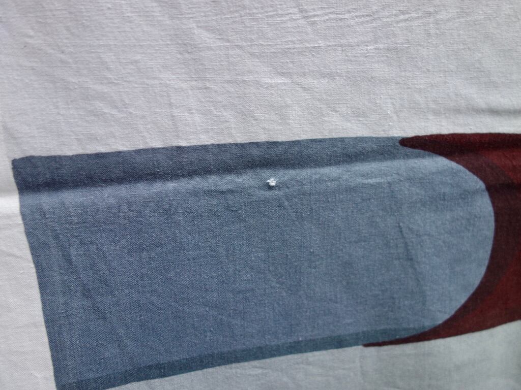 中央上部(白色エリア)の薄っすら見られる輪ジミ(画像5)、その他薄茶色の汚れやくすみ、中段下左側に小さなピンホール跡1つ(画像6)、微細な織りキズの様なスジ、細かな色飛びなど見られる箇所はありますが、いずれも目立つ感じの強い跡ではなく比較的綺麗な状態と言えます。