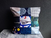marimekkoの人気の高い様々なパターンデザインを集め、手作業にて丁寧に仕上げられたパッチワークファブリックで作られているクッションカバーです。パッチワーク効果による豊かな表情とハンドメイドならではの温もりを感じていただける楽しい作品と言えます。こちらは青系をベースに仕立てられています。