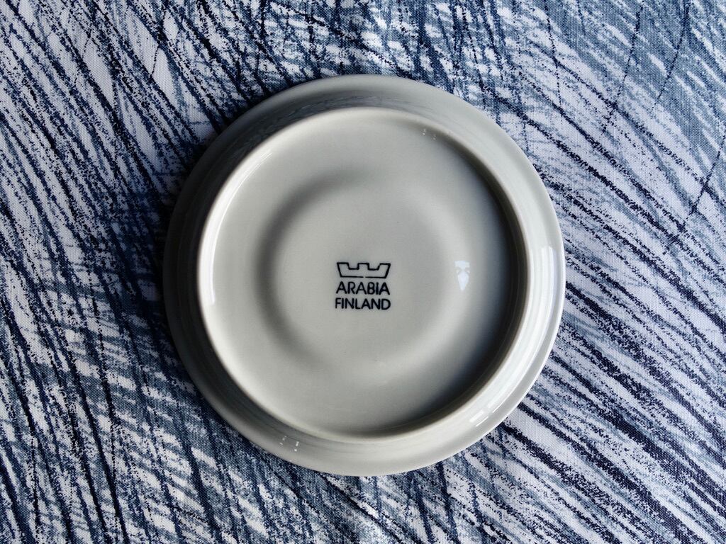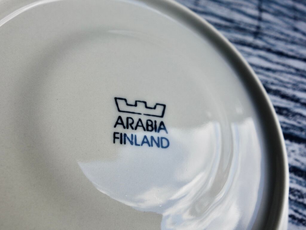 細かな擦れやくすみなど薄っすら少し感じる程度で概ね良好な状態と言えます。ARABIA ロゴのバックスタンプが記されており、食洗機可とされています。