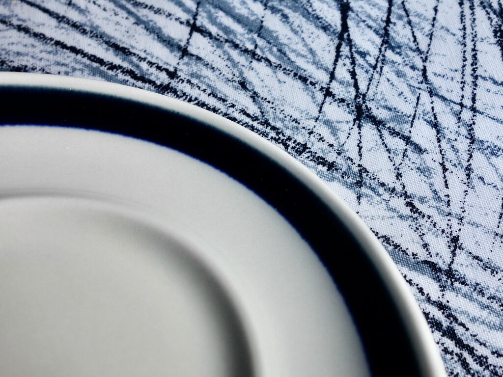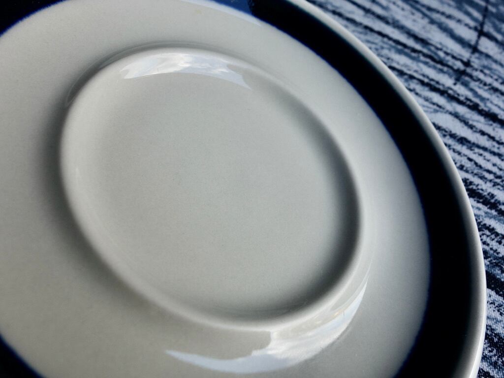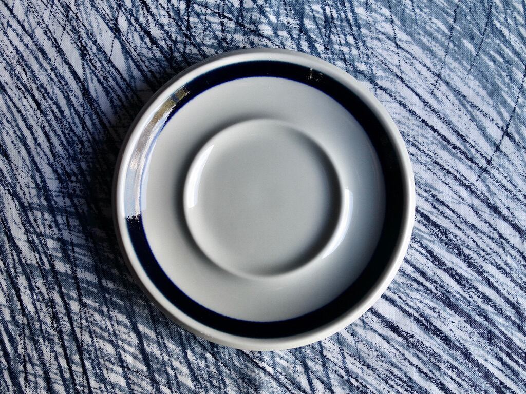 藍色のラインデザインはシンプルなものでカップを引き立たせています。カップを乗せるエリアなどにカトラリー跡と言える細かな擦れや微細キズなどの使用感は少し感じる箇所はあるものの、概ね綺麗な状態と言えます。※ペン先ほどの小さな凸跡は製作過程の跡になります。