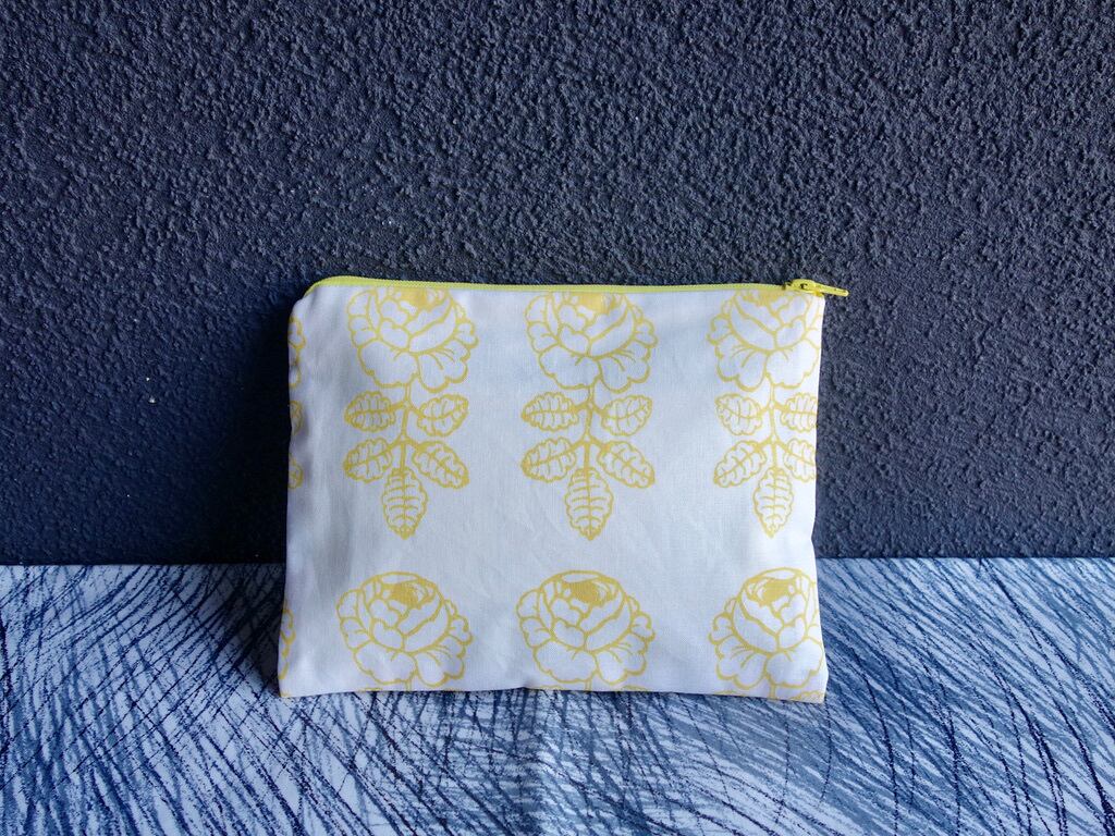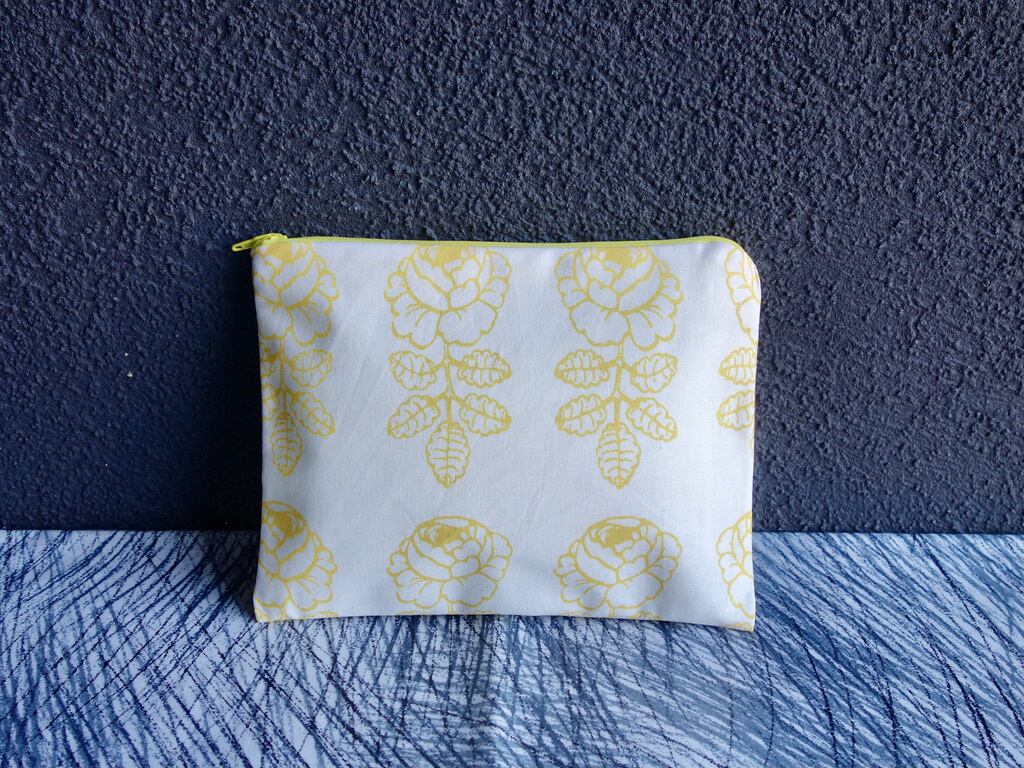 marimekko "VIHKIRUUSU"(白 × 黄色)パターンのテキスタイル生地を使ったハンドメイドポーチです。※基本的に未使用のお品となります。