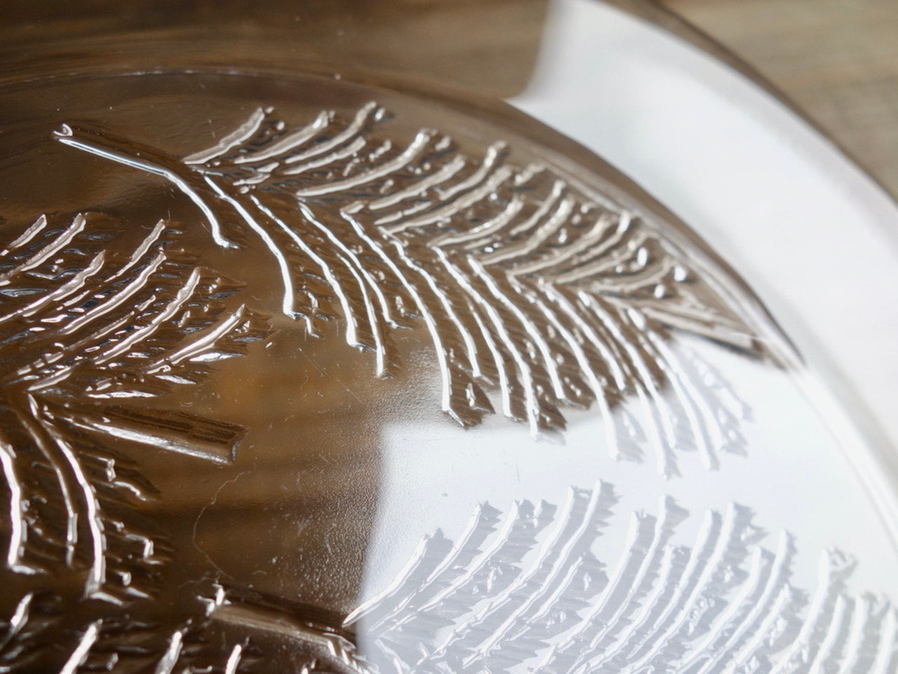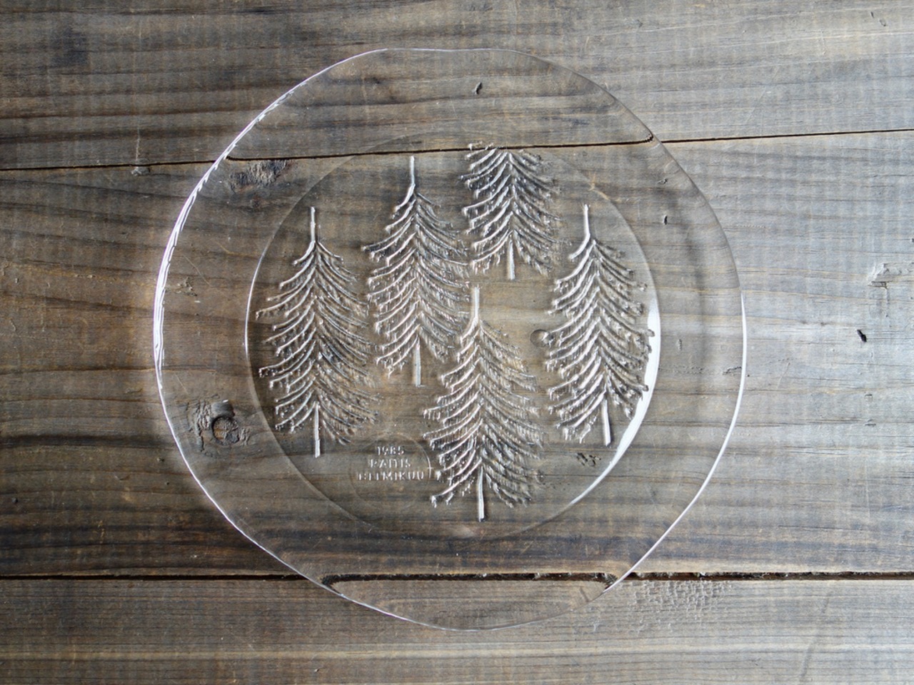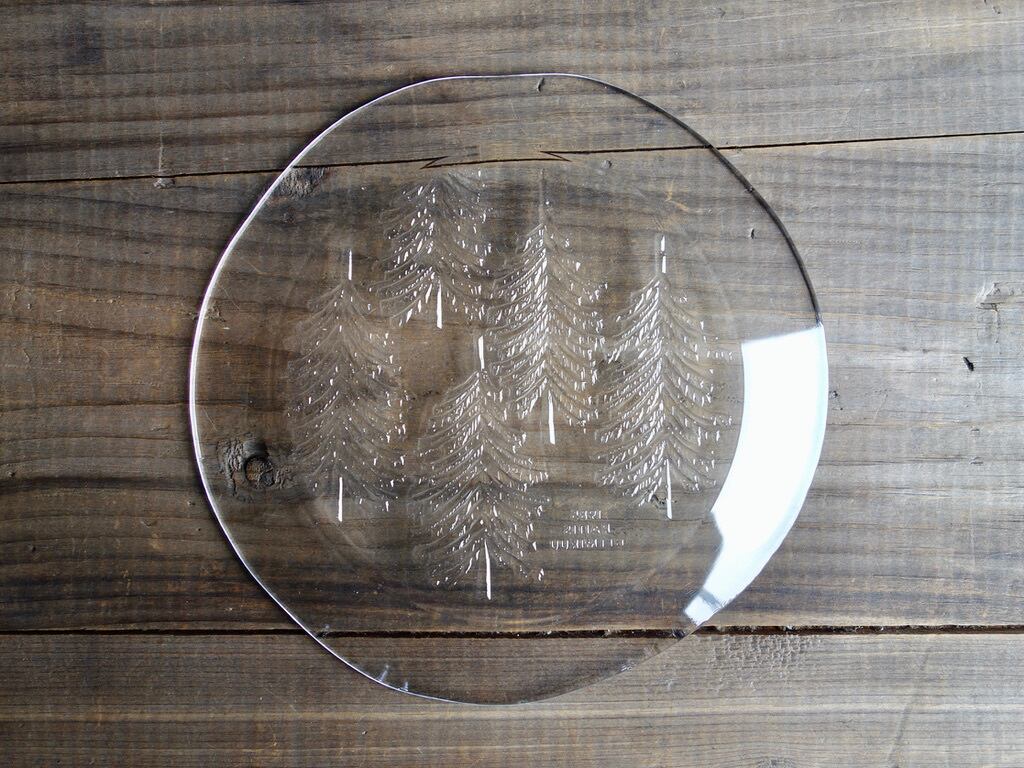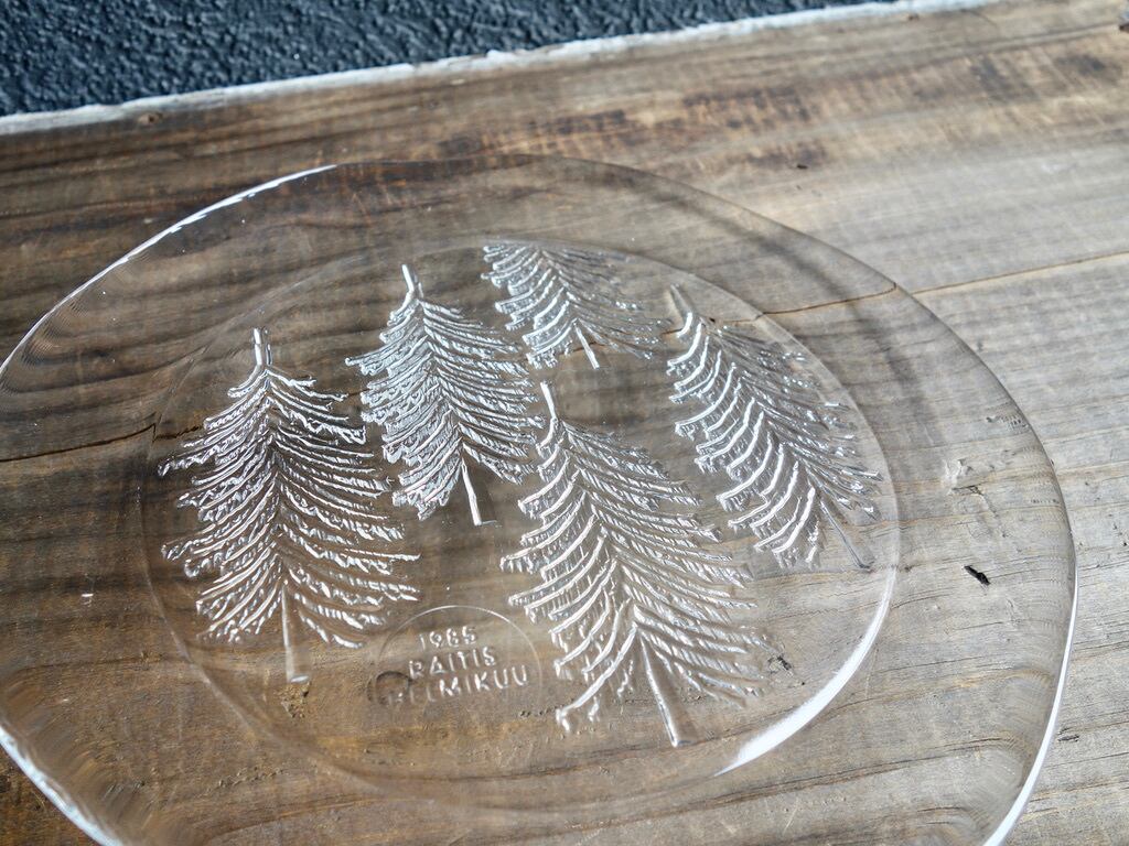 雪を被ったようなモミの木が5本裏面からエンボス加工(絵柄などを浮き彫りにする加工方法のこと)されフィンランドの自然を楽しめる感じのデザインです。表面はツルッとしており手入れもし易くなっています。カトラリー跡のような細かな擦れや微細キズなど(画像4,5)の使用感は感じる箇所はあるものの、欠けや割れなど見られないことから、時を刻んで来たガラス製品として概ね良好な状態と言えます。プレート左下に1985 RAITIS HELMIKUUと刻まれています。 ※加工時の小さな気泡(画像6)は少し見られる箇所はございます。