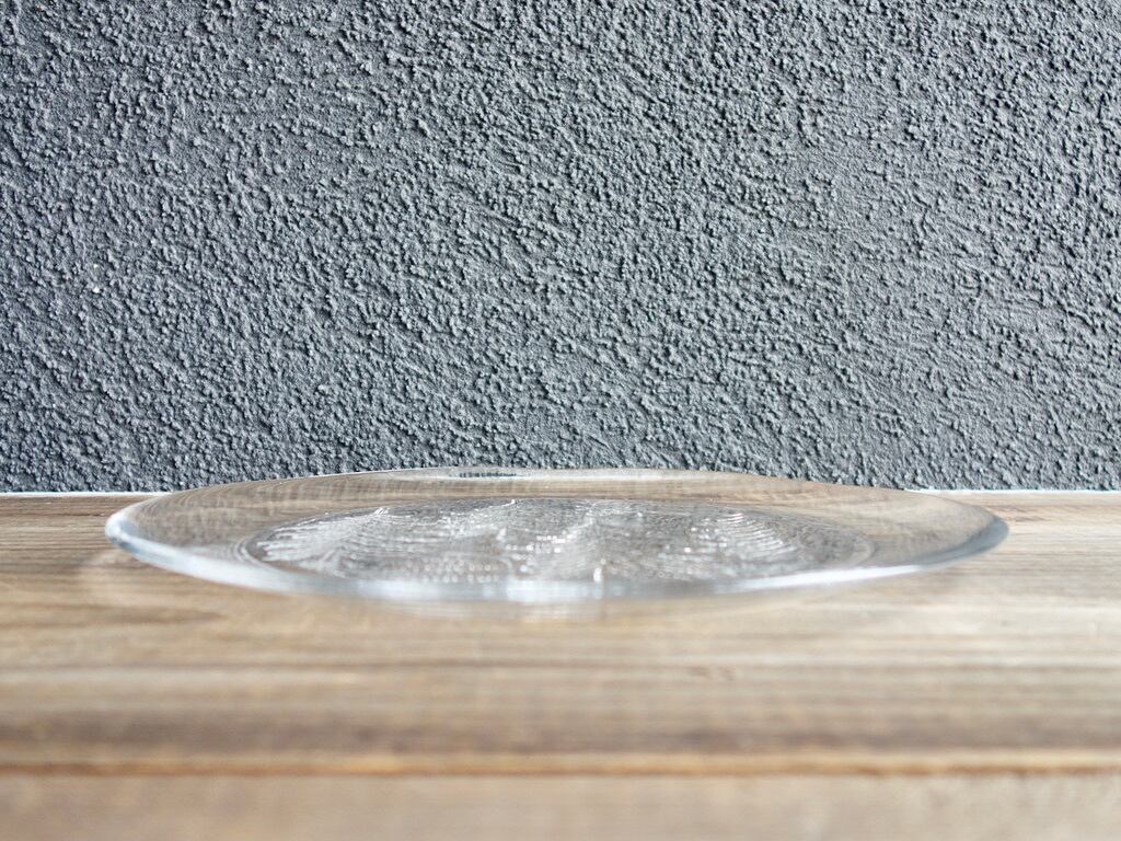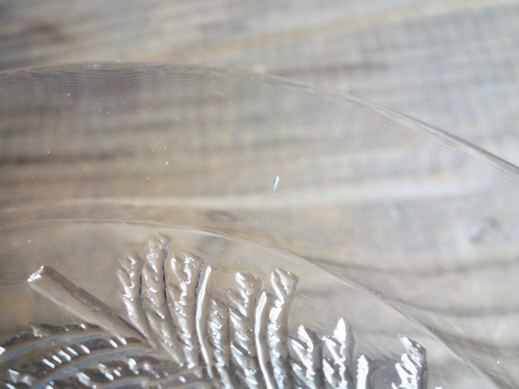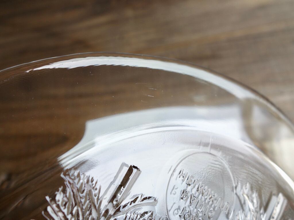 カトラリー跡のような細かな擦れや微細キズなどの使用感は感じる箇所はあるものの、欠けや割れなど見られないことから、時を刻んで来たガラス製品として概ね良好な状態と言えます。※ガラス製品特有のゆらぎ、シワやスジ、模様などの個体差、加工時の気泡やキズなど出ている可能性はございます。