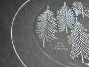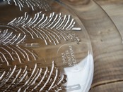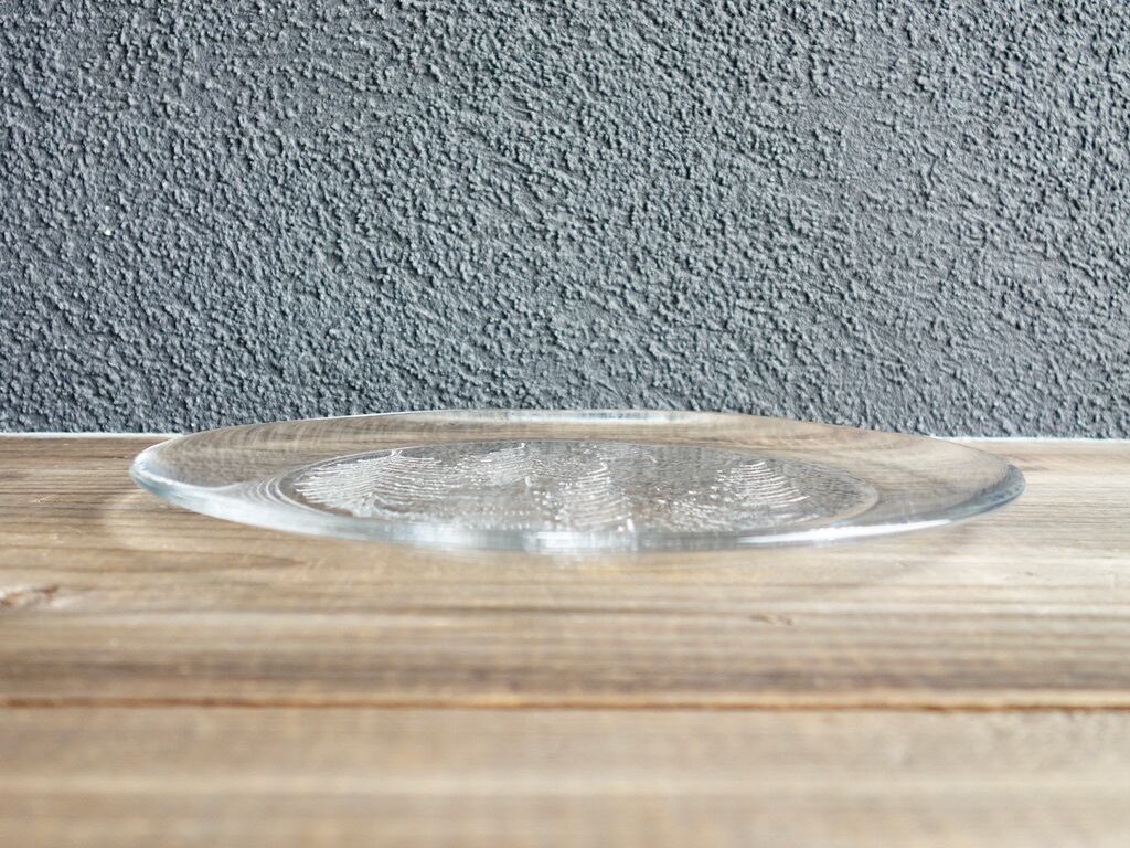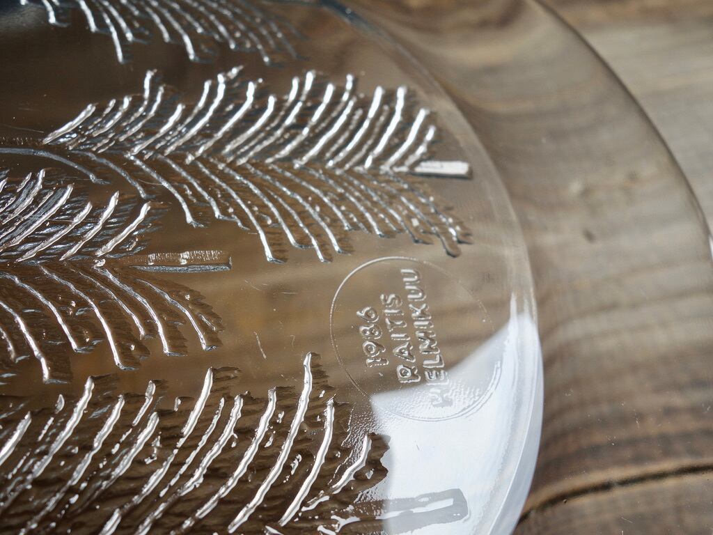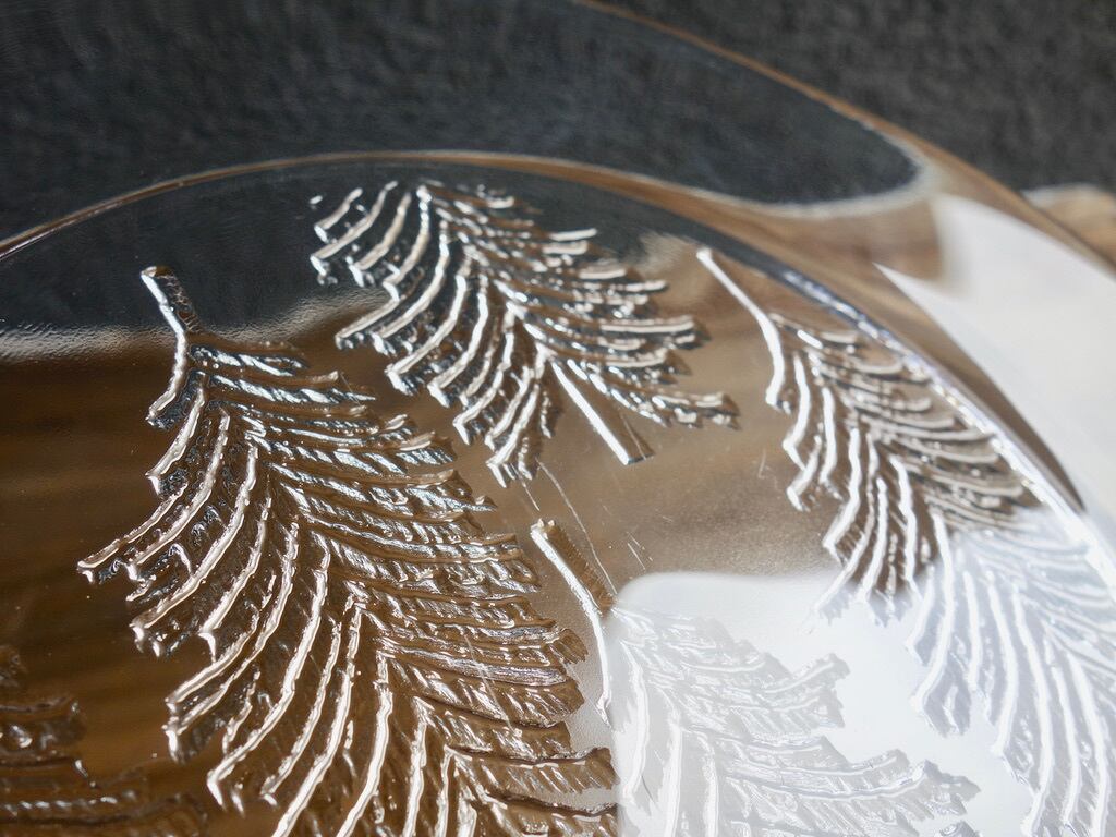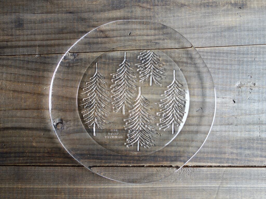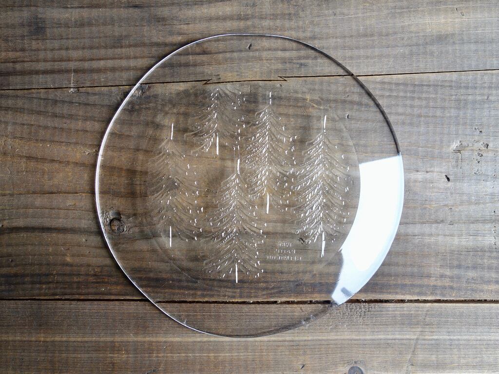 雪を被ったようなモミの木が5本裏面からエンボス加工(絵柄などを浮き彫りにする加工方法のこと)されフィンランドの自然を楽しめる感じのデザインです。表面はツルッとしており手入れもし易くなっています。カトラリー跡のような細かな擦れや細キズなど(画像5,6)の使用感は感じる箇所はありますが欠けや割れなど見られないことから、時を刻んで来たガラス製品として比較的綺麗な状態と言えます。プレート左下に1986 RAITIS HELMIKUUと刻まれています。 ※加工時の小さな気泡は少し見られる箇所はございます。