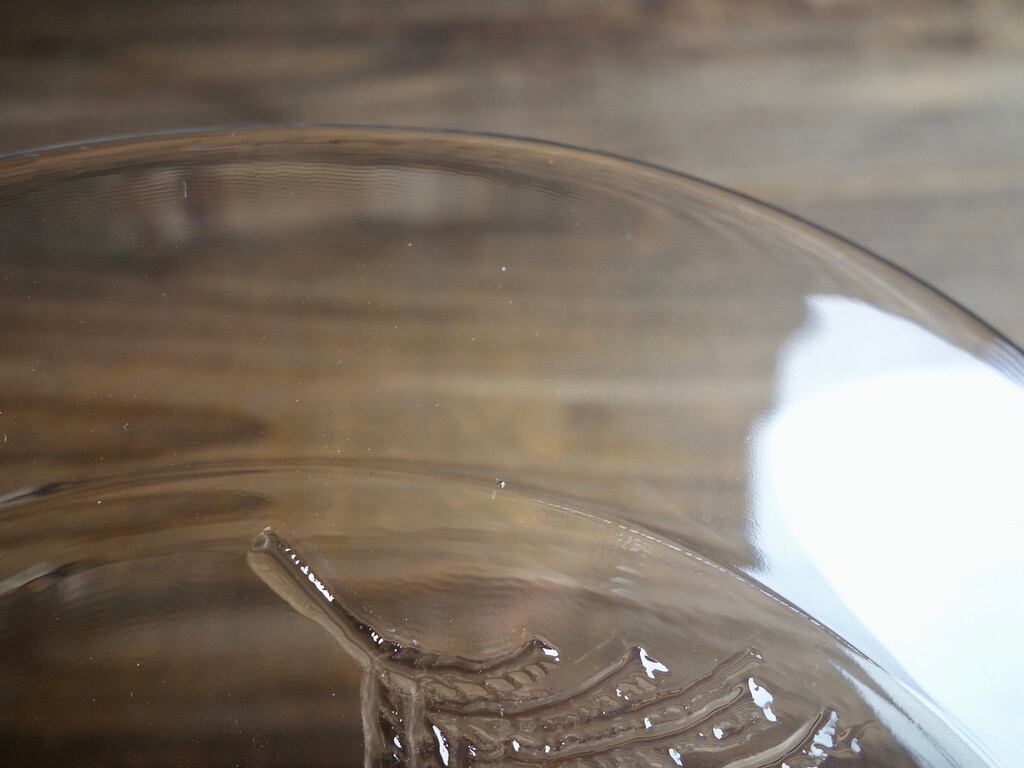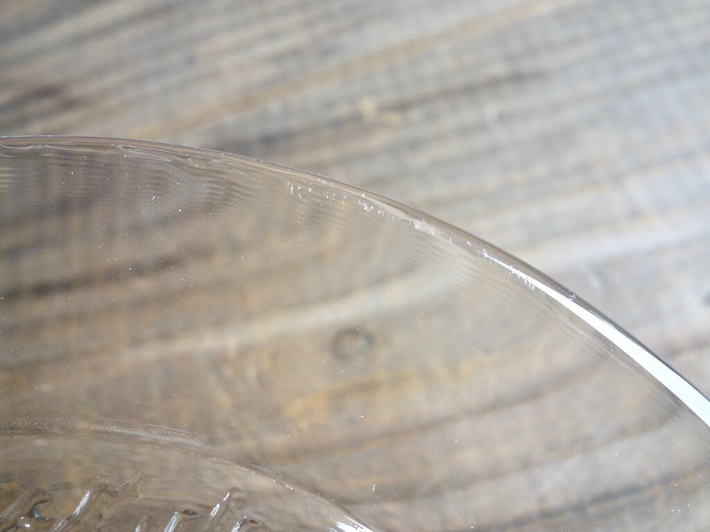 カトラリー跡のような細かな擦れや細キズなどの使用感は感じる箇所はありますが欠けや割れなど見られないことから、時を刻んで来たガラス製品として比較的綺麗な状態と言えます。※ガラス製品特有のゆらぎ、シワやスジ、模様などの個体差、加工時の気泡やキズなど出ている可能性はございます。