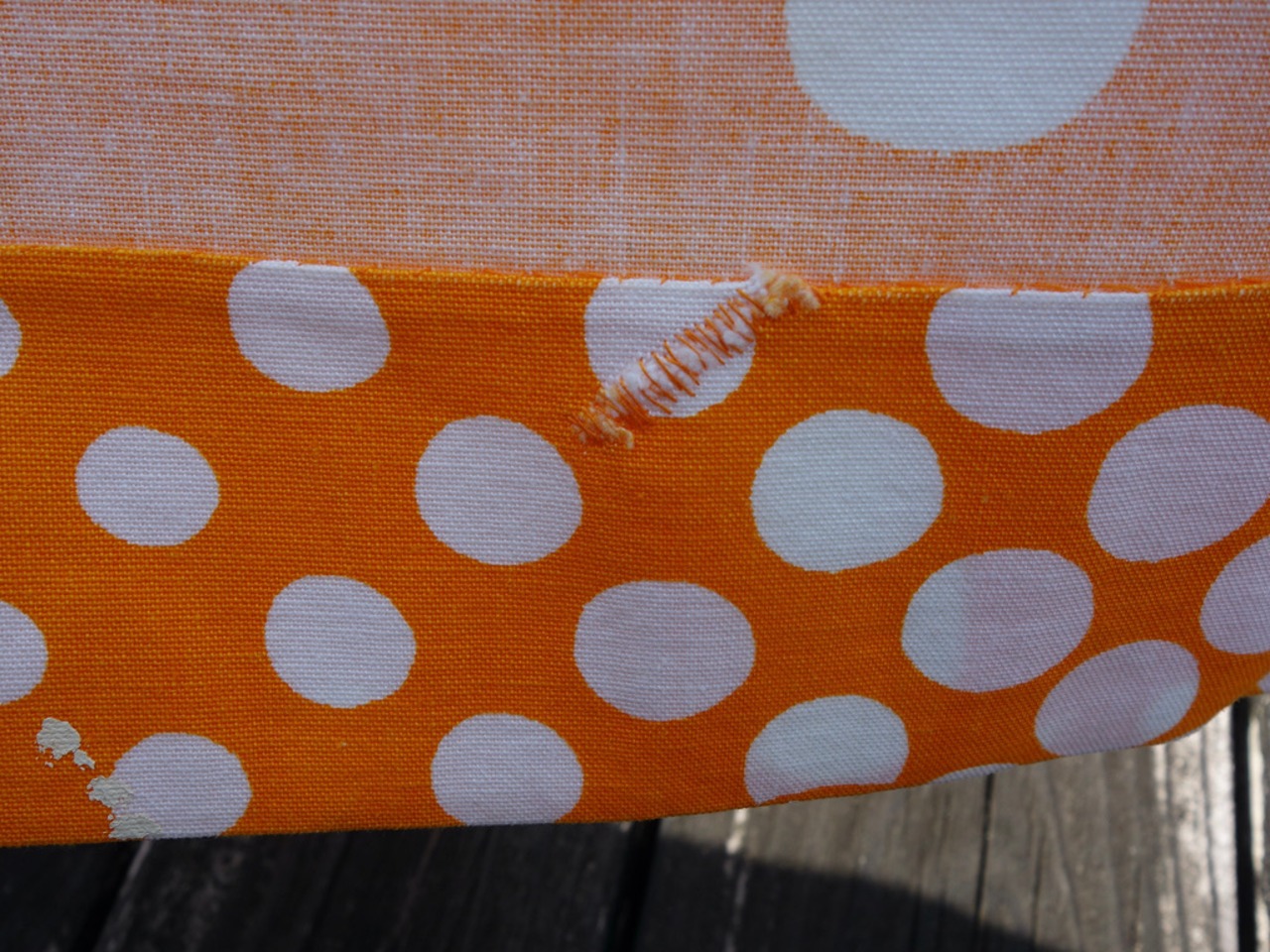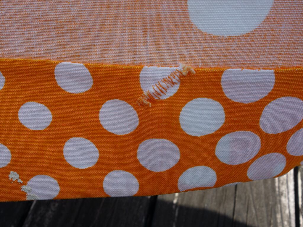 小さな黒点跡少々、中段右端のくすみ(画像9)、色褪せ、下端の解れのような織りムラ(画像5)など見られる箇所はあるものの、僅かに地のオレンジ色が白い部分に移った様な薄っすらとした跡が見られる程度で比較的綺麗な状態と言えます。※裏面中断右の方に付いた白い修正液のような跡(画像13)が表面から見る角度によって見え隠れする感じの跡(画像4)が一部見られますが目立つ気に障る跡ではありません。