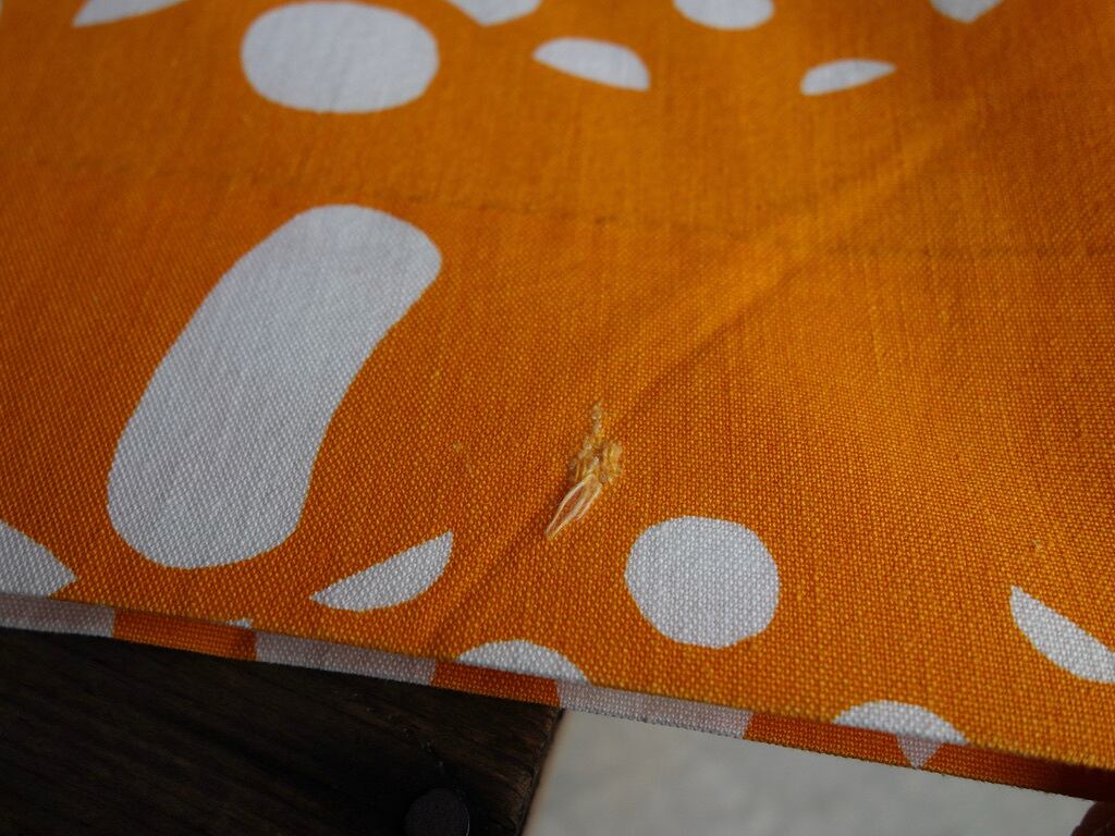 経年による風合いの変化、小さな黒点跡や中段右端のくすみ、色褪せ、下端の解れのような織りムラなど見られる箇所はあるものの、僅かに地のオレンジ色が白い部分に移った様な薄っすらとした跡が見られる程度で、生地に裂け(裏面に修繕箇所あり)や穴など見られないことから、時を刻んで来た生地として比較的綺麗な状態と言えます。※プリントのムラやロス、ネップなどの個体差、輸送・保管時のシワや折り跡など出ている可能性はございます。