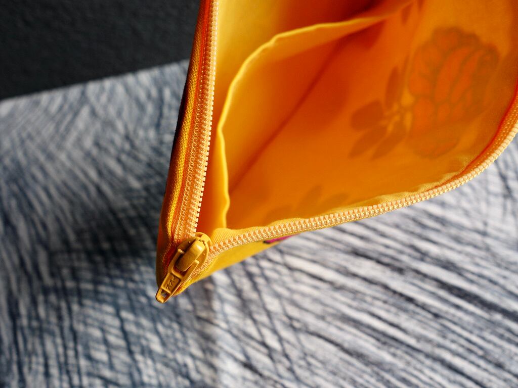 相性の良いオレンジがかった黄色の無地生地が合わせられており、内ポケットが一つ施されています。
