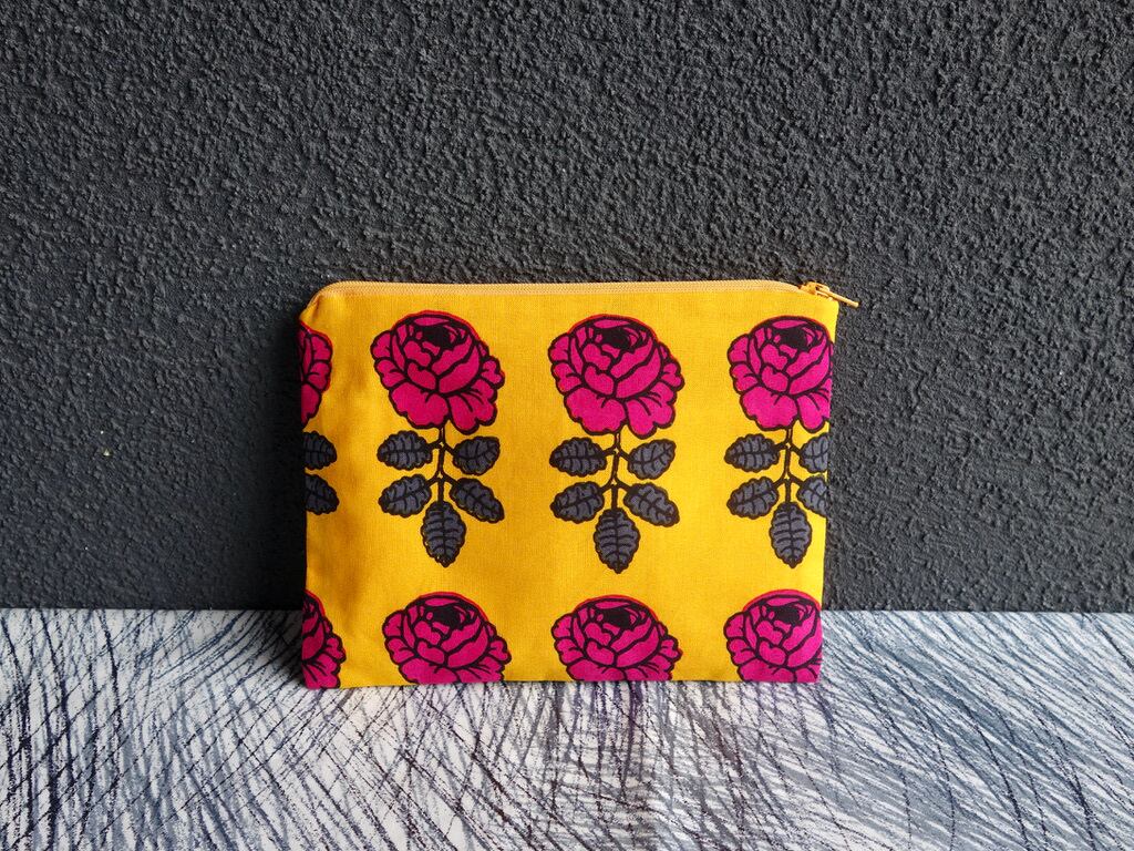 marimekko "VIHKIRUUSU"(黄色 × 赤ピンク)パターンのテキスタイル生地を使ったハンドメイドポーチです。※基本的に未使用のお品となります。