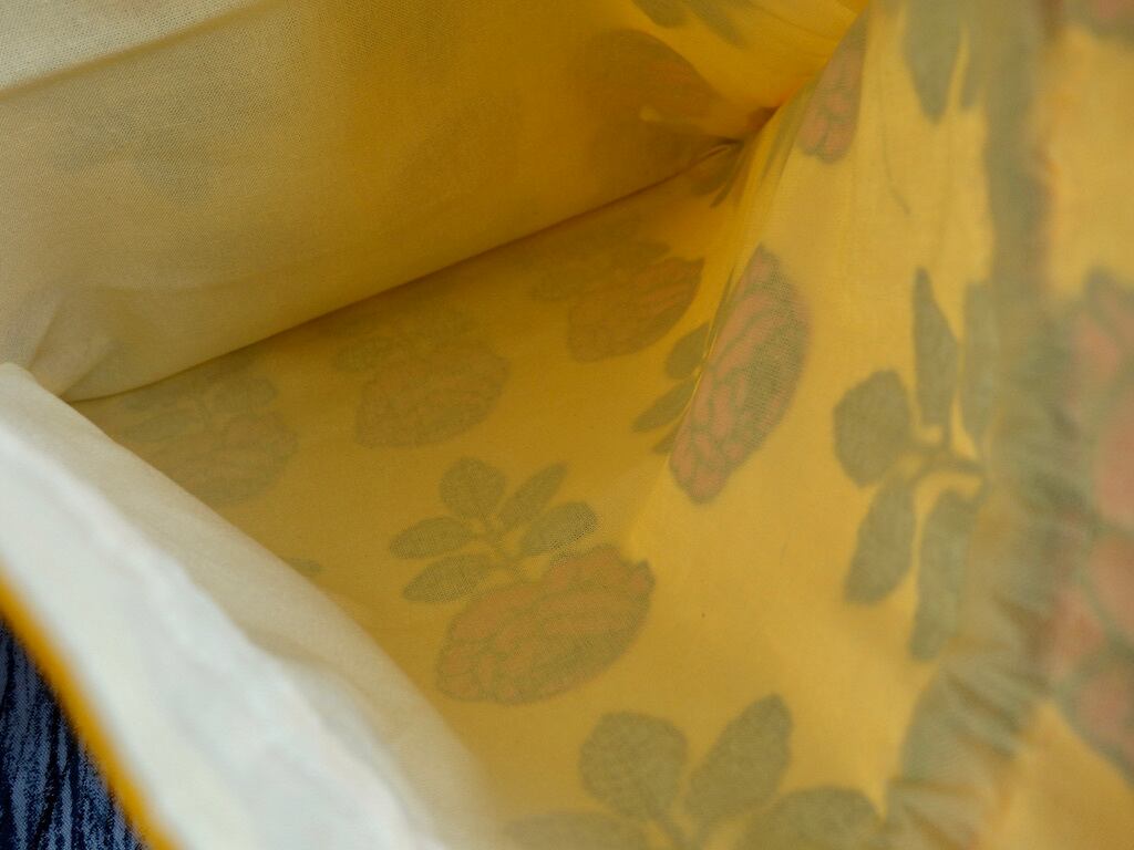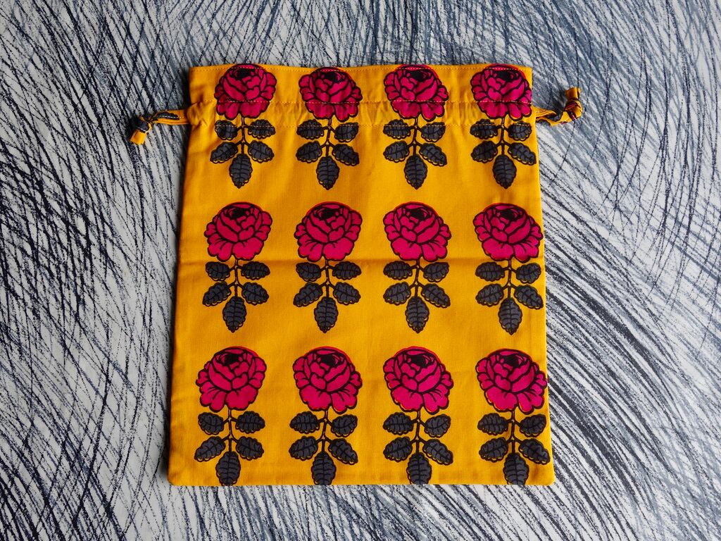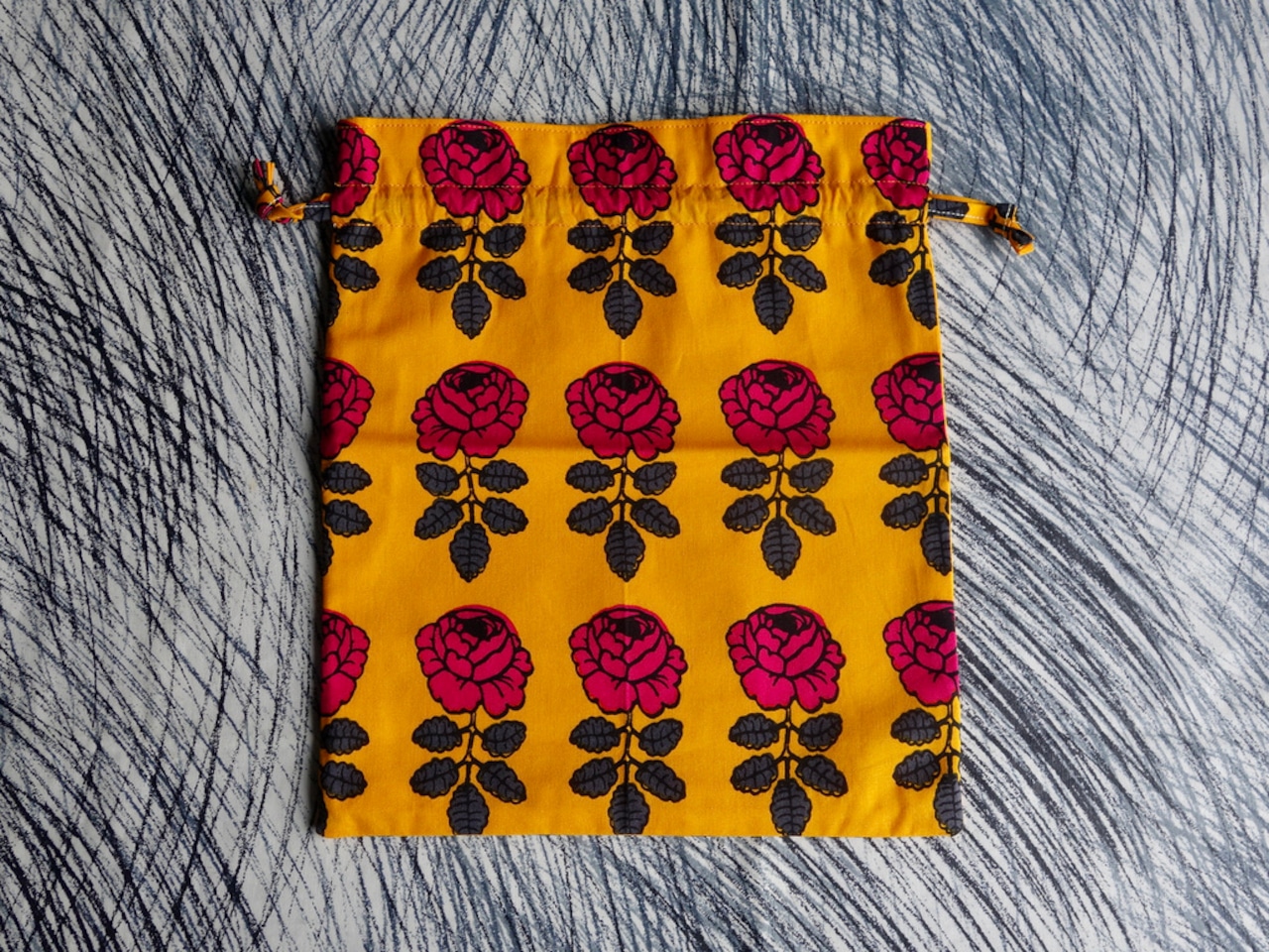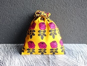 貴重品などを入れ携帯したり、やや大きめのポーチなどとしてもお使いいただけます。時にはお弁当箱入れやメインバッグなどにさりげなく忍ばせたりしても便利だと思います。お行儀よく配列したバラの感じが大変可愛らしい巾着袋をお手元で可愛がってみませんか。