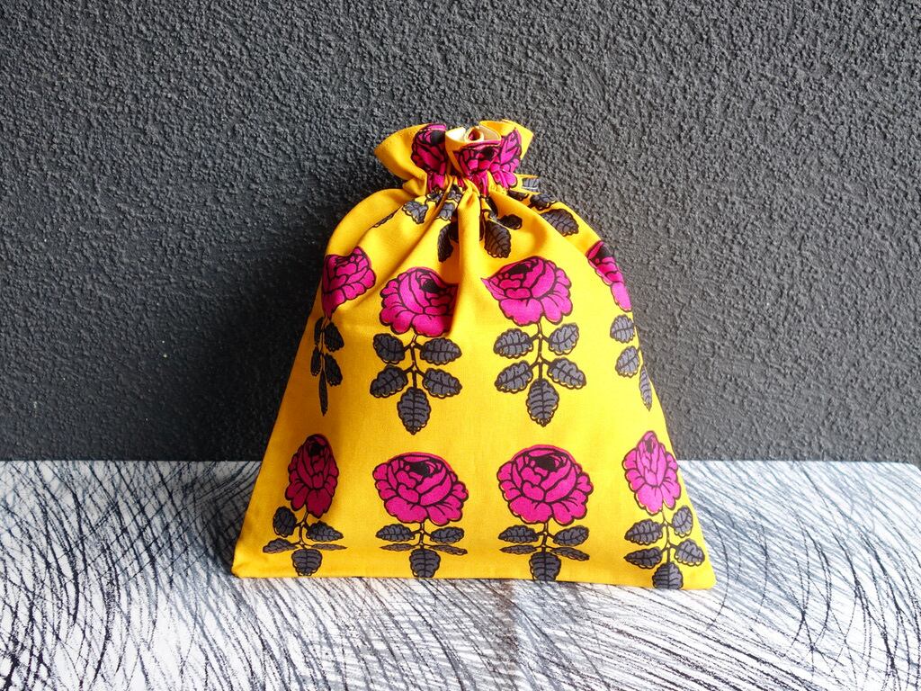 marimekko “VIHKIRUUSU”(黄色 × 赤ピンク)パターンのTEXTILEを使ってハンドメイドされている巾着袋。※基本的に未使用のお品になります。