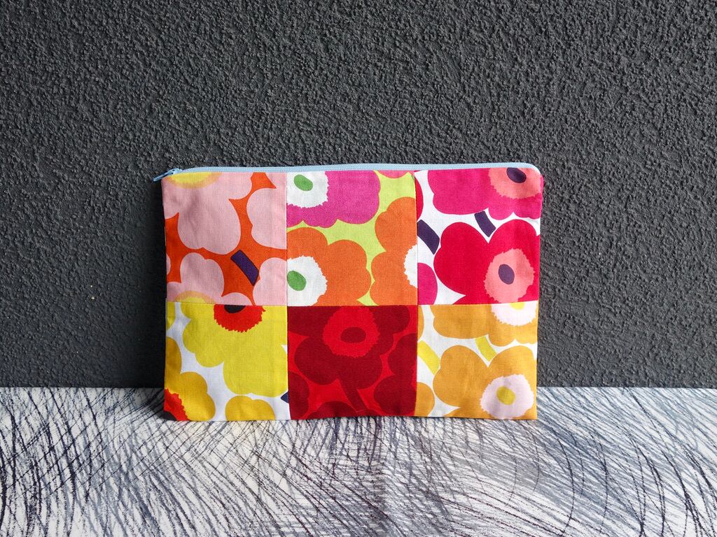 marimekko “MINI UNIKKO” パターンの様々なカラーリングの生地を使ってパッチワークされているクラッチバッグ型のポーチ(ハンドメイド)になります。※基本的に未使用の状態のお品になります。