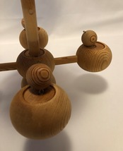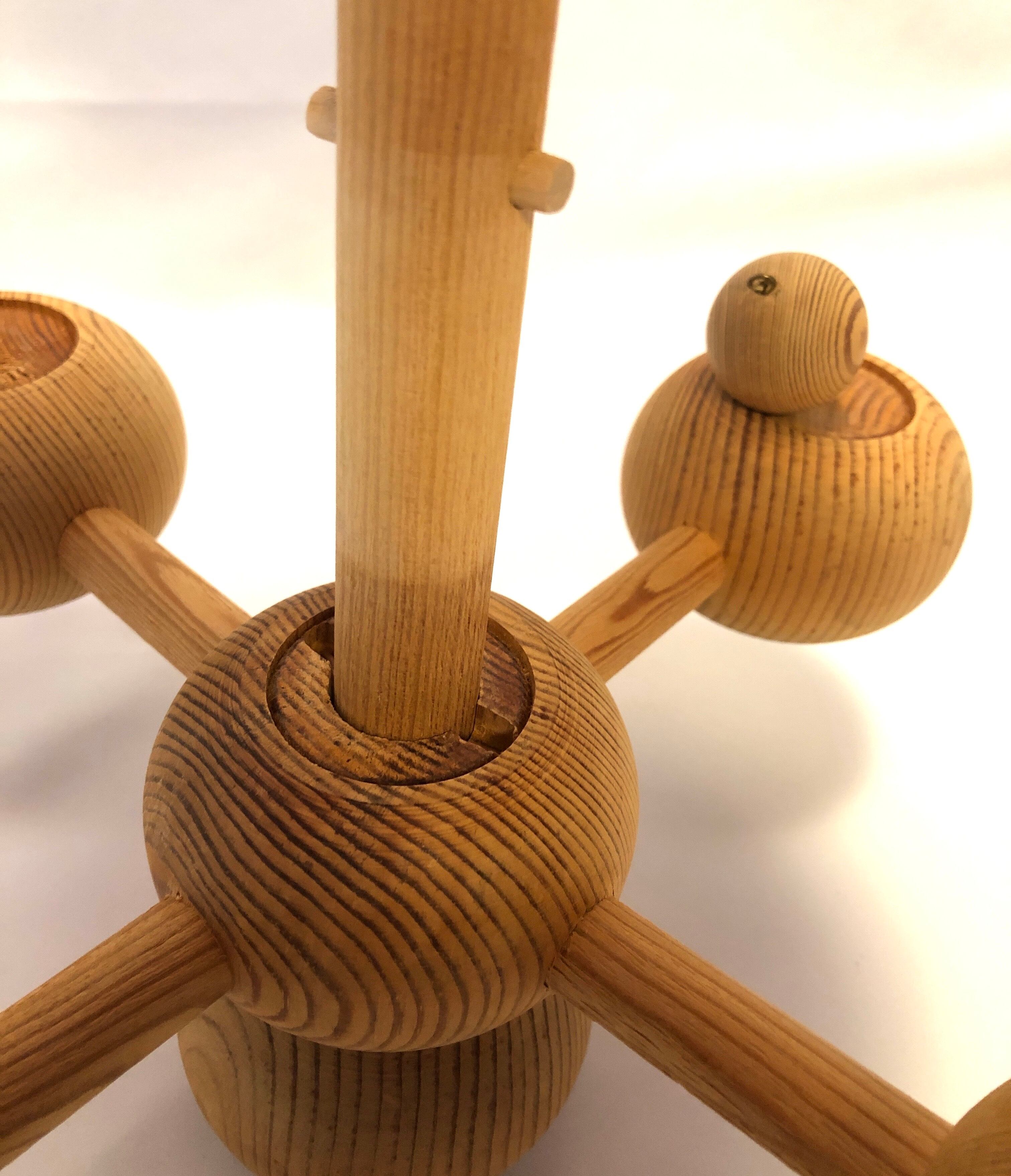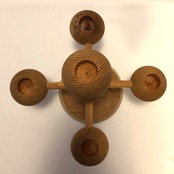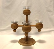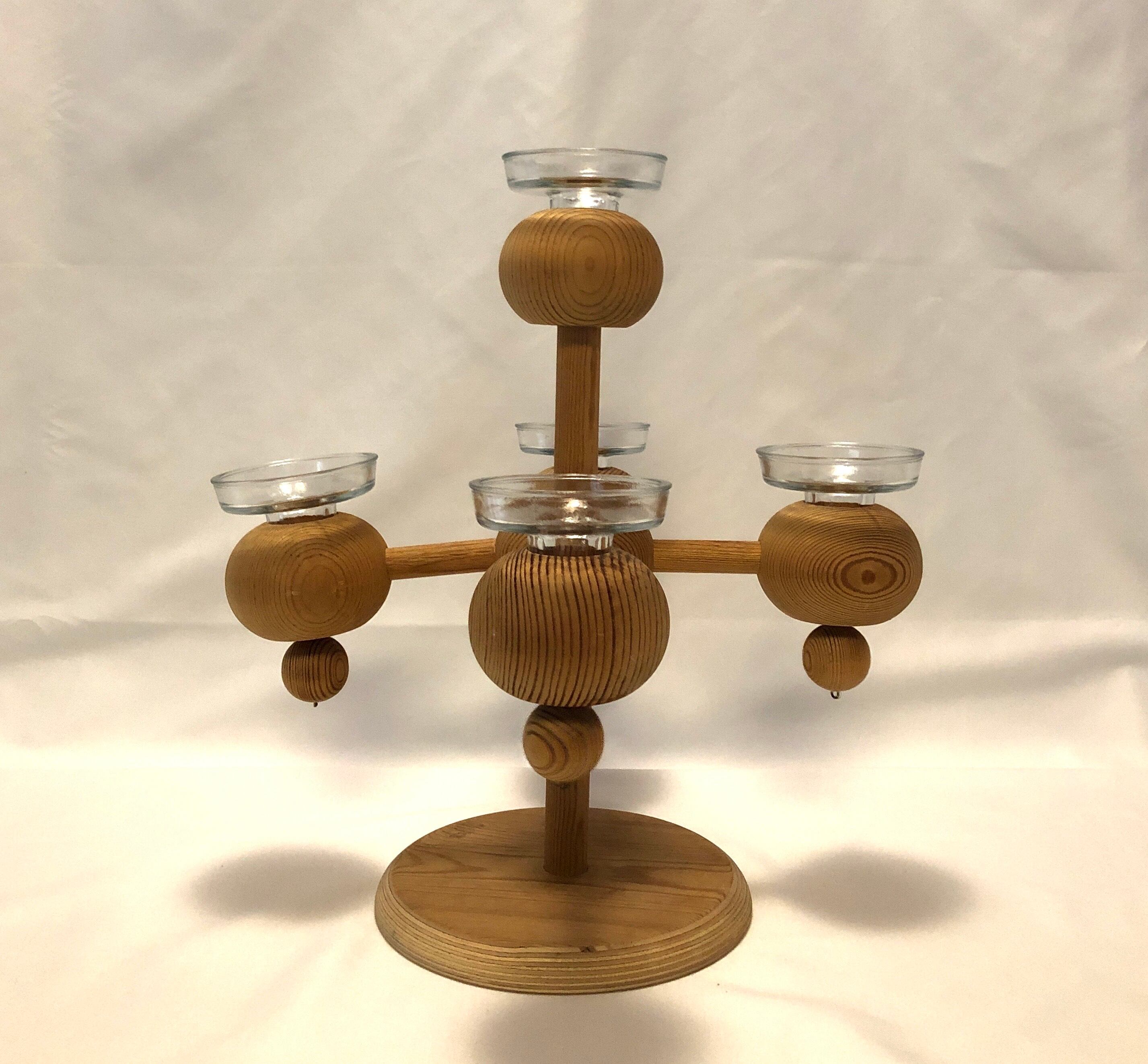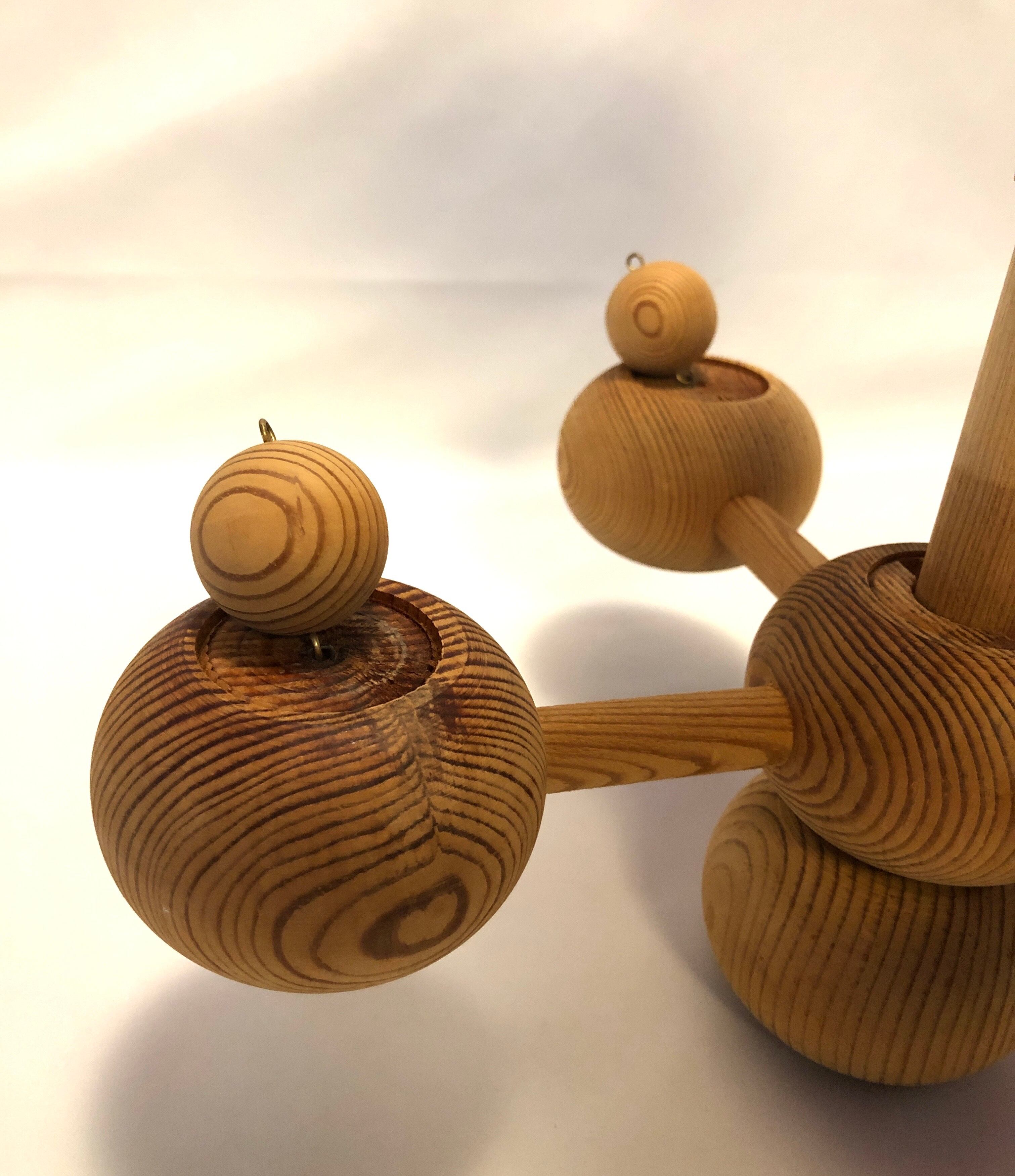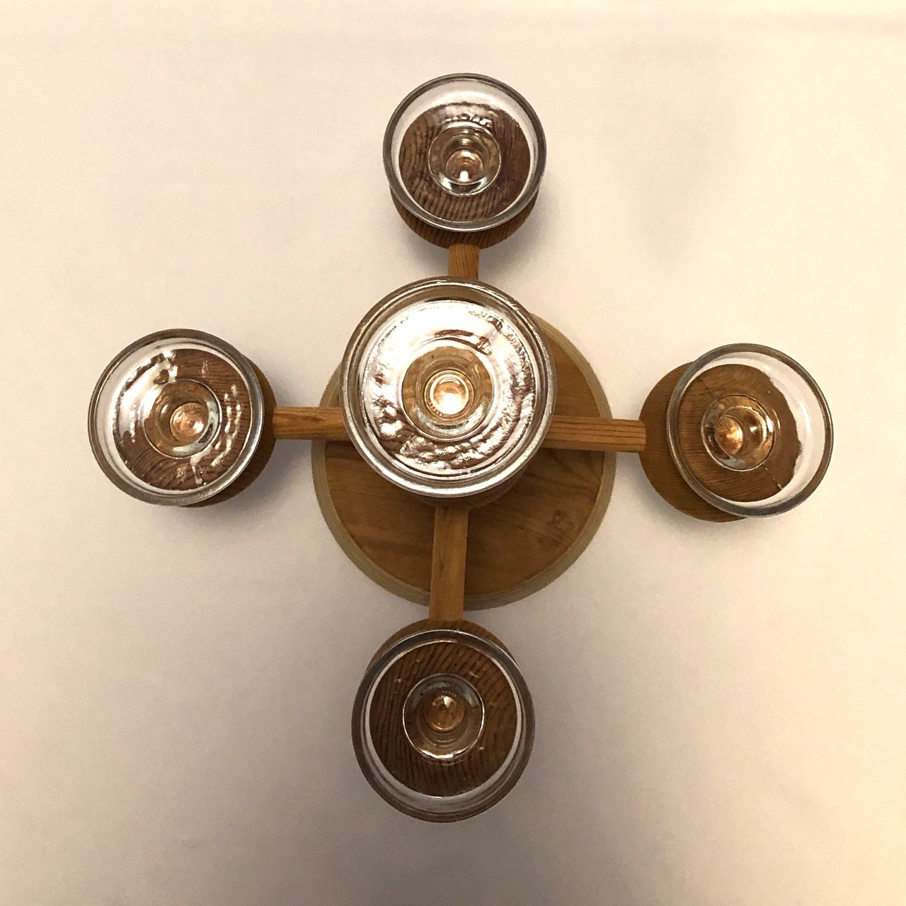 構造としては、ミルフィーユの様な木の層組の丸台座のセンターから支柱が立ちトップにはガラス受1つセットが出来、クロスしたブラケットにもガラス受4つの計5灯のキャンドルをセットすることができます。4つのブラケットの下部には金属金具連結の球体がぶら下がっているところもチャーミングです。表からは判りませんが、裏から覗くとセンタークロス部分の木をはめ込む様(画像9,10)な安定をもたらす仕組みが古き良き時代なるお作りのような感じがして、とても嬉しくなります。全幅34 cm × 全高35 cm(37.5 cm / ガラス受含む)のサイズ感は置けるスペースさえあれば素敵なアドバンテージ(存在感など)を実感して頂けるはずです。