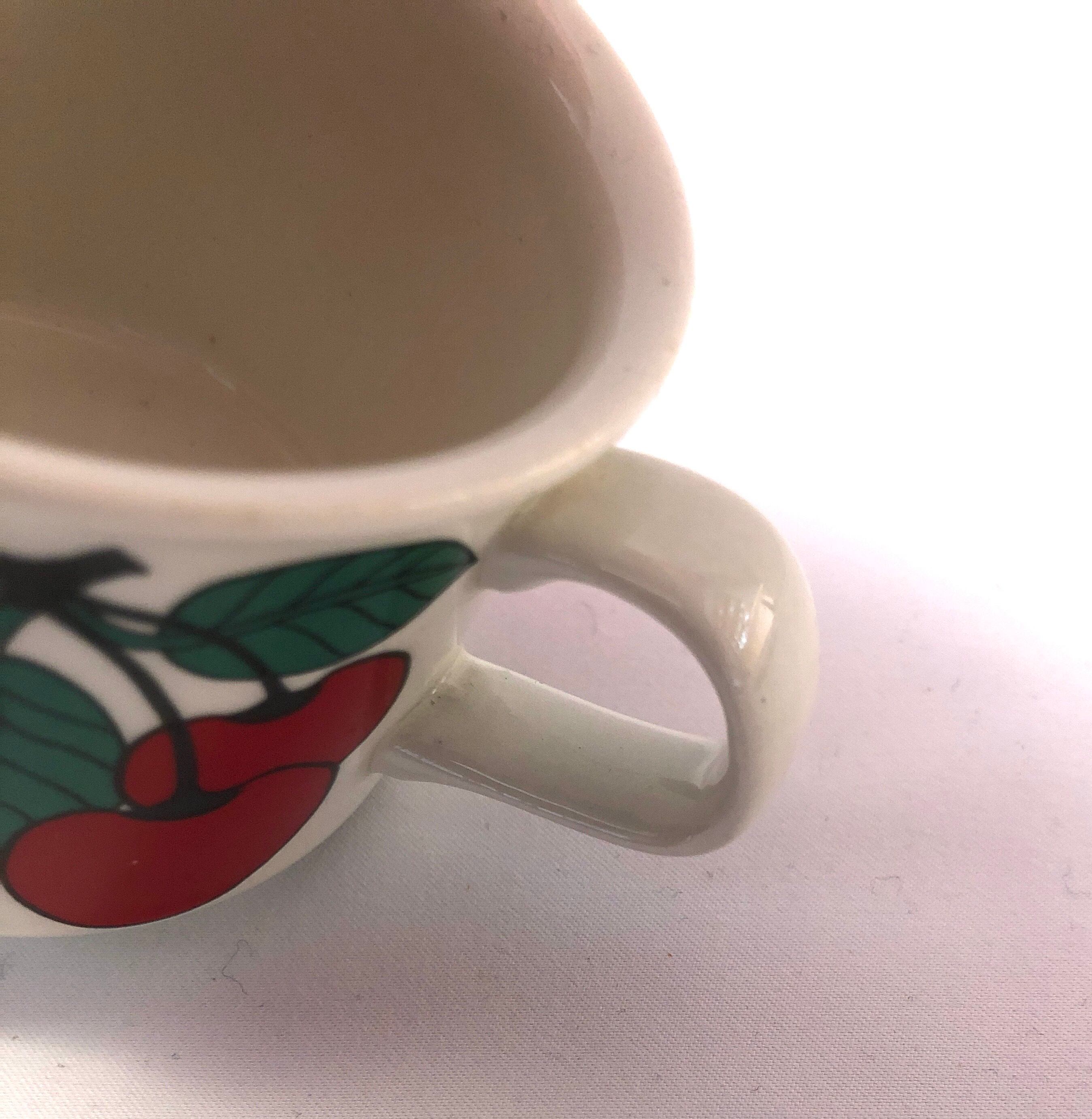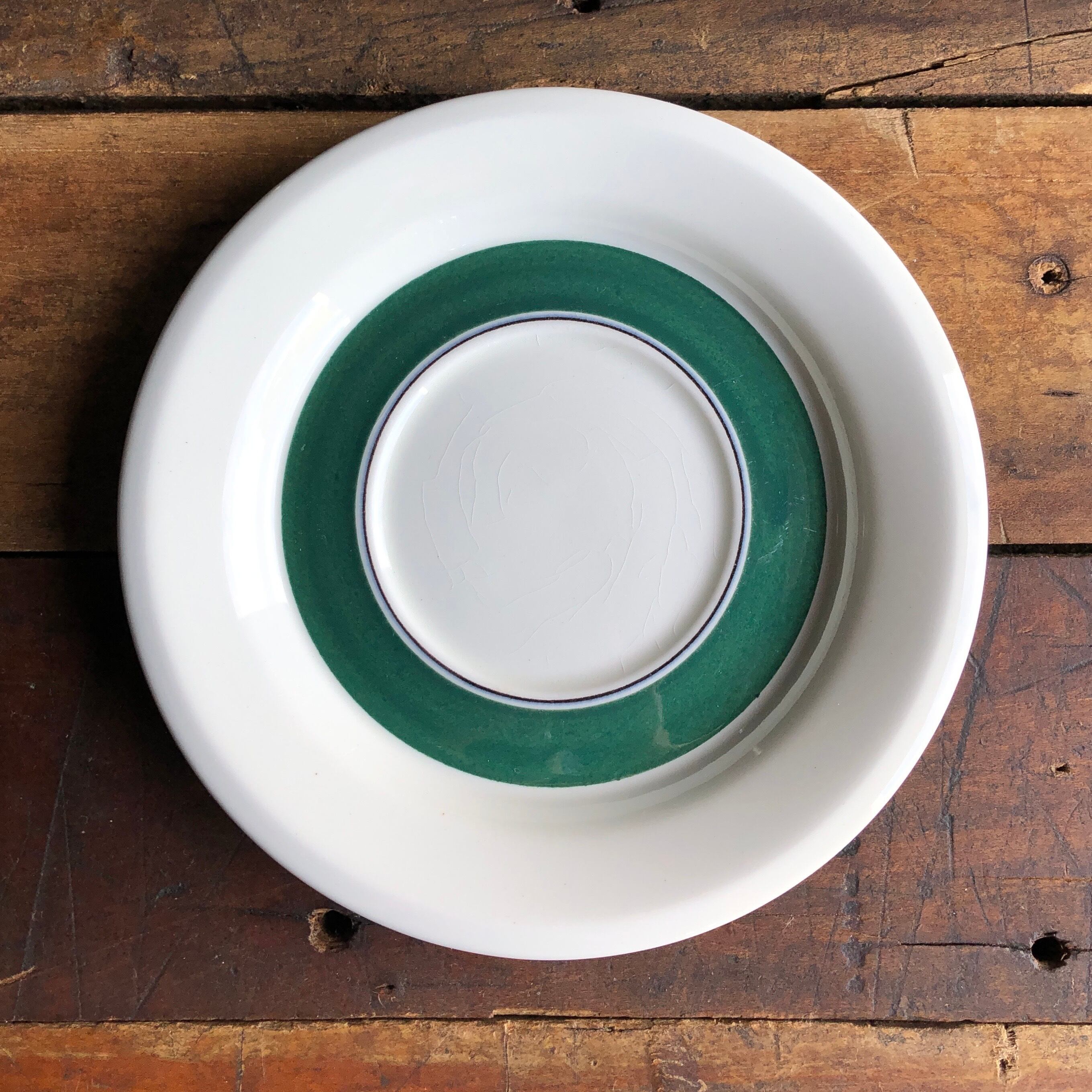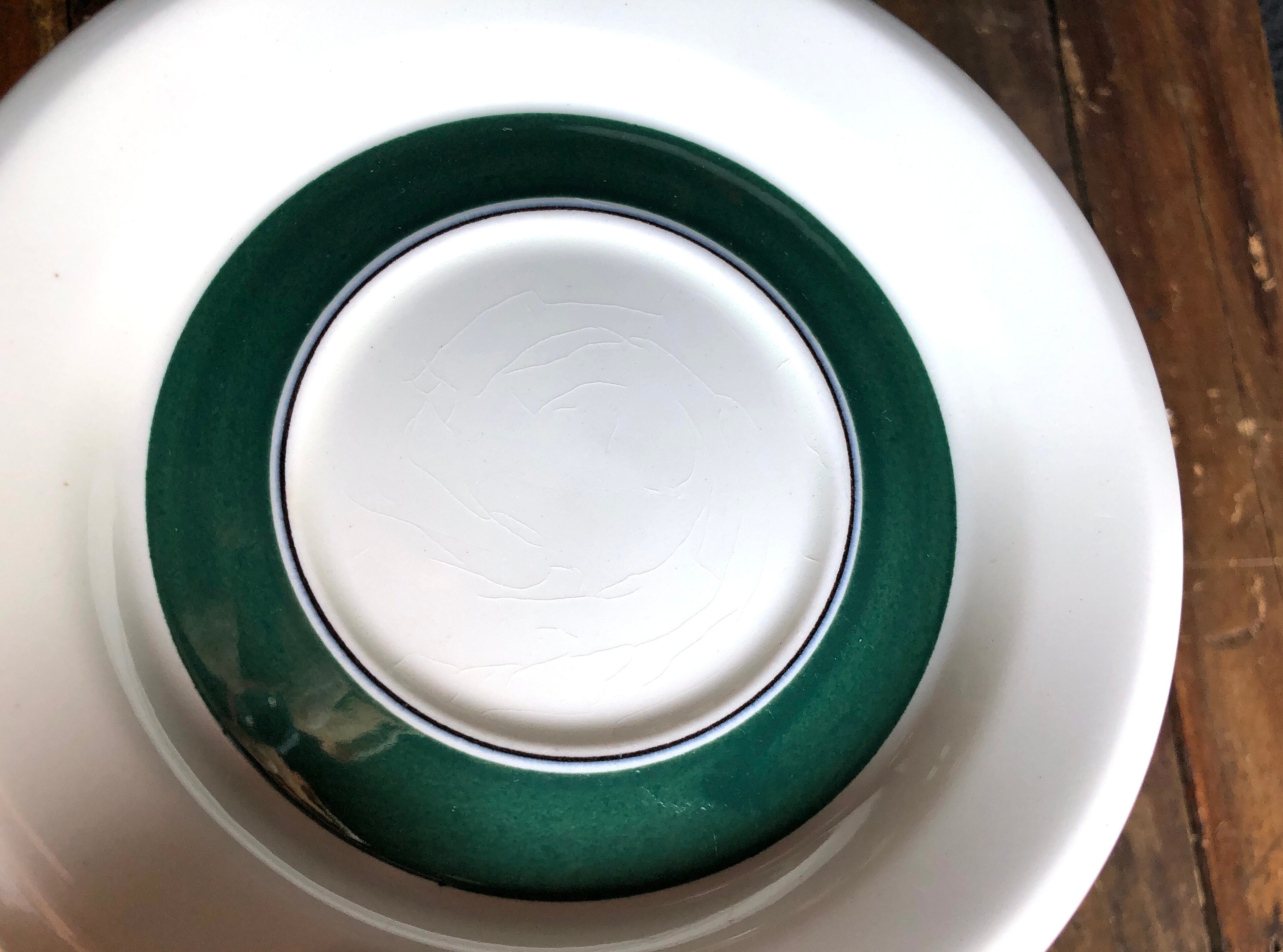 カップを乗せるエリアの外側から限りなく黒に近い濃緑細ラインと太めの緑ラインが引かれカップのサクランボが間延びしないデザインに映ります。経年による風合いの変化や色褪せ、カトラリー跡と言える細かな擦れや微細キズ、くすみなど使用感程度のナチュラルな感じで、目立つ擦れ、キズ、汚れ、色褪せなど見当たらず比較的綺麗な状態と言えます。※カップが乗るエリアに細かな風化とも言える貫入(画像10,11)が多少ありますが、これはキズや割れではない陶磁器製品の特徴の一つであるナチュラルな現象(個体差)醍醐味と捉えて頂ければ幸いです。