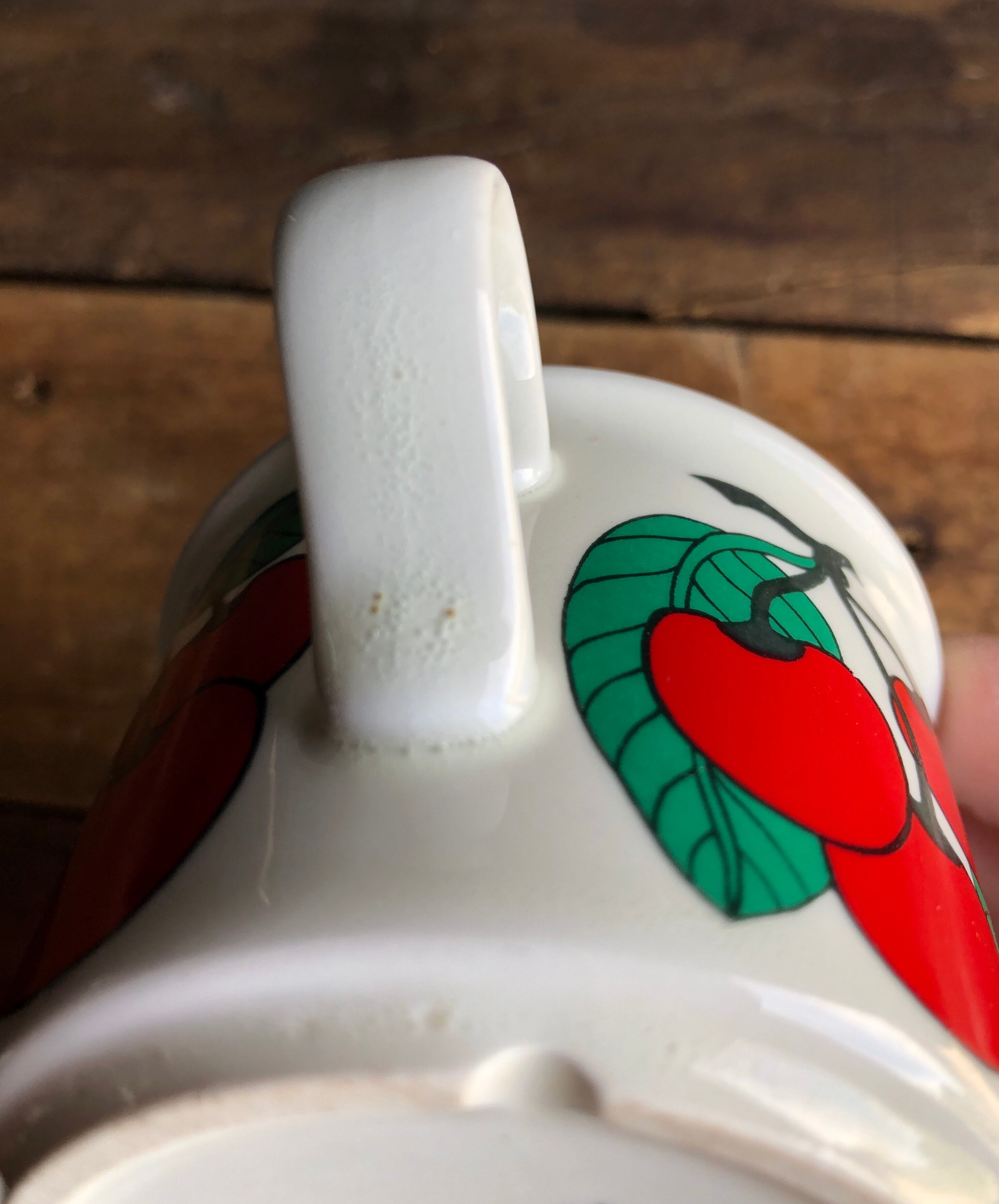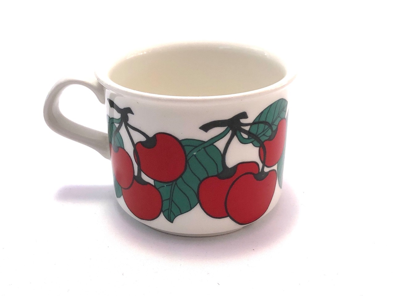 "Kirsikka" は「サクランボ」という意味の1970年代中頃のシリーズで、Peter Winquist(ペテル・ウィンクヴィスト)が手掛けたフォルムに Inkeri Seppala Leivo(インケリ・セッパラ・レイヴォ)がデコレーションを施したデザインです。その名の通り、鈴なりに実ったサクランボが大胆に色鮮やかに描かれた大変美しい作品で、最近はめっきり見かけなくなって来ている気がします。