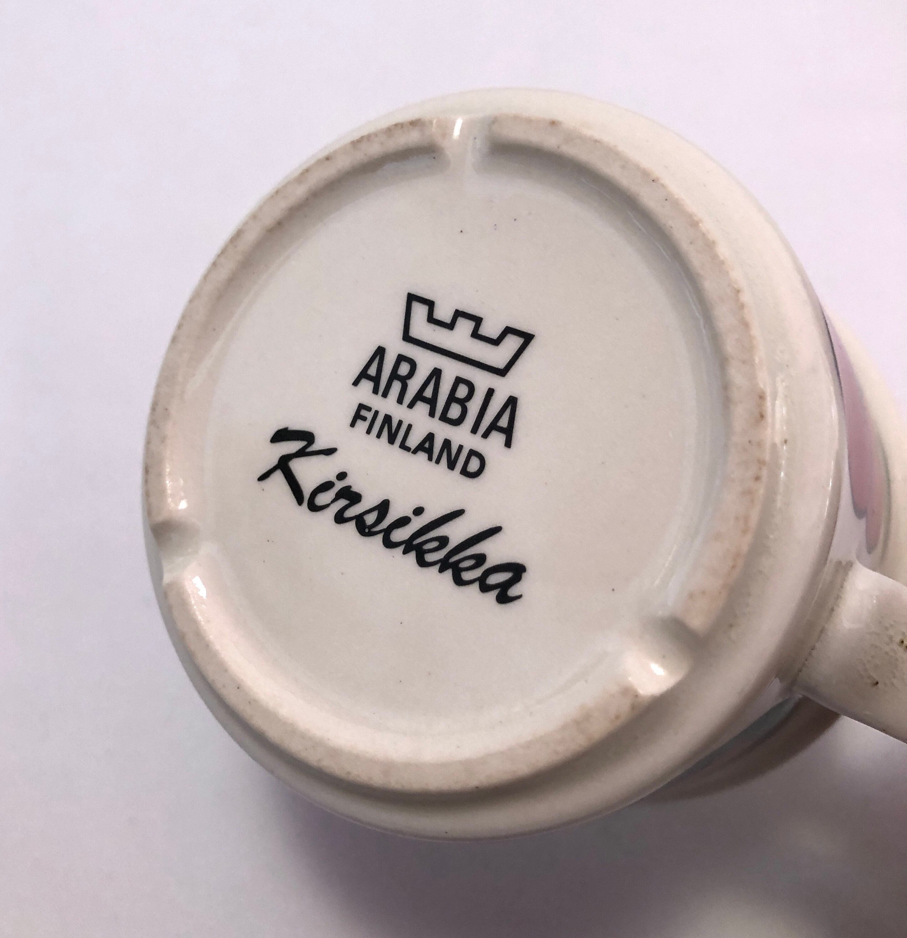 細かな擦れやくすみなど薄っすら感じる程度で概ね綺麗な状態と言えます。支柱跡がいくつか見られますが焼成時の跡になります。ARABIA旧ロゴバックスタンプが見られます。