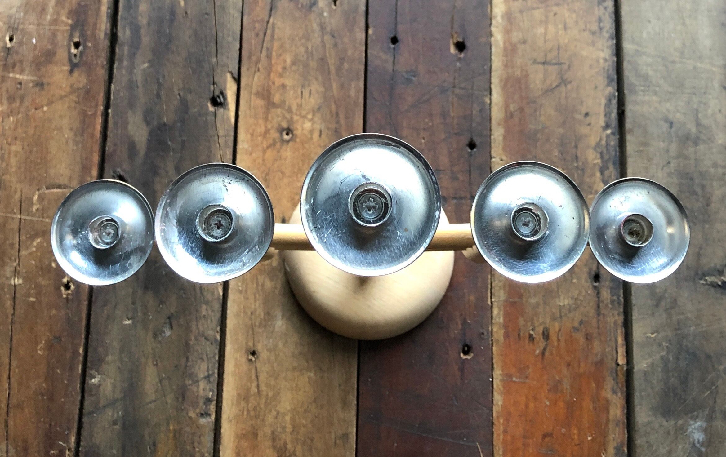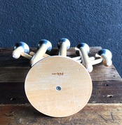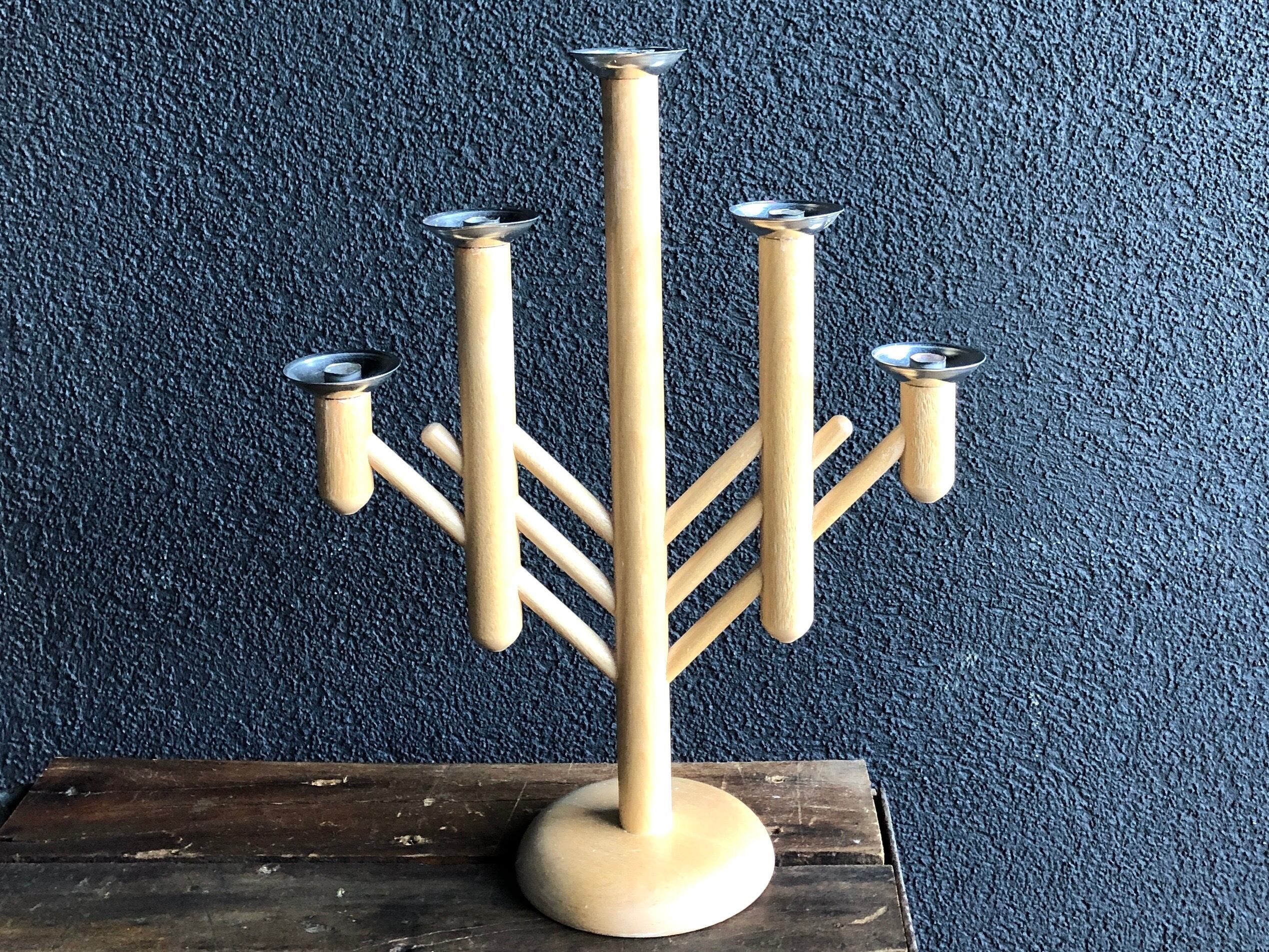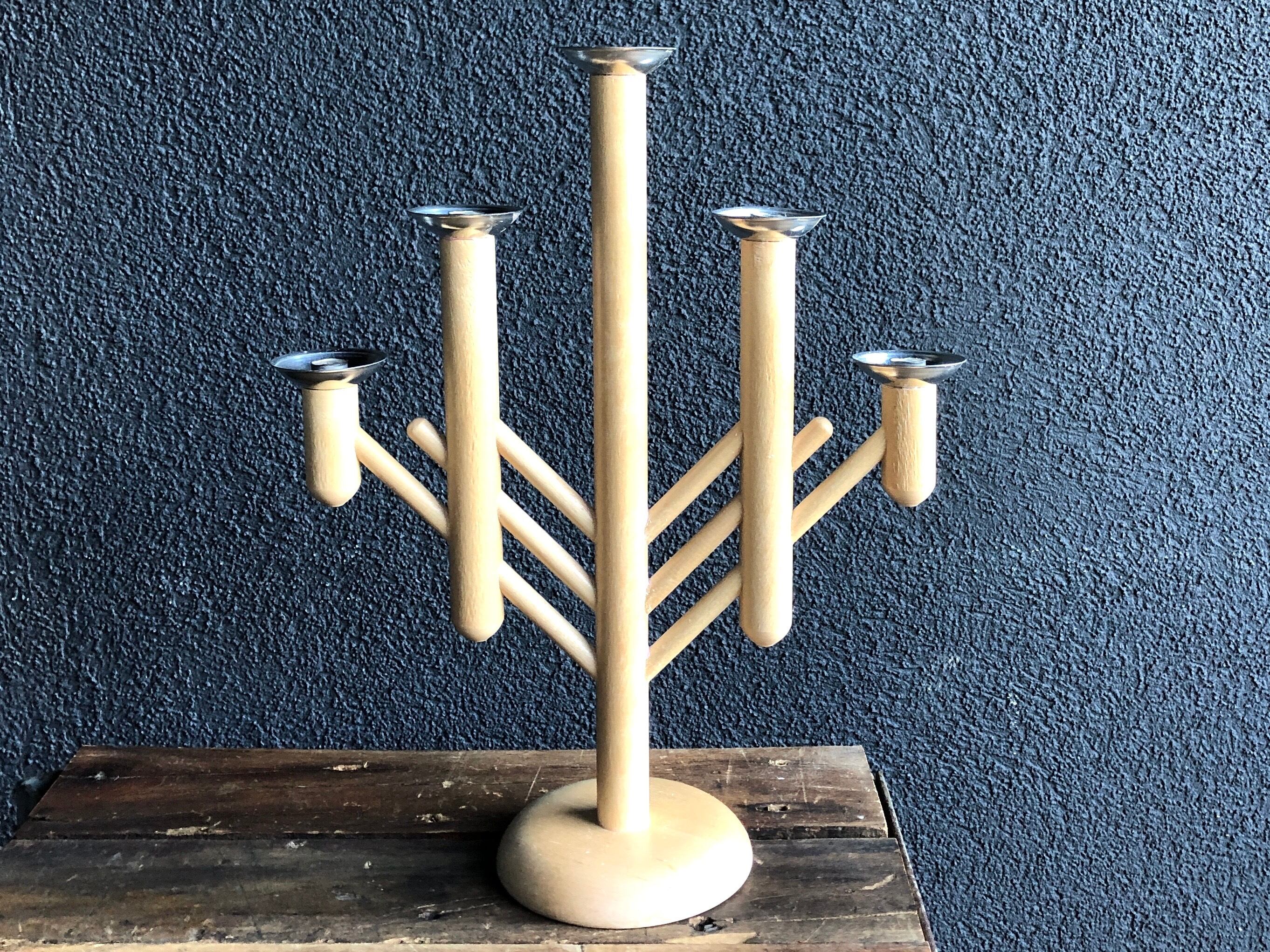 段々シンメトリーのキャンドルホルダーはどこに置いても様になる雰囲気を放っています。丸ベースからセンター支柱。その支柱から手が伸び長さの異なる棒状パーツを使って左右対称の階段状を形成しています。ベースと支柱は全て木製でキャンドル受皿はブリキ素材のような金属製です。センター支柱はベースの裏からネジ留めされ、5つの受皿もネジ留めされています。木の温もりと異素材の金属を上手に組み合わせたアーリッカらしいキャンドルホルダーは大き過ぎず小さ過ぎない佇まいです。