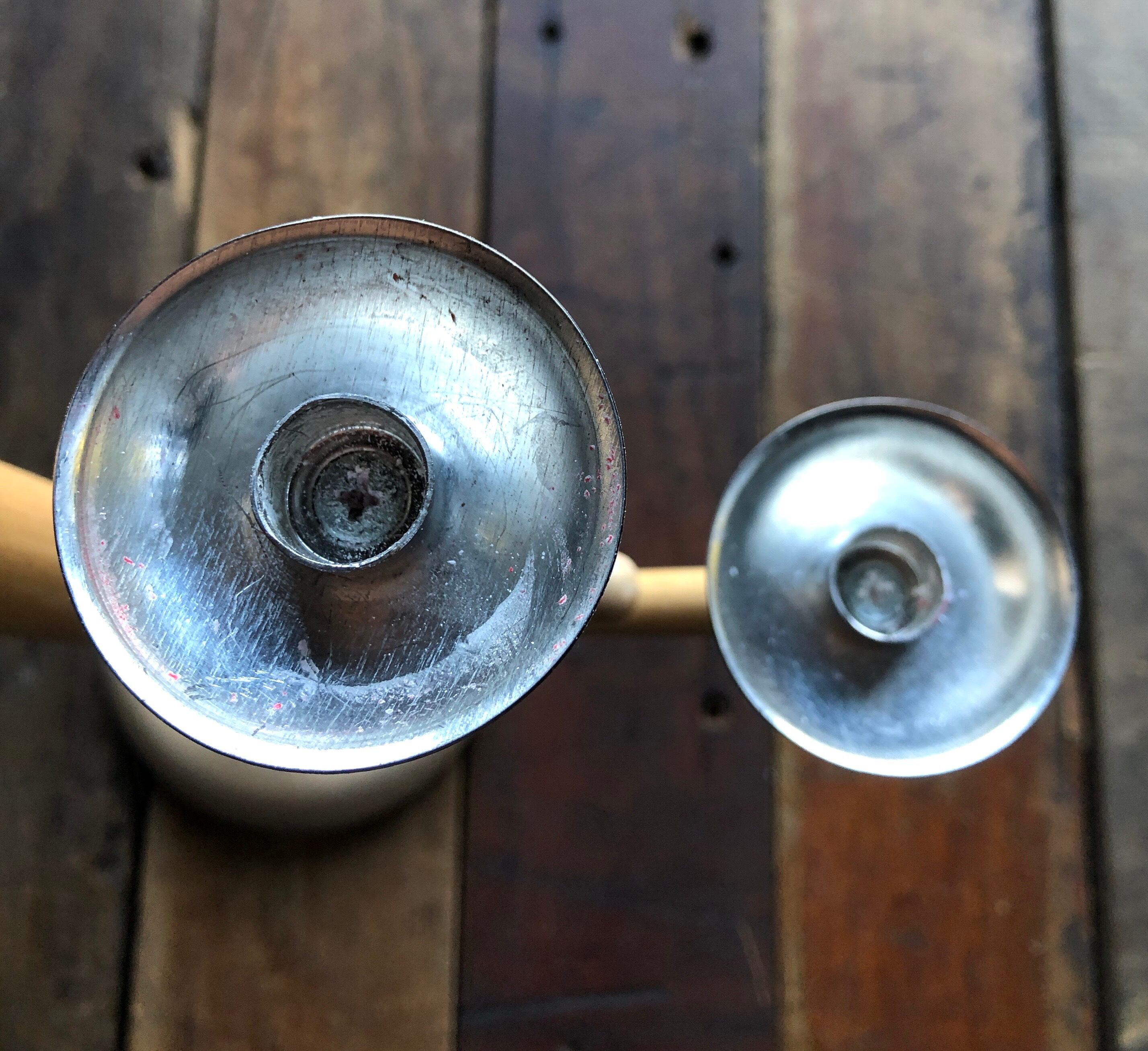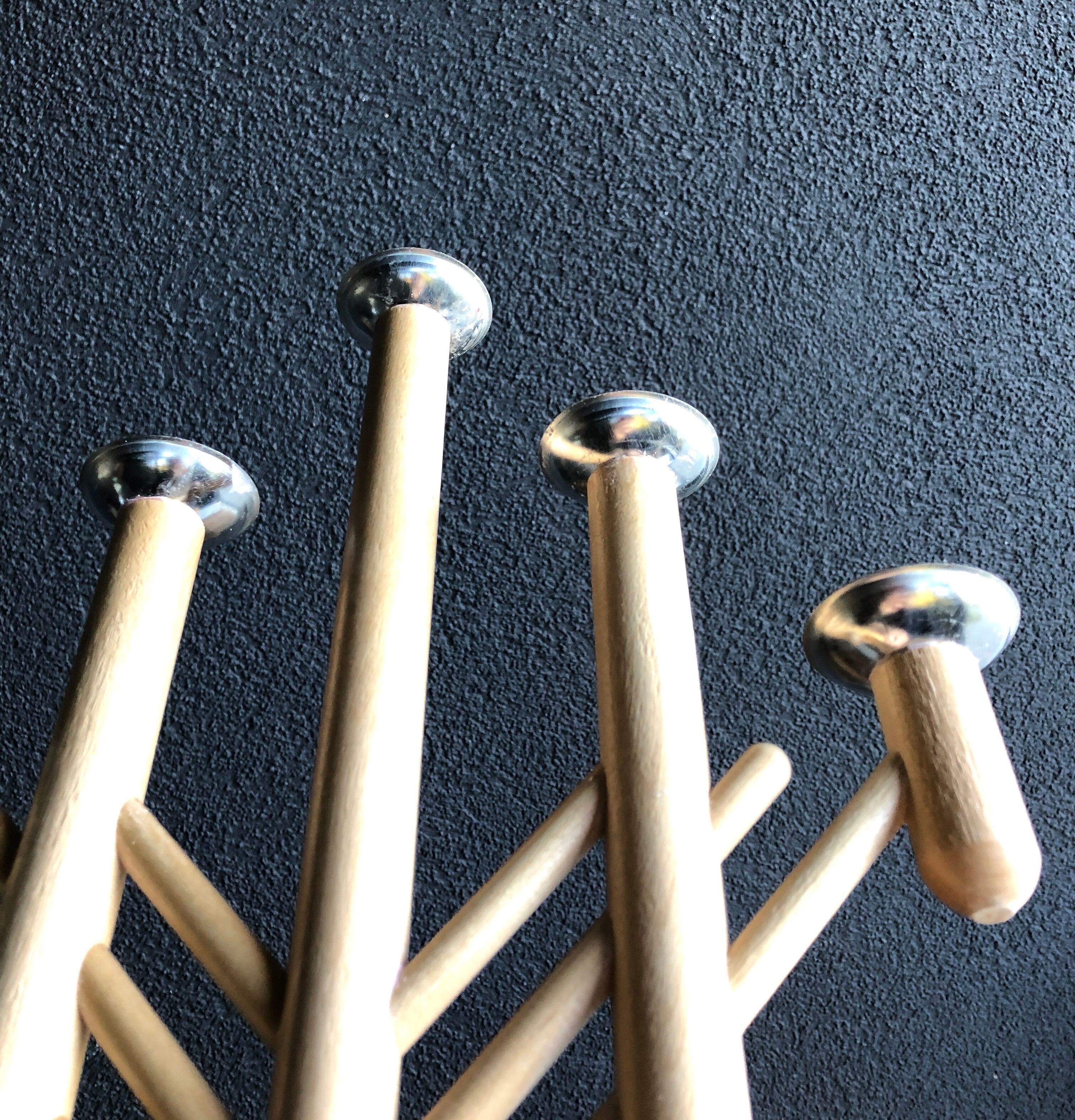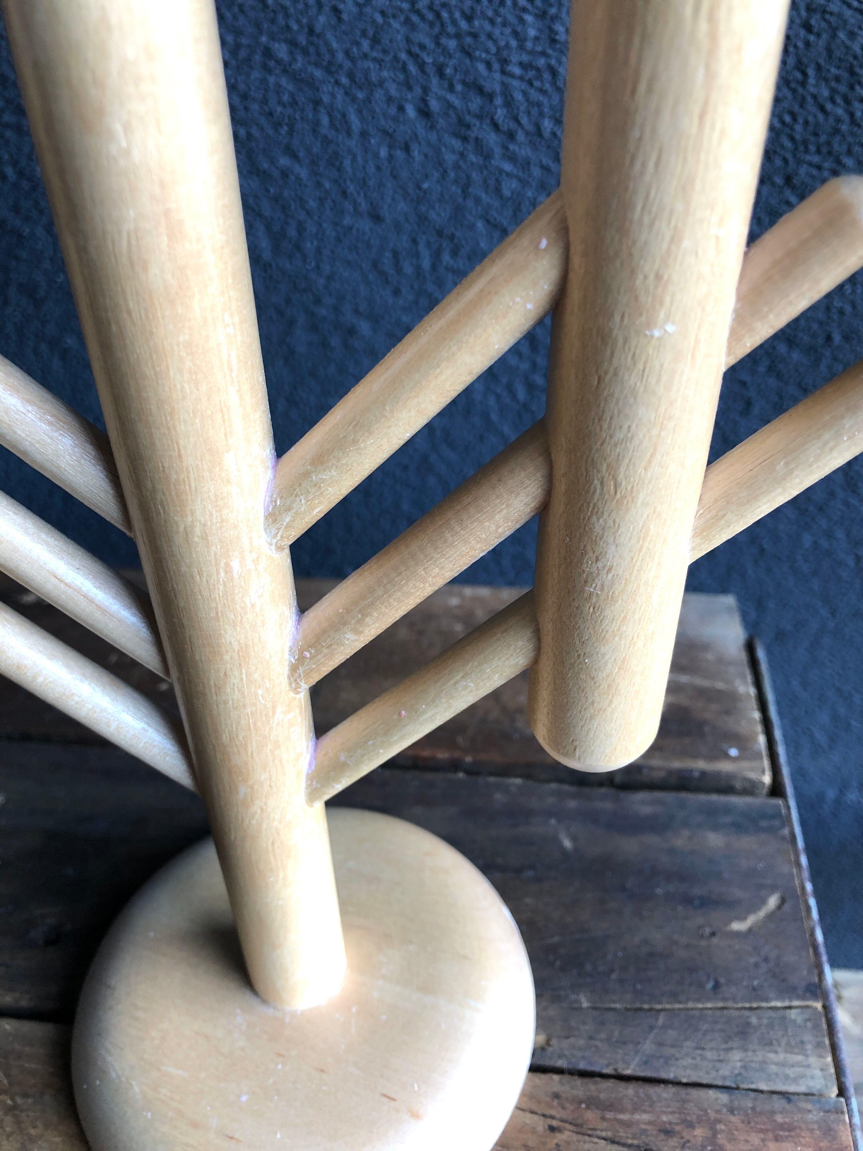 段々シンメトリーのキャンドルホルダーはどこに置いても様になる雰囲気を放っています。丸ベースからセンター支柱。その支柱から手が伸び長さの異なる棒状パーツを使って左右対称の階段状を形成しています。ベースと支柱は全て木製でキャンドル受皿はブリキ素材のような金属製です。センター支柱はベースの裏からネジ留めされ、5つの受皿もネジ留めされています。木の温もりと異素材の金属を上手に組み合わせたアーリッカらしいキャンドルホルダーは大き過ぎず小さ過ぎない佇まいです。