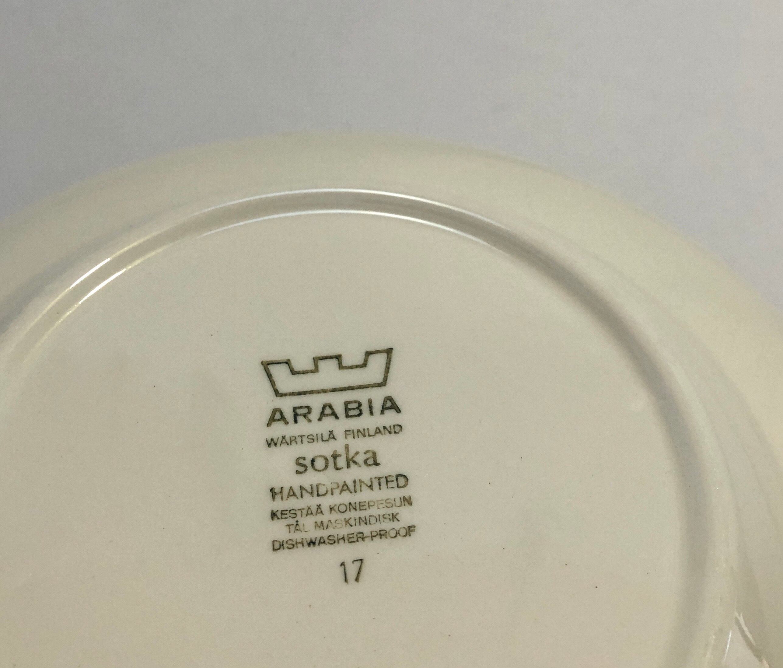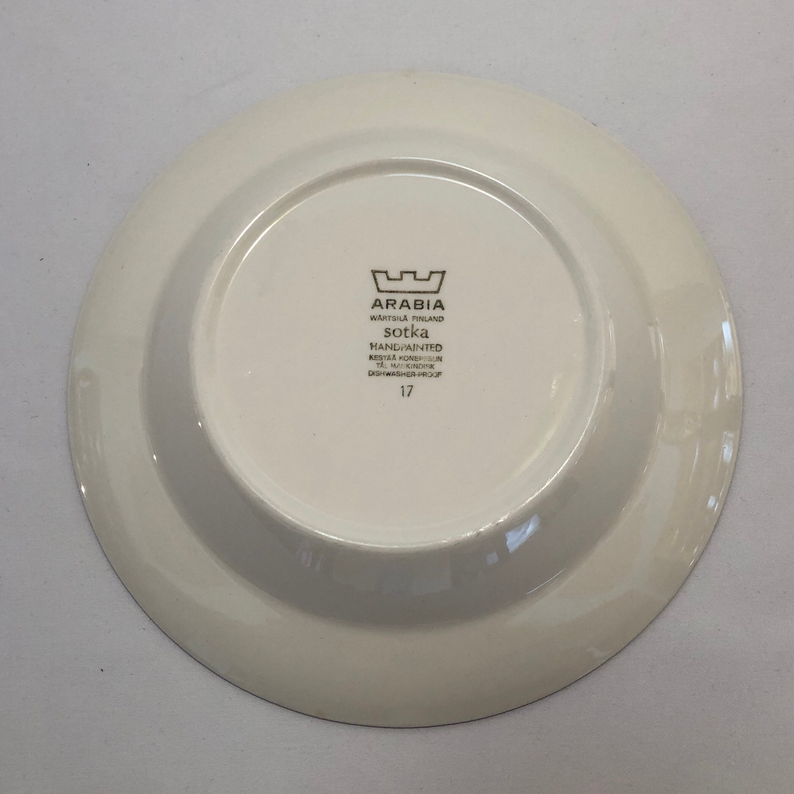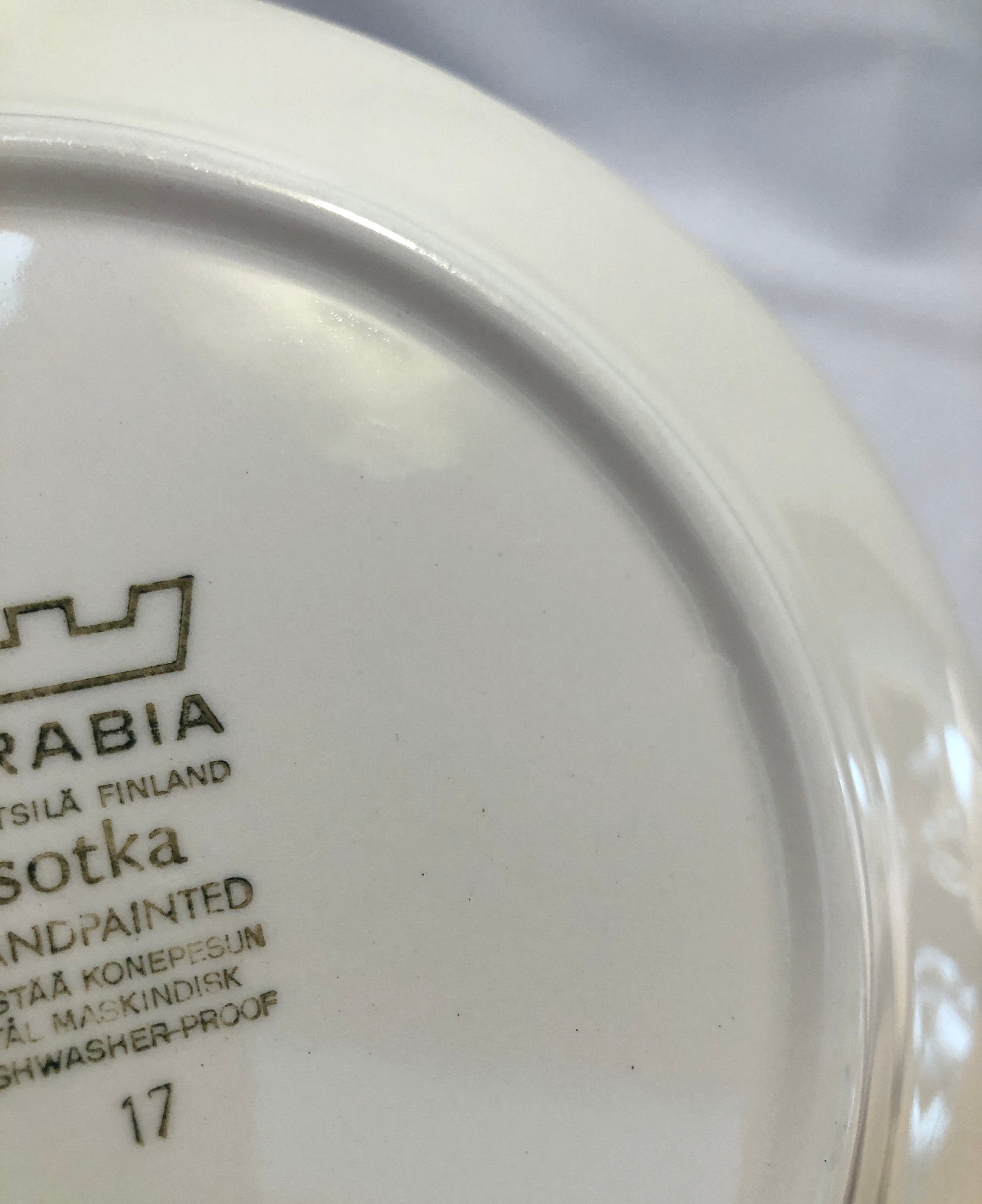 細かな擦れ、小キズや微細キズ、座のくすみなど多少見られはするものの、いずれも目立つ跡ではなく概ね綺麗な状態と言えます。ARABIAの旧ロゴバックスタンプが記されています。※焼成時の支柱跡はいくつか見られる状態です。