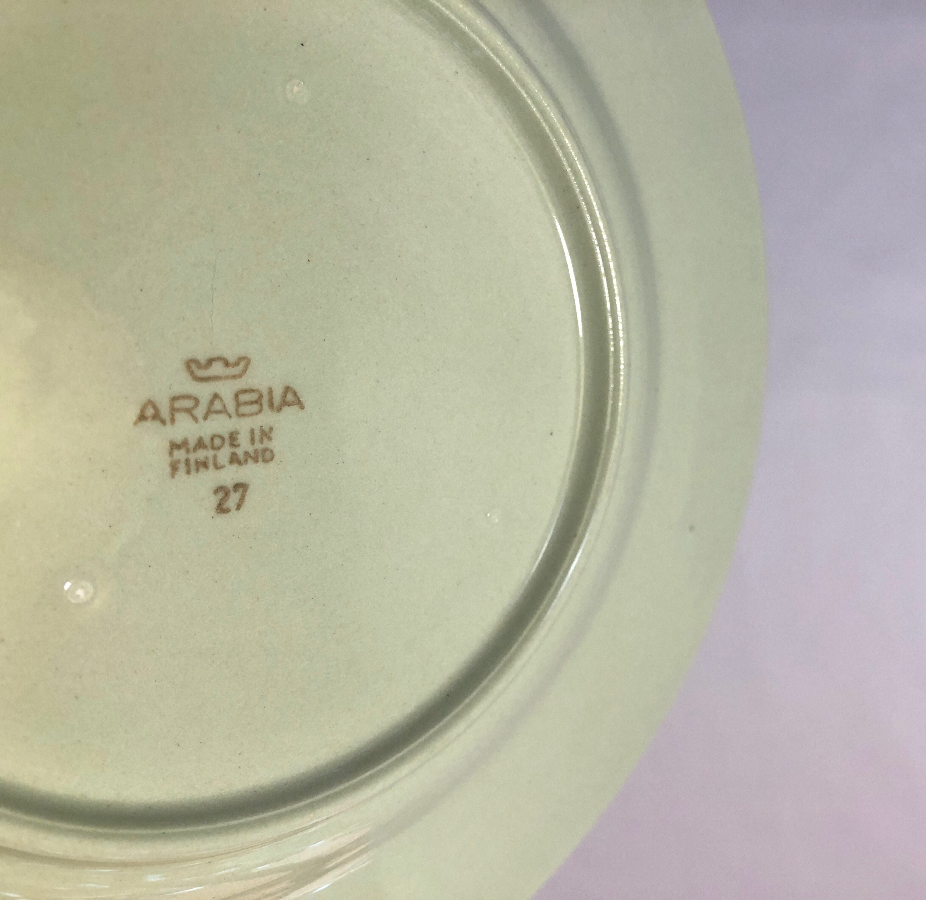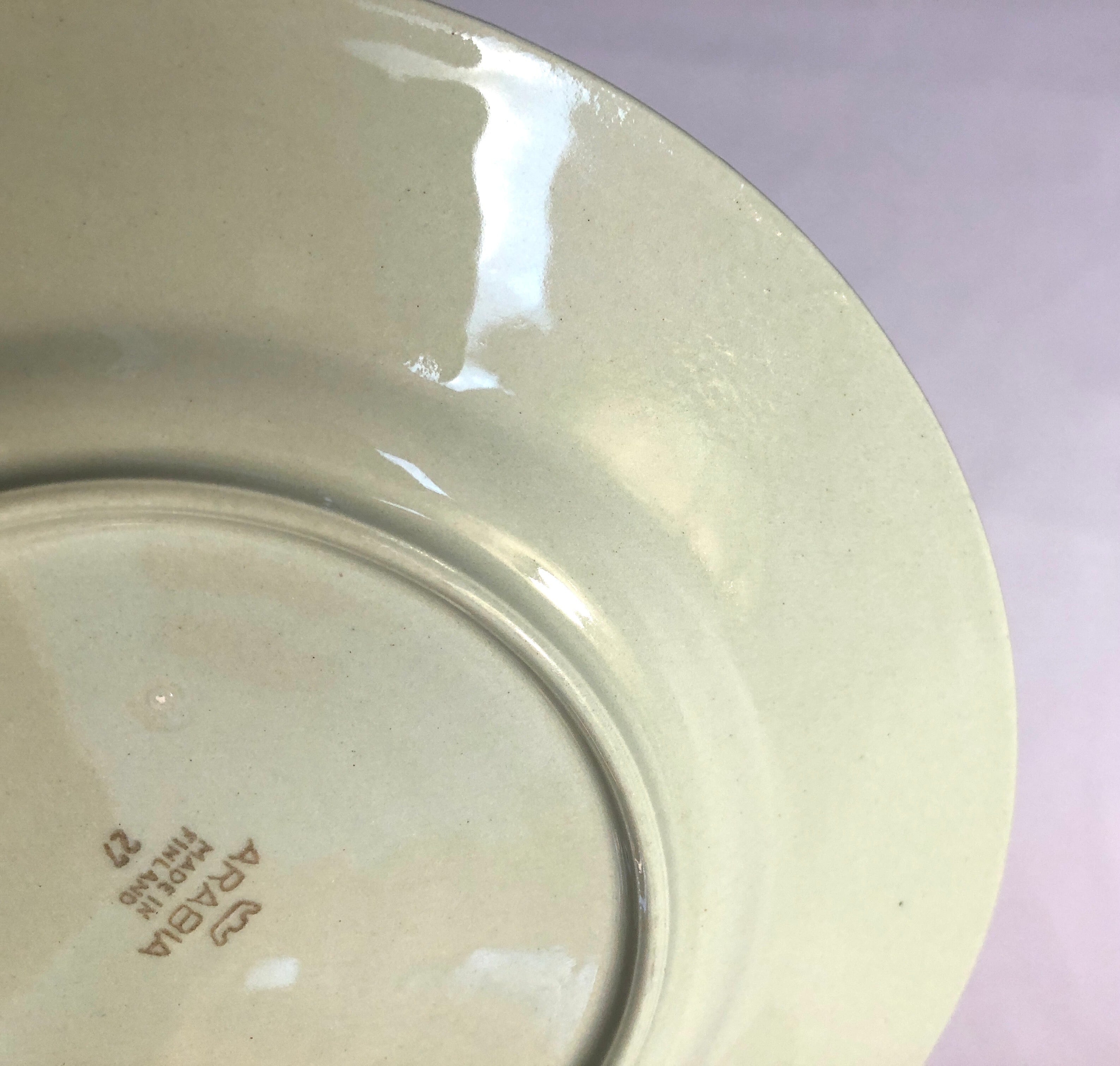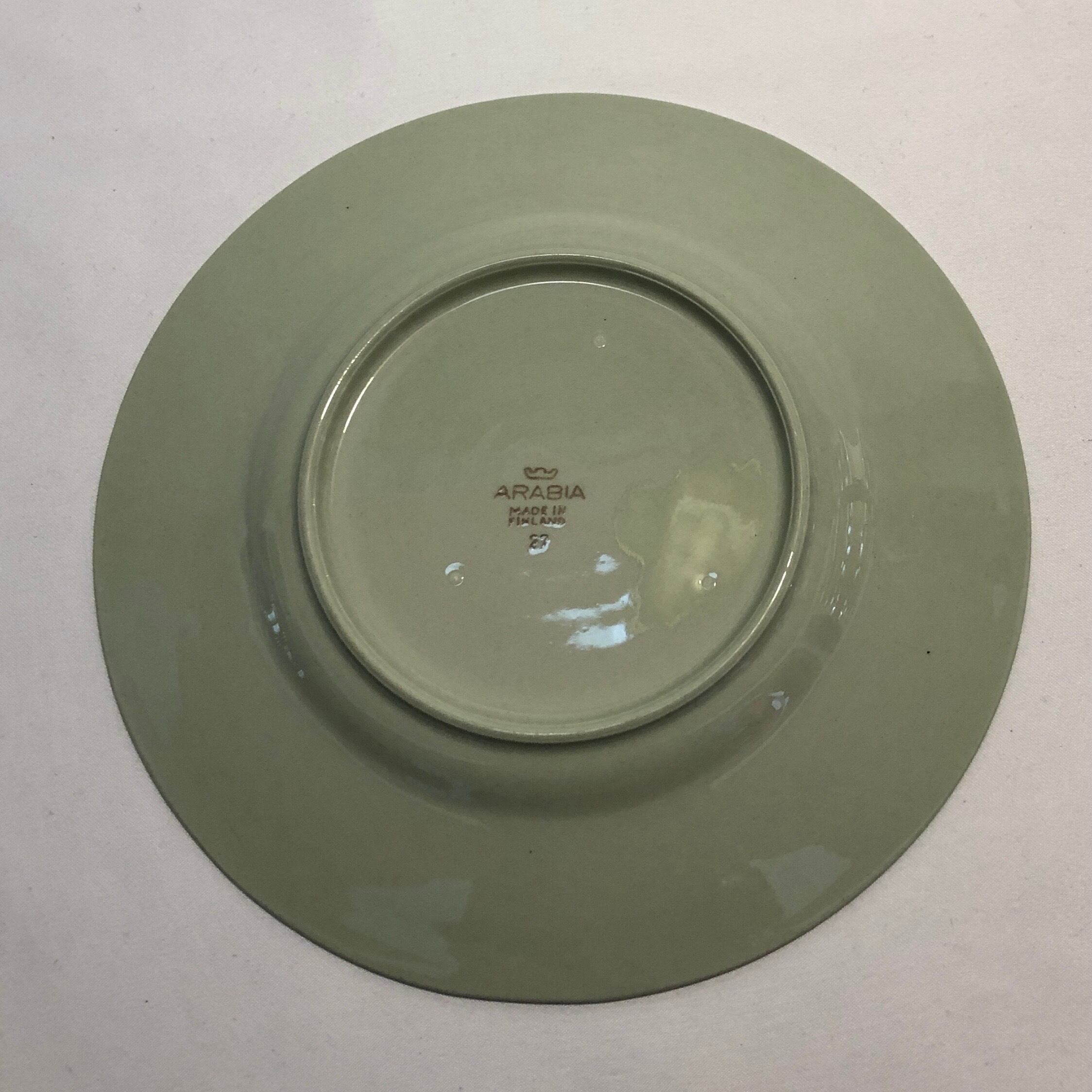 釉薬ムラ(画像7)、細かな擦れ、微黒点跡など少し感じる箇所はあるものの概ね良好な状態と言えます。ARABIA 旧ロゴバックスタンプが記されています。※焼成時の支柱跡は少し見られる状態です。