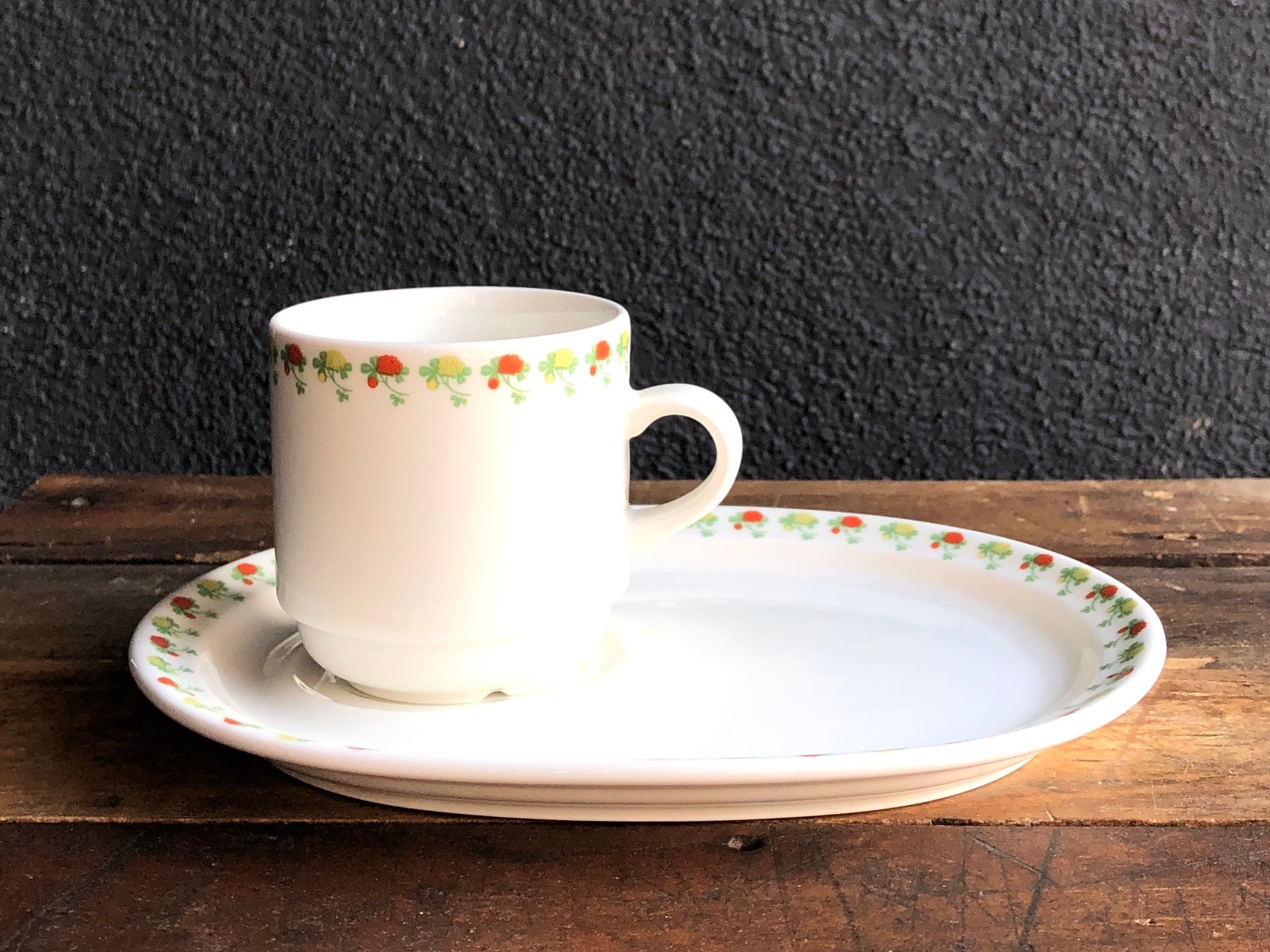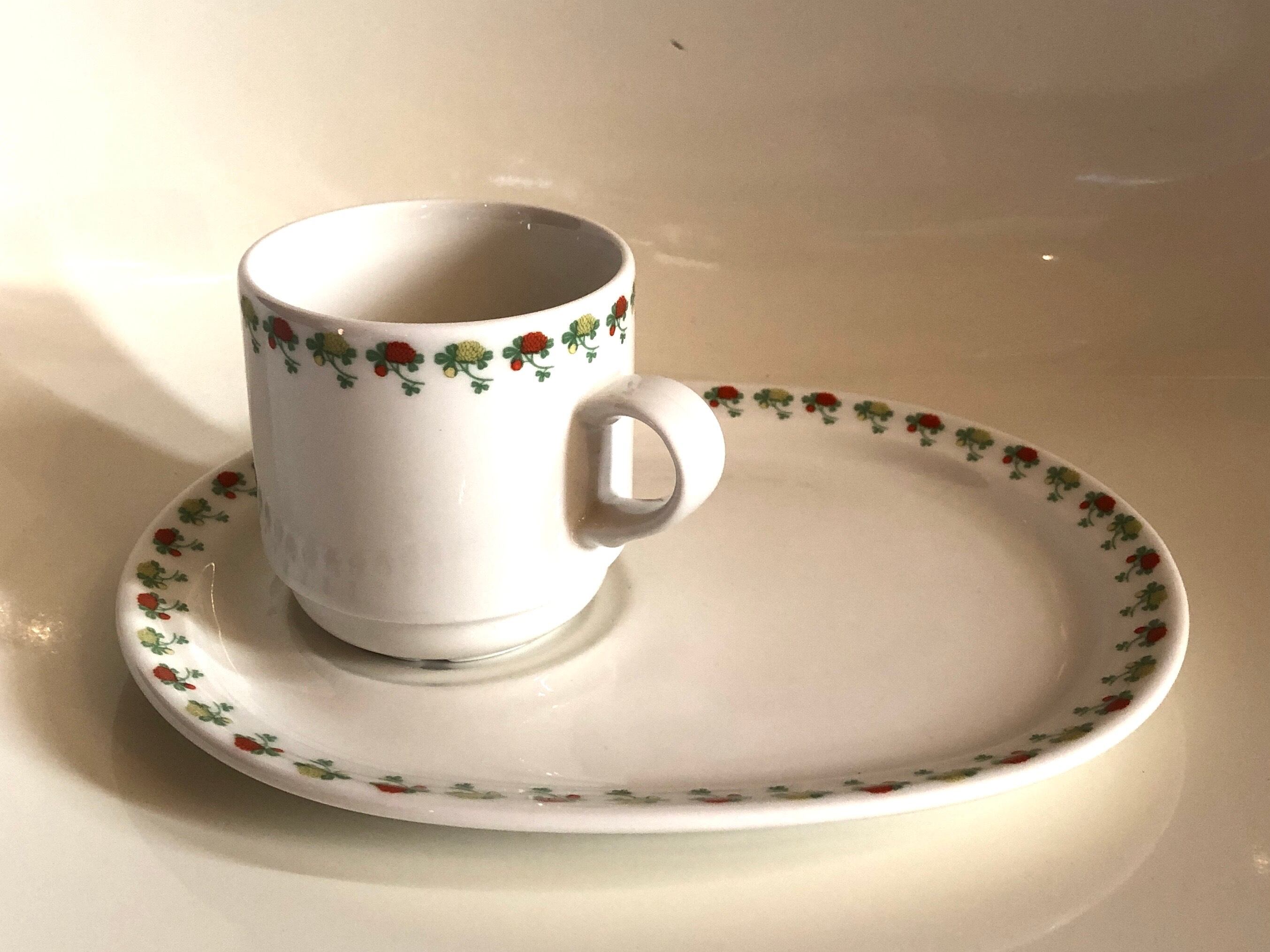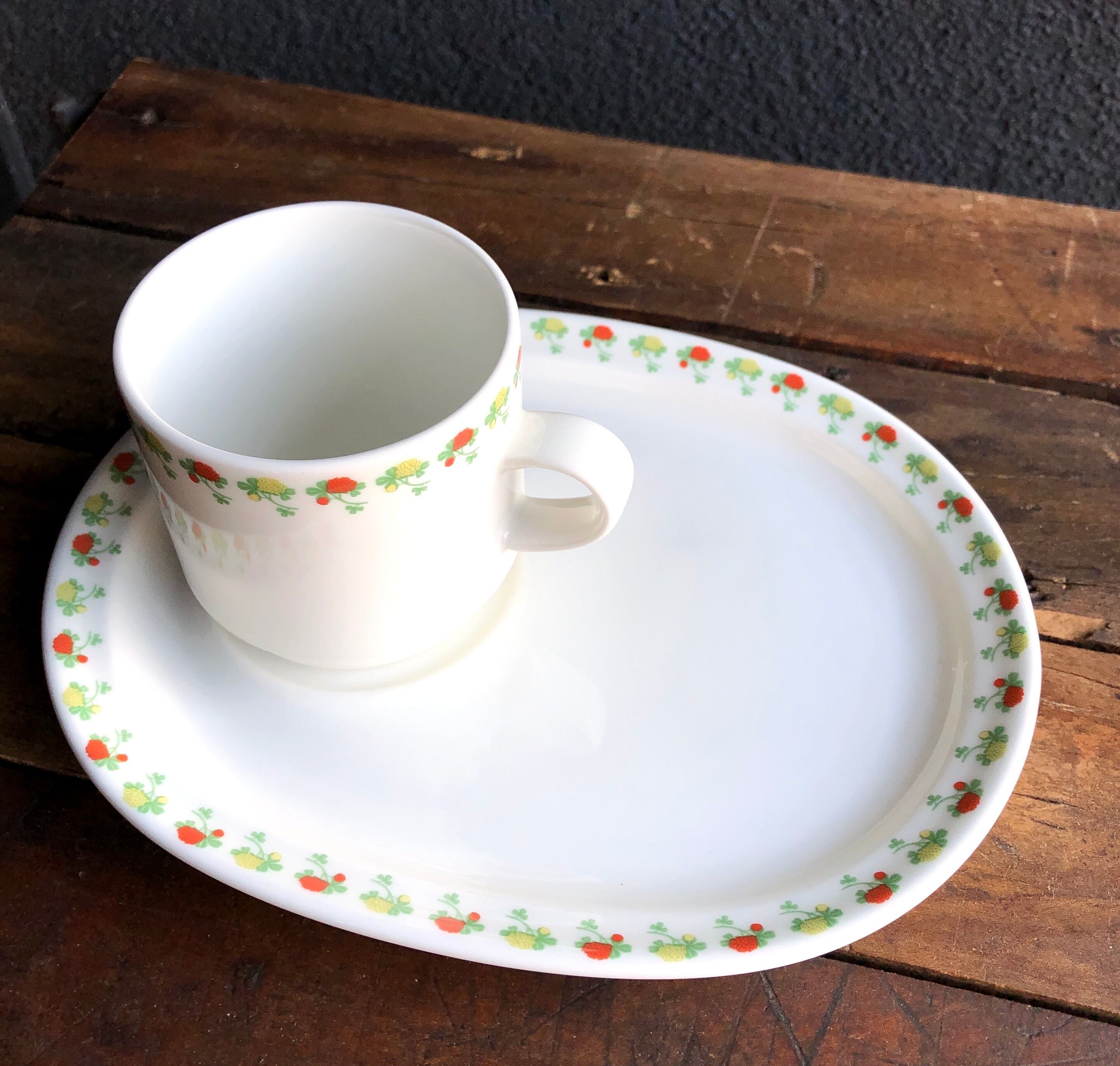 Forteは1980年代 Jussi Ahola(ユッシ・アホラ)によって白無地をベースに様々なデコレーションに機用されたハブ的なシリーズといった印象が強い作品です。これはベースの使い勝手がお墨付きだからこその展開であると言わざるおえません。今回は Plate & Mug(TVセット)/ スナックセットで楕円形プレートの定位置にマグカップをセットし、そのままリビングにテレビを見に行ける大変機能的なセットで、日本ではとても珍しくARABIAの中でも珍品シリーズと言え、とても丈夫で扱い易い扱いことから、小さなお子様のワンプレートとしても活躍してくれそうです。