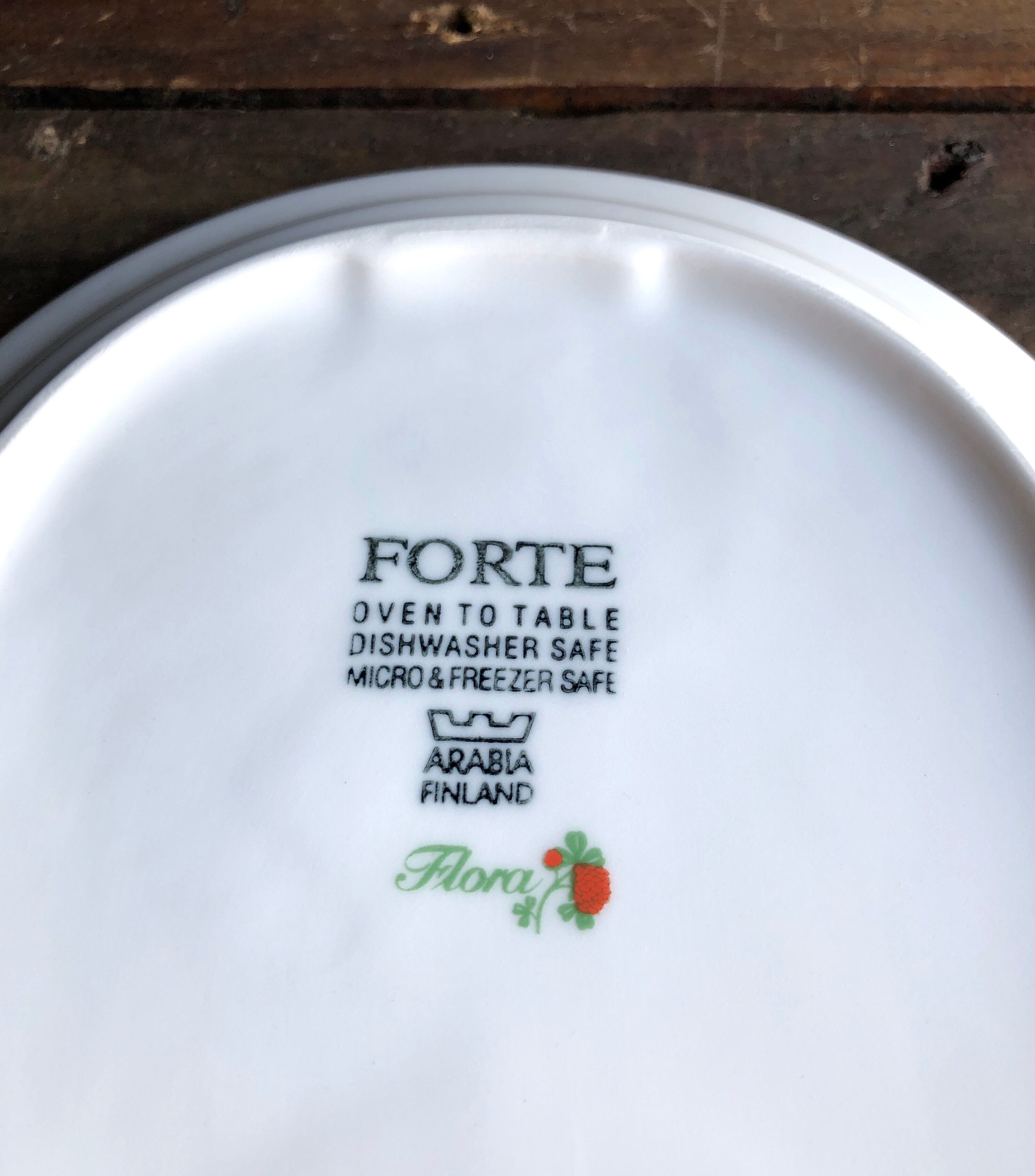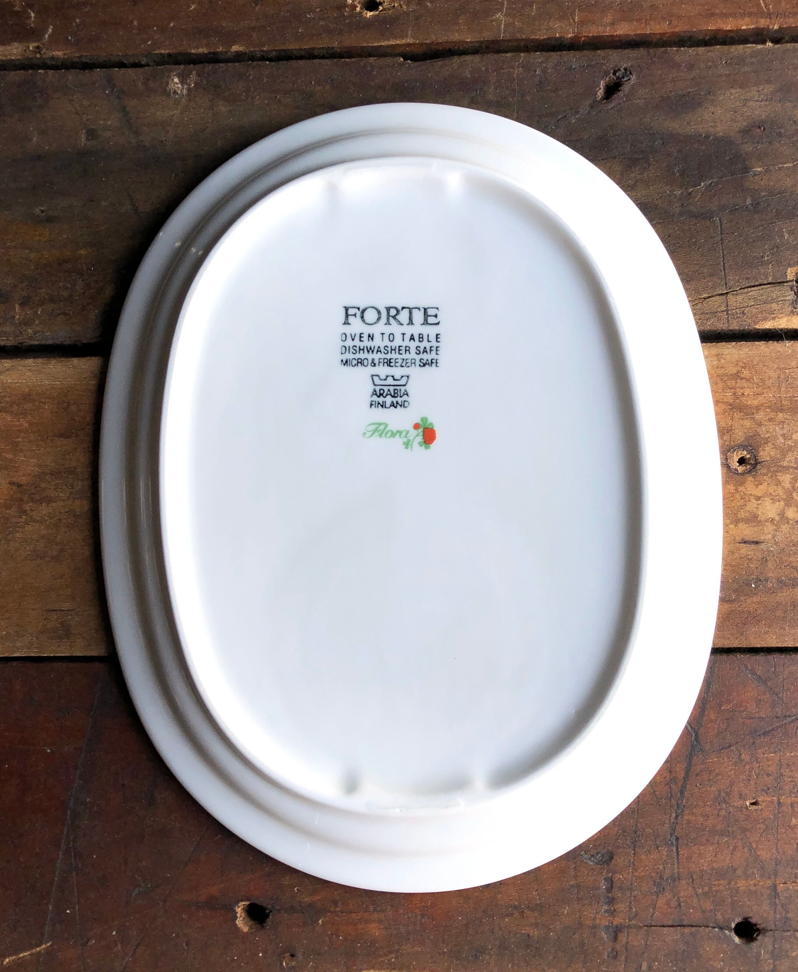 細かな擦れや小さな水跡、座のくすみなど見られる箇所はあるものの概ね良好な状態と言えます。ARABIA FINLAND Forte "Flora" バックスタンプが記されており、オーブン・電子レンジ、食洗機、冷凍保存可能とされています。