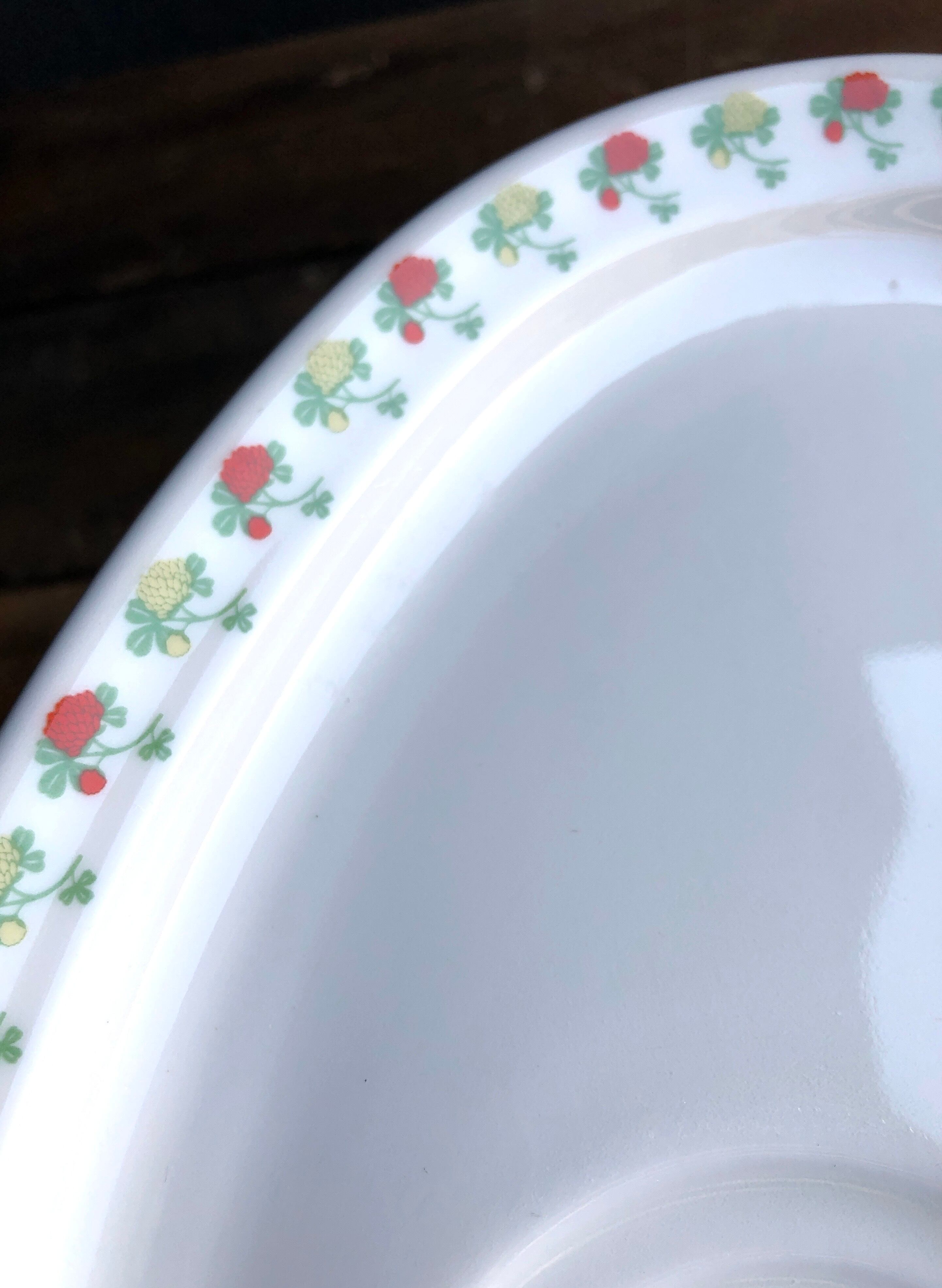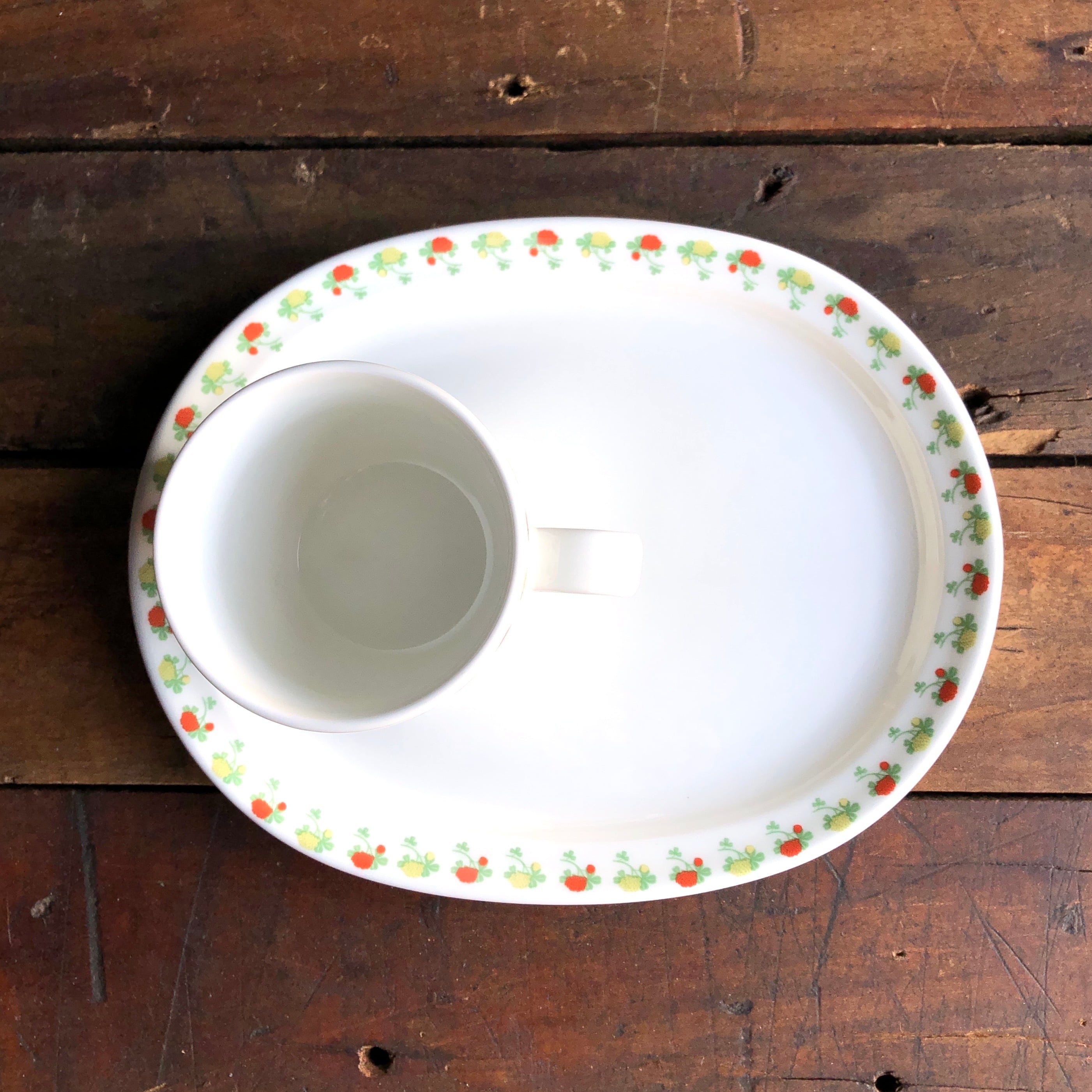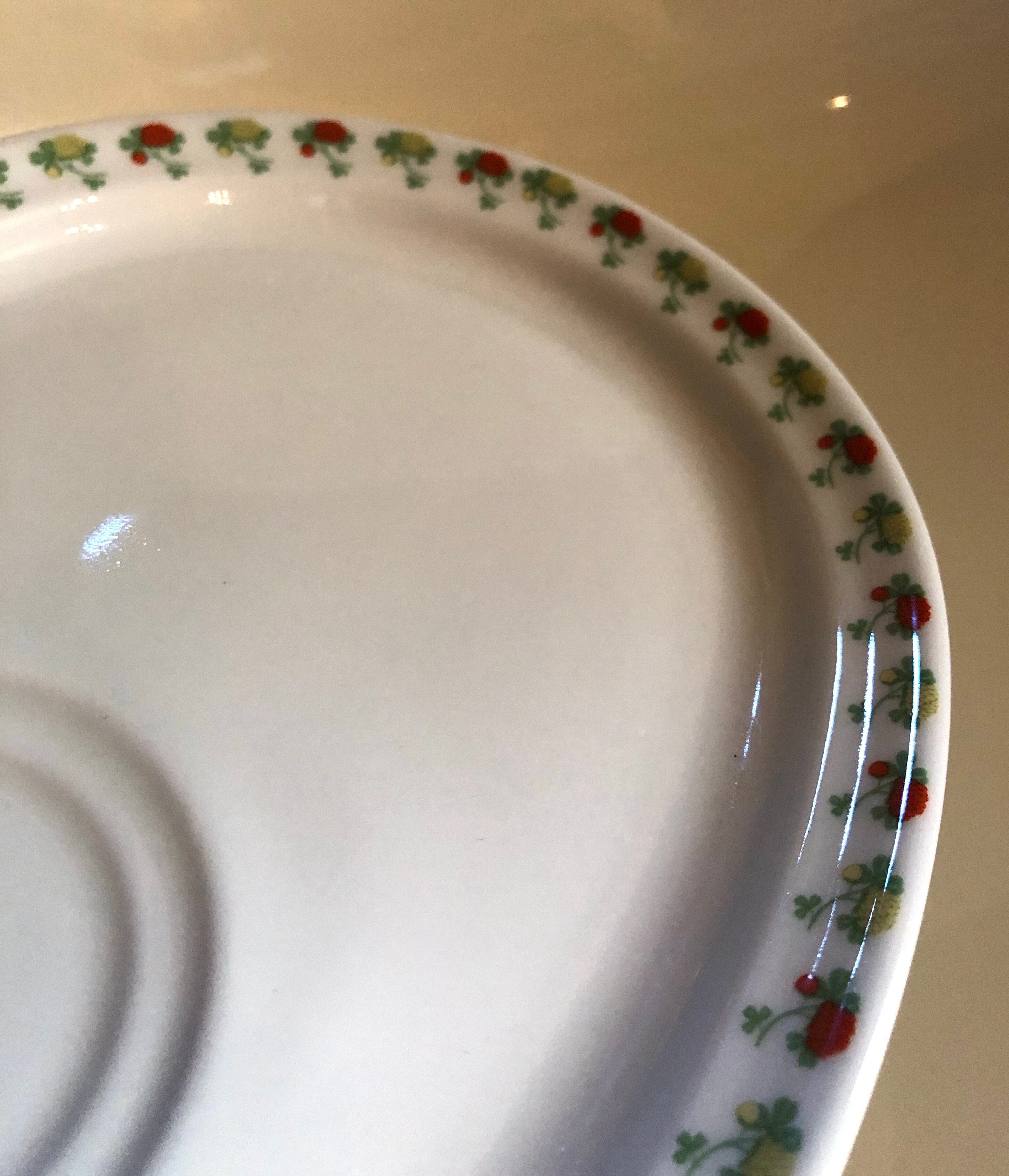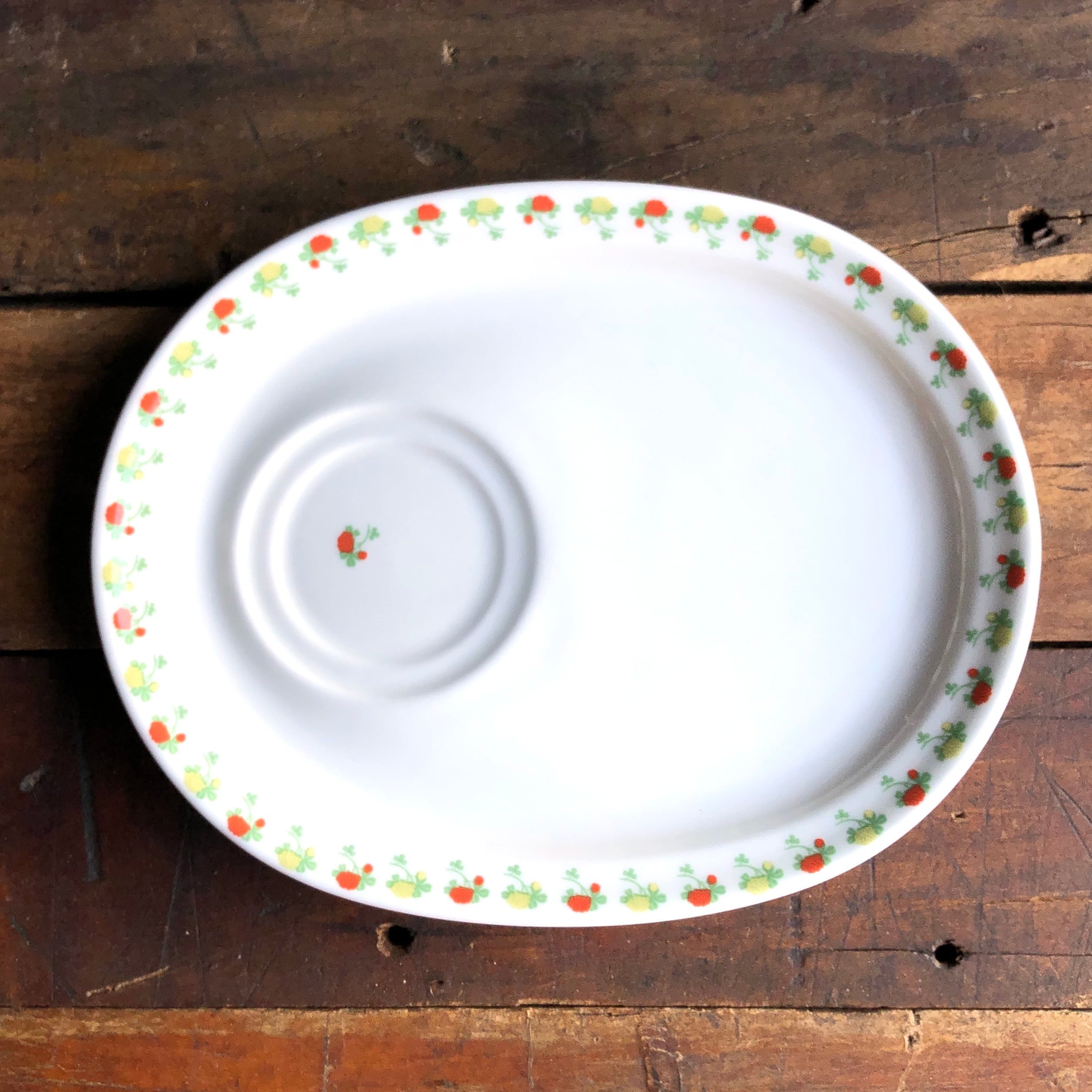 楕円形で多少深さのあるプレートのリムエリアにお花達が色味交互に描かれ、定位置にマグをセットする2輪の凹みが用意され、その2輪内には一輪のお花(オレンジ)がワンポイントで描かれています。カップやカトラリーが接触する箇所などに細かな擦れやキズなど(画像10-12)の使用感は多少見られる箇所はあるものの、いずれも気に障るような目立つ跡ではなく比較的綺麗な状態と言えます。