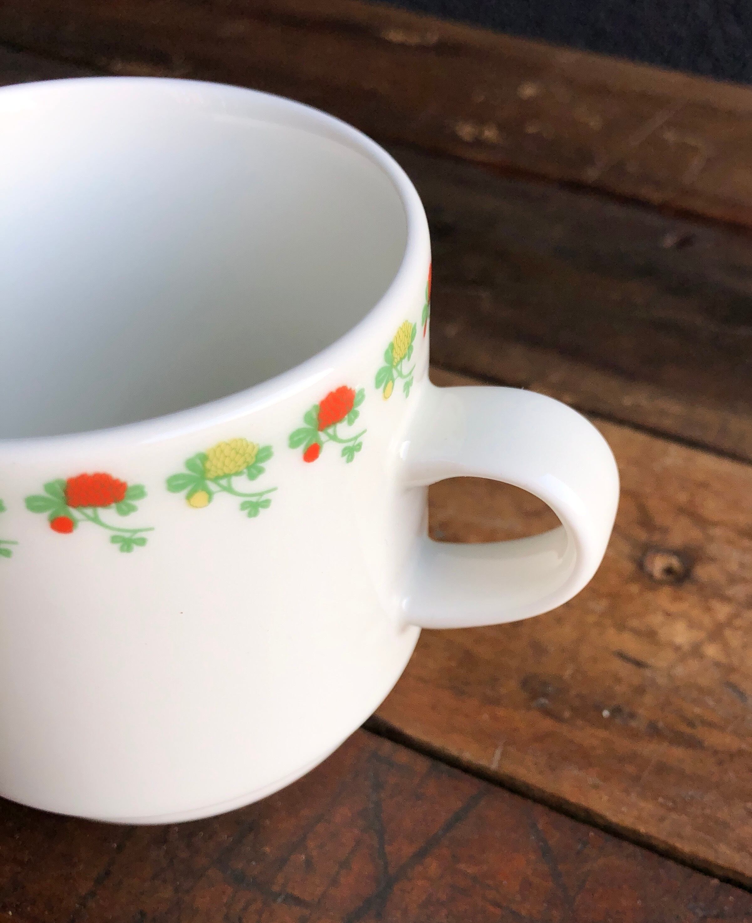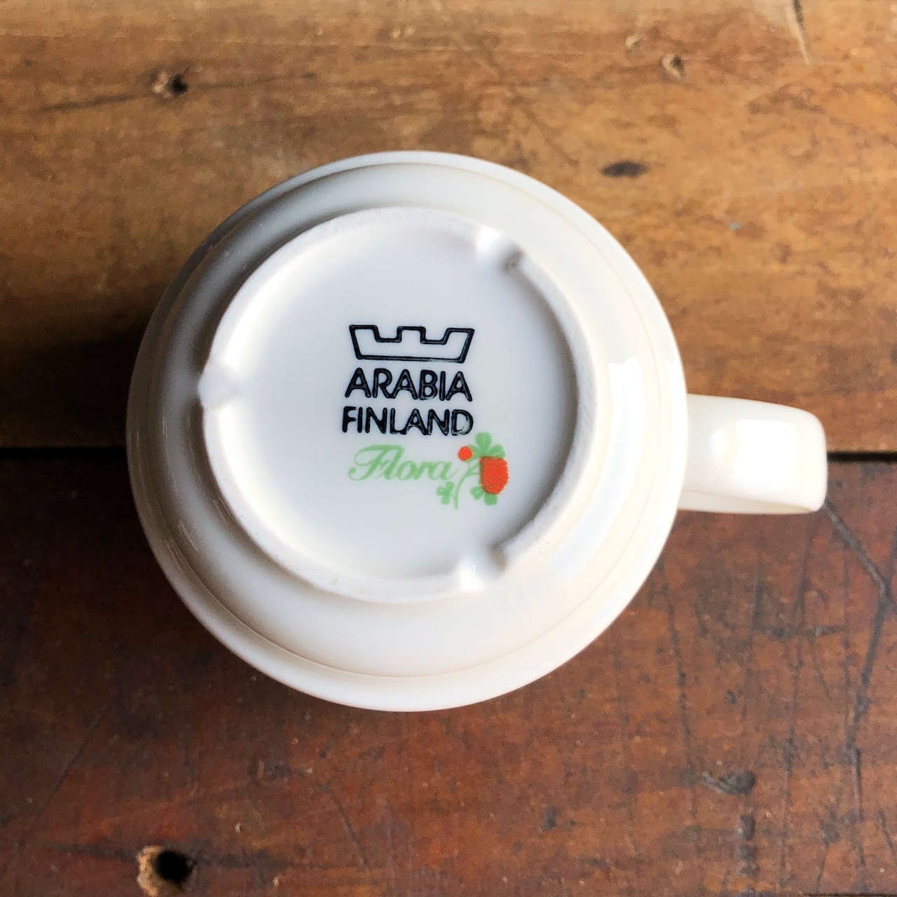 細かな擦れ、座のくすみなど薄っすら少し感じる程度で概ね良好な状態と言えます。スタッキング仕様で、高台が3分割されているのは洗った時に水切れを良くする知恵的デザインと言われています。ARABIA FINLAND "Flora" バックスタンプが記されています。