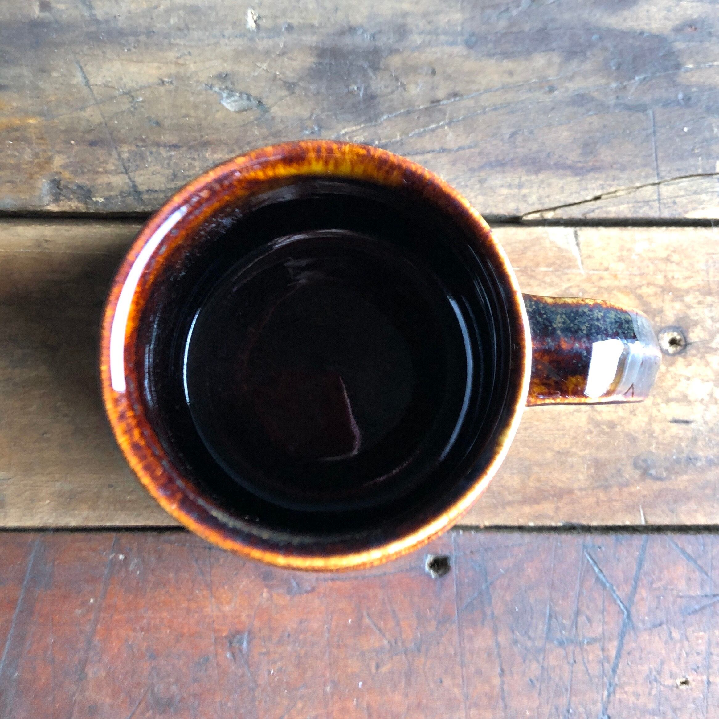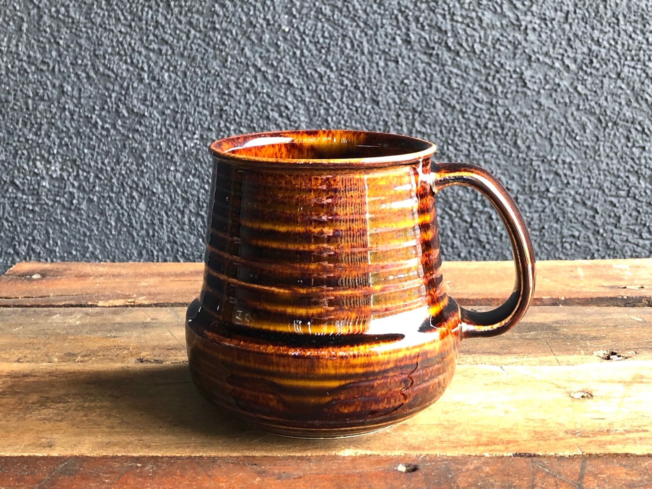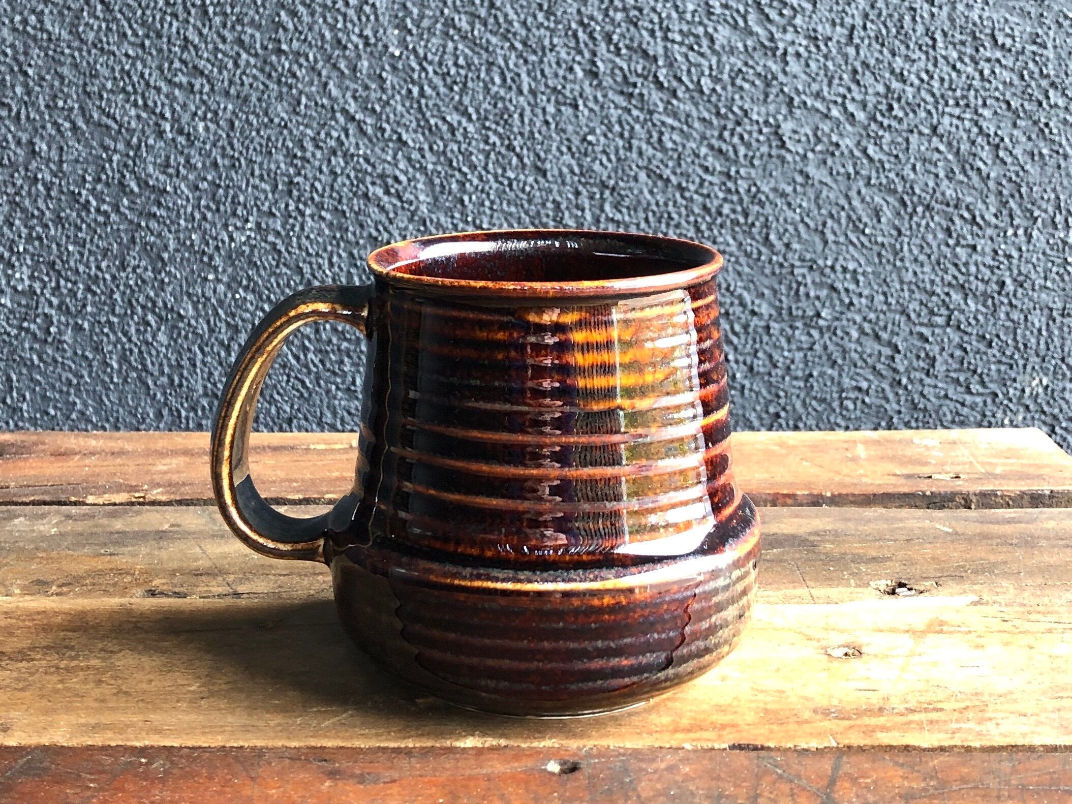 口の部分から緩やかな末広がりで突然隆起したフォルムがどっしりと腰を据えた安定感をもたらし、表面は程良く波打っております。このサイズ感に相応しい大きな持ち手がハンドリングにも優れ、ツヤ感のある濃淡茶色の積層になった縞模様が大変味わい深く、ボテッと肉厚でありながら野暮ったさを微塵も感じさせない個性的なマグカップをお楽しみいただけます。細かな擦れなど(画像5,6)少し感じる程度で概ね良好な状態と言えます。※独特の釉薬ムラは出ている箇所があり、ペン先程の小さな凹跡などは焼成時の跡になります。