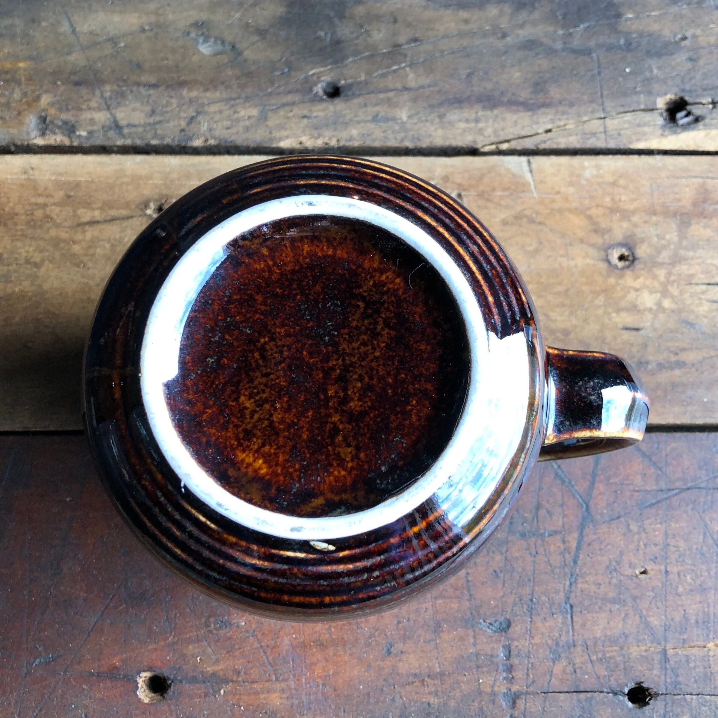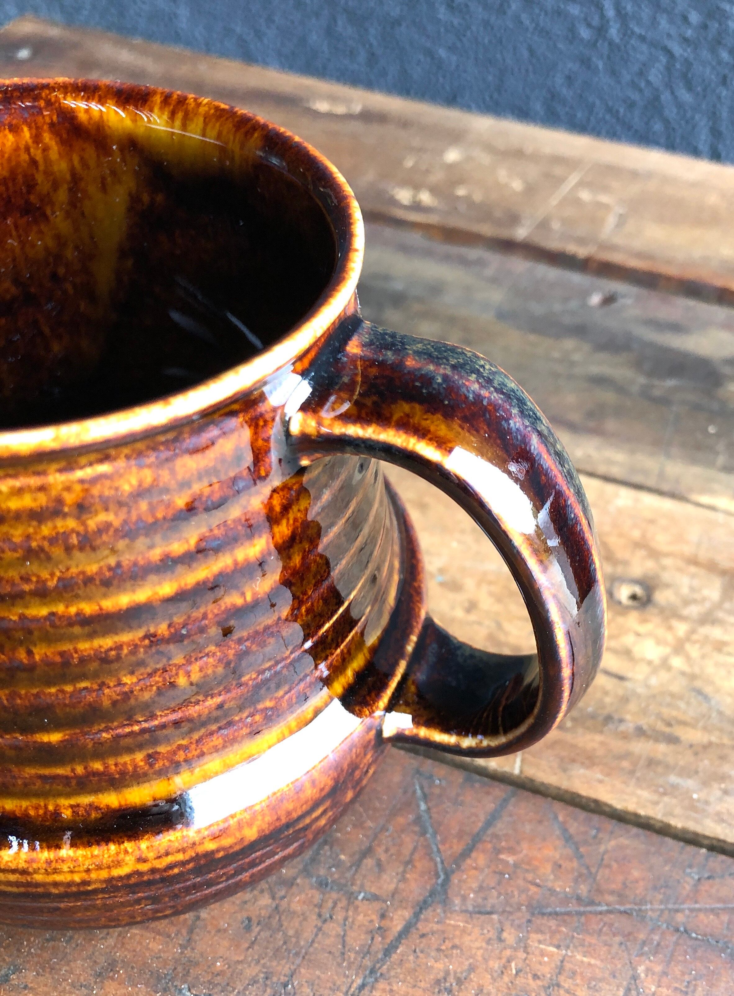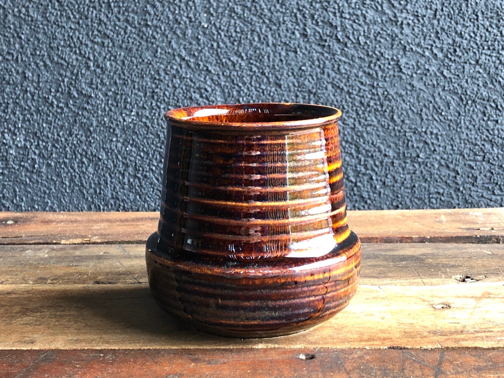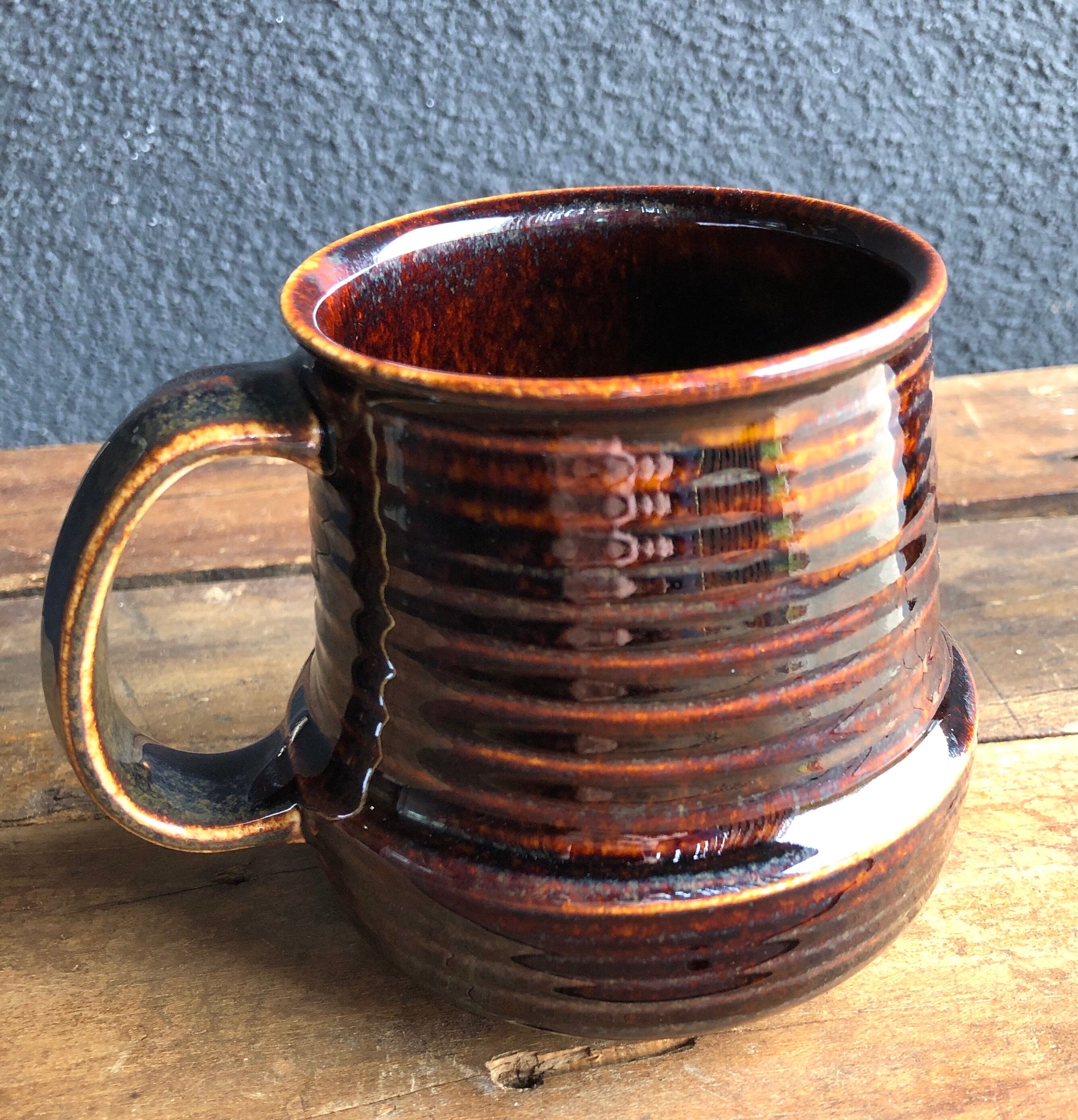 口の部分から緩やかな末広がりで突然隆起したフォルムがどっしりと腰を据えた安定感をもたらし、表面は程良く波打っております。このサイズ感に相応しい大きな持ち手がハンドリングにも優れ、ツヤ感のある濃淡茶色の積層になった縞模様が大変味わい深く、ボテッと肉厚でありながら野暮ったさを微塵も感じさせない個性的なマグカップをお楽しみいただけます。細かな擦れなど(画像5,6)少し感じる程度で概ね良好な状態と言えます。※独特の釉薬ムラは出ている箇所があり、ペン先程の小さな凹跡などは焼成時の跡になります。