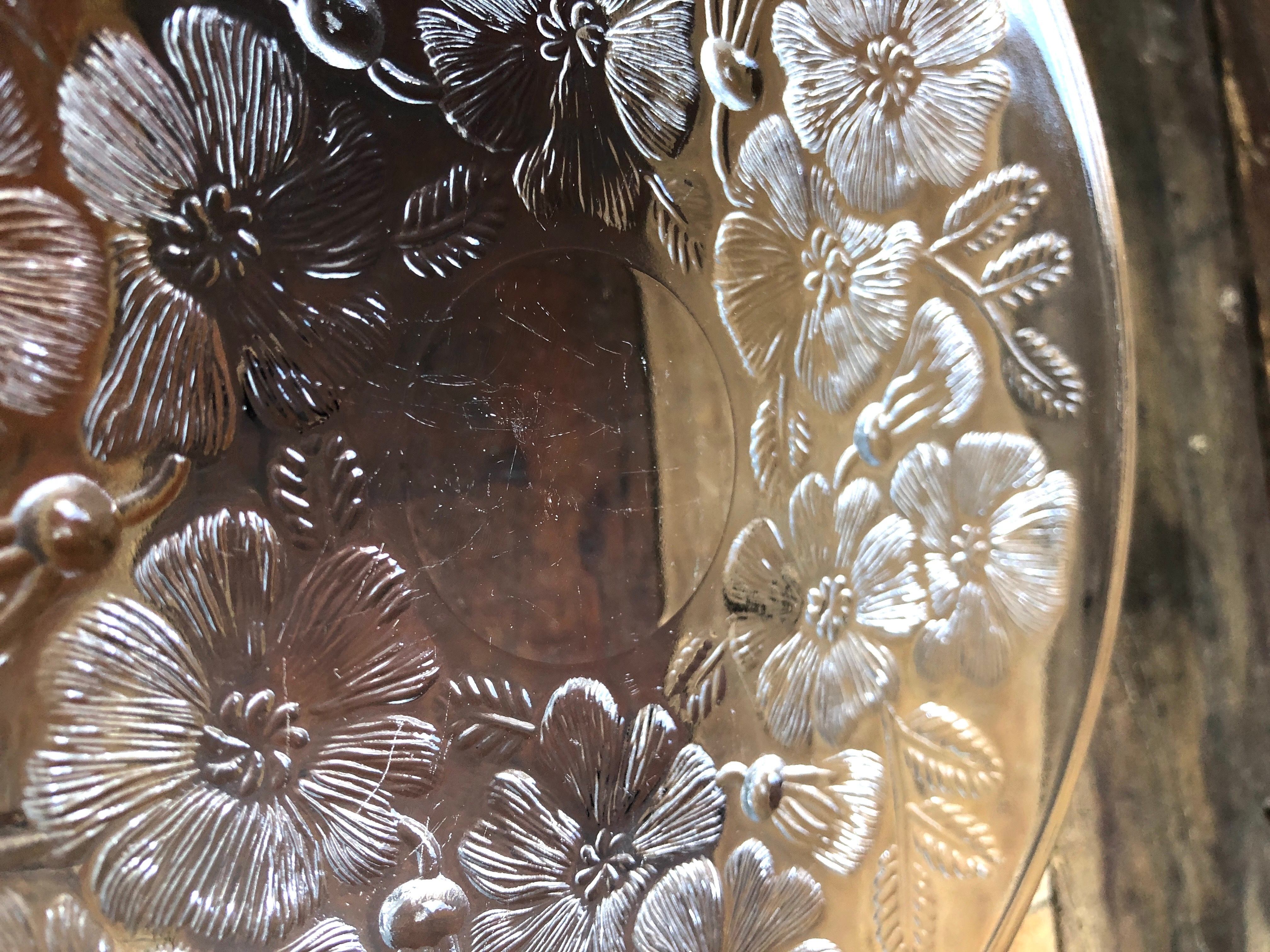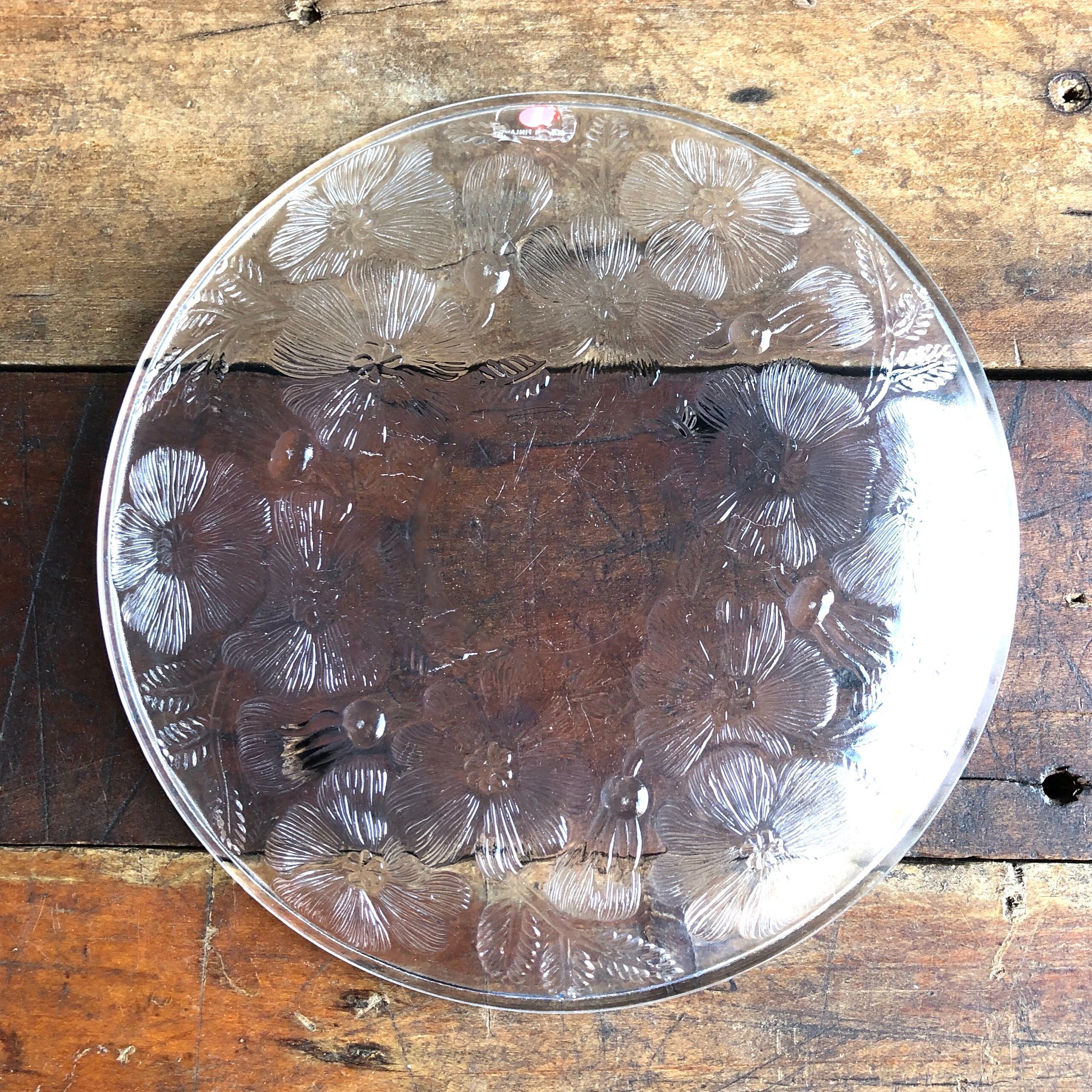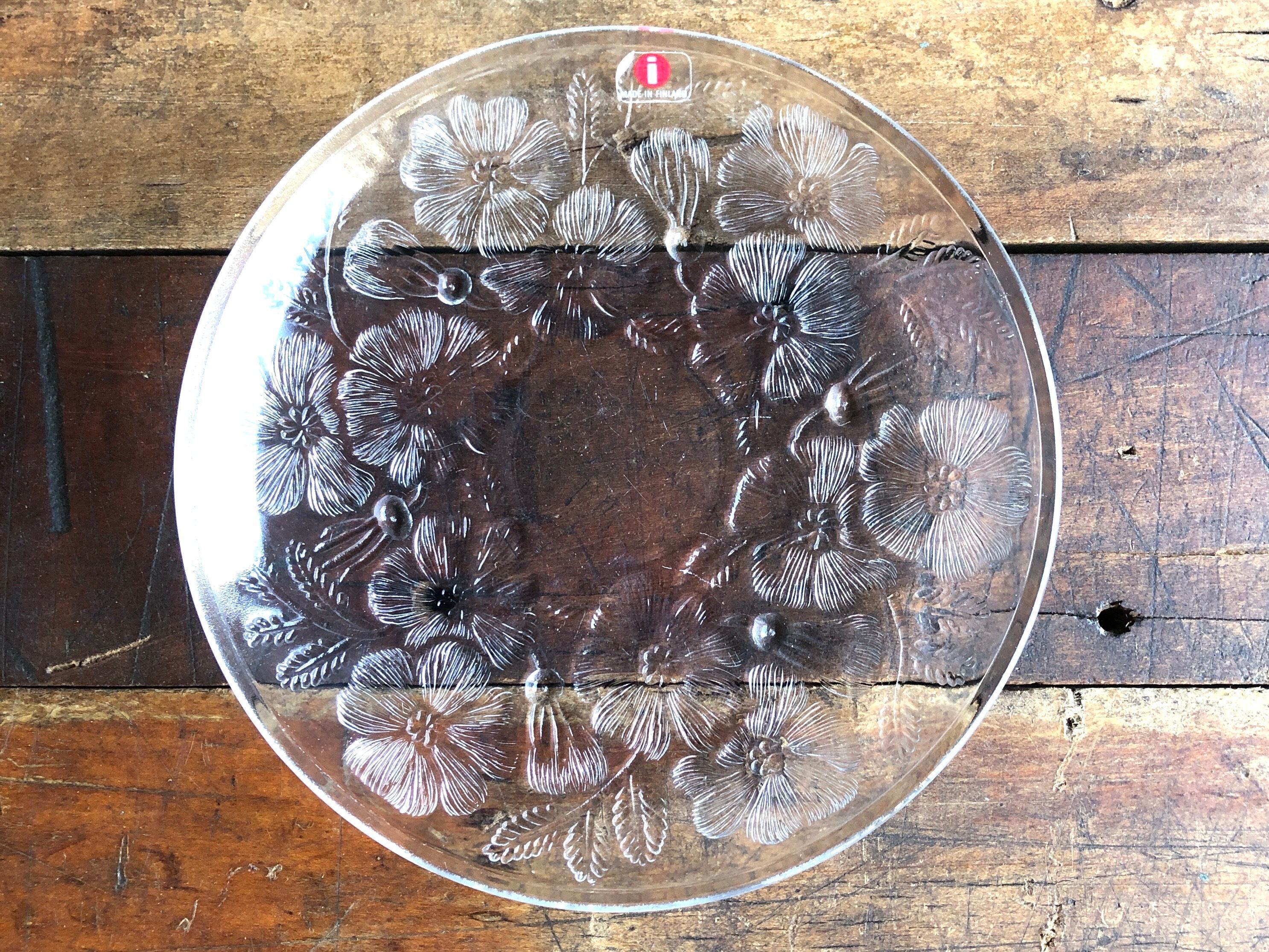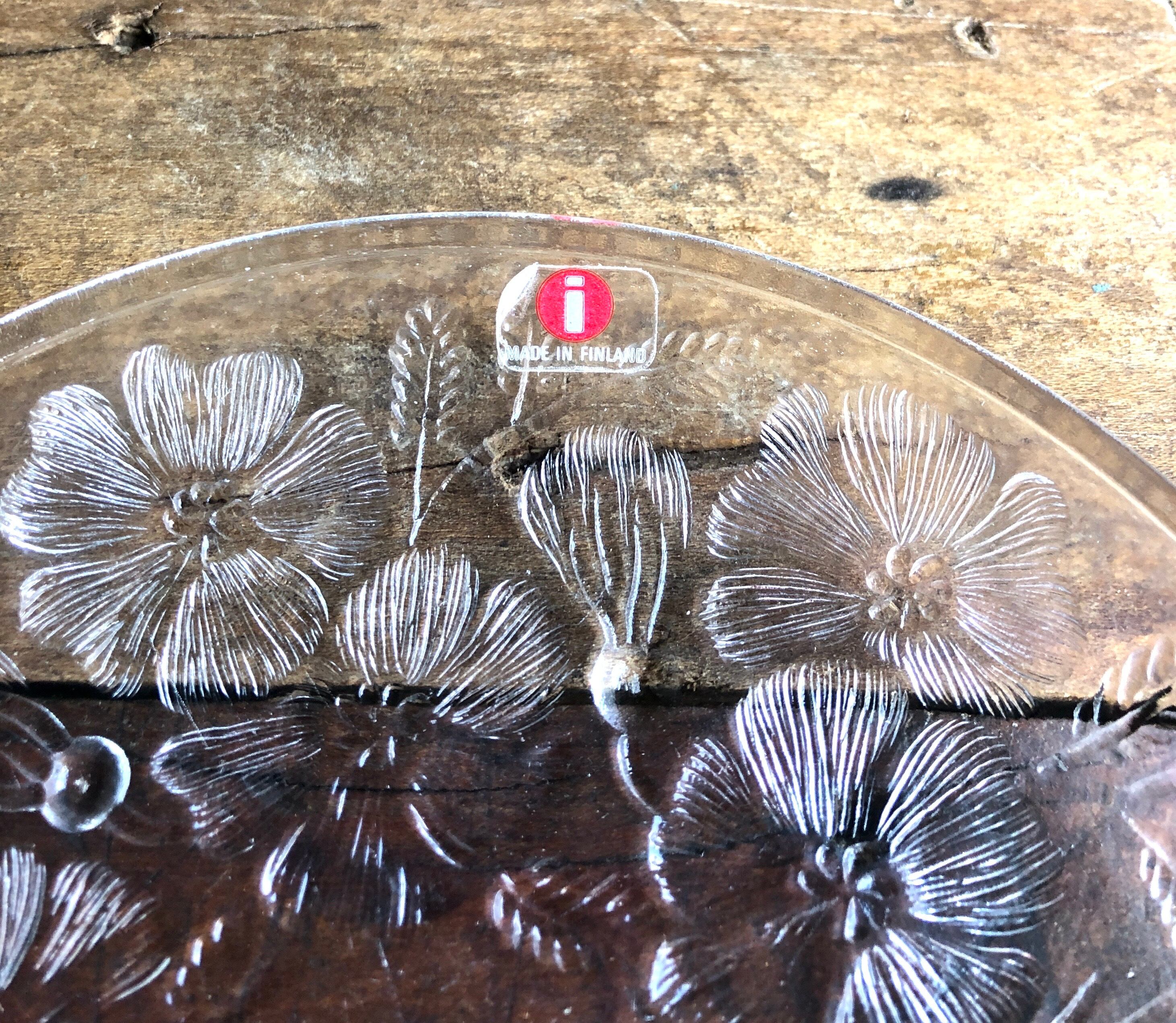 リアル度の高い美しい花々が裏面にエンボス加工(絵柄などを浮き彫りにする加工方法のこと)されています。カトラリー跡と言える細かな擦れや細キズなど(画像4)多少見られる箇所はありますが比較的綺麗な状態と言えます。iittala 旧ロゴシールが残っています。