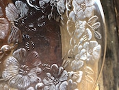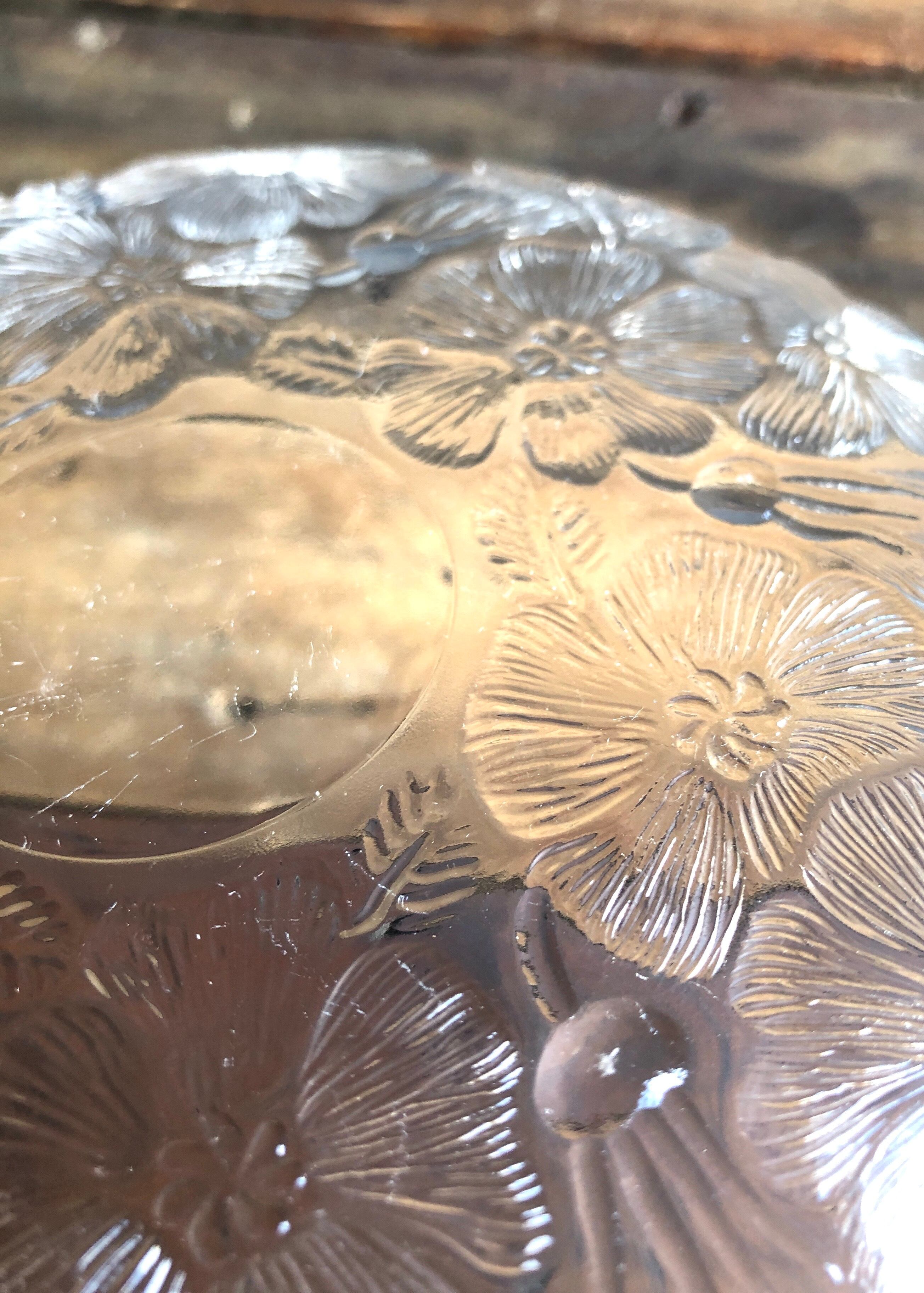 経年による風合いの変化、カトラリー跡と言える細かな擦れや細キズなど多少見られる箇所はありますが、目立つ擦れ、キズ、汚れなど見当たらず、欠けや割れなど見られないことから、時を刻んで来たガラスの器として比較的綺麗な状態と言えます。※ガラス製品特有のゆらぎ、シワやスジ、加工時の小さな気泡やキズ、模様の個体差など出ている可能性はございます。
