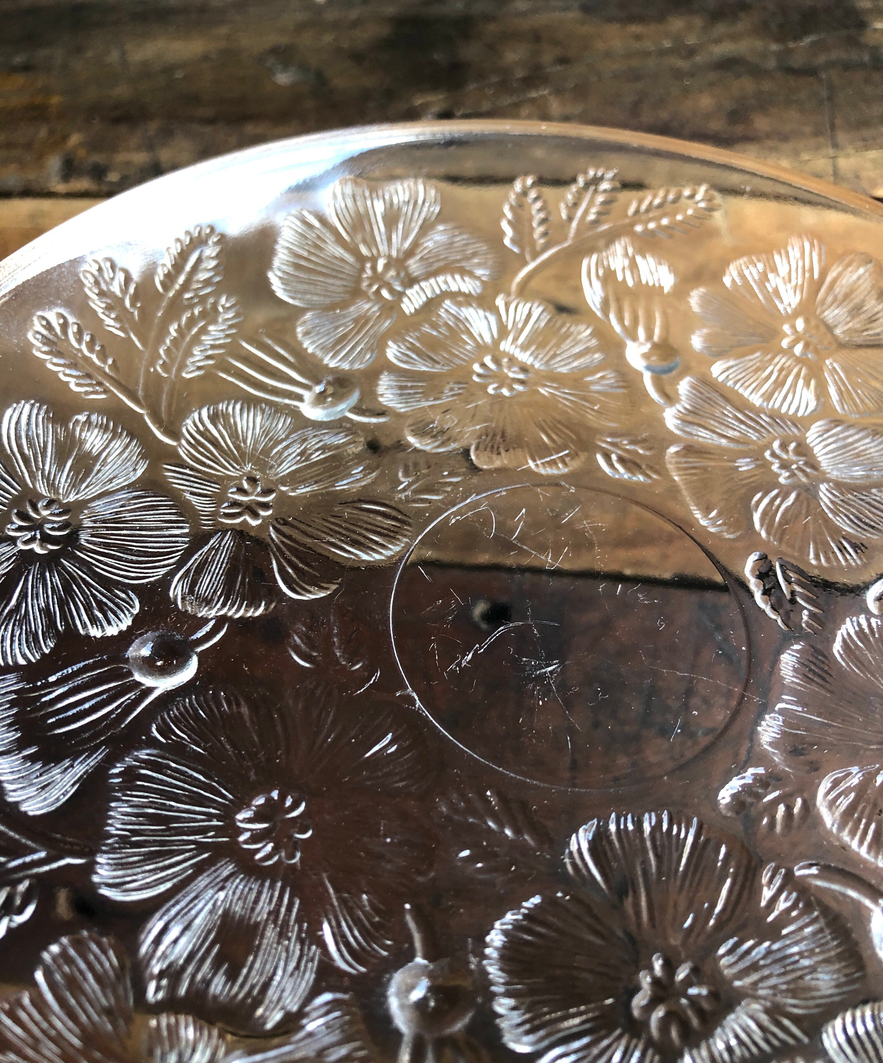 リアル度の高い美しい花々が裏面にエンボス加工(絵柄などを浮き彫りにする加工方法のこと)されています。カトラリー跡と言える細かな擦れや細キズなど(画像3,4)多少見られる箇所はありますが比較的綺麗な状態と言えます。iittala 旧ロゴシールは残っておりません。